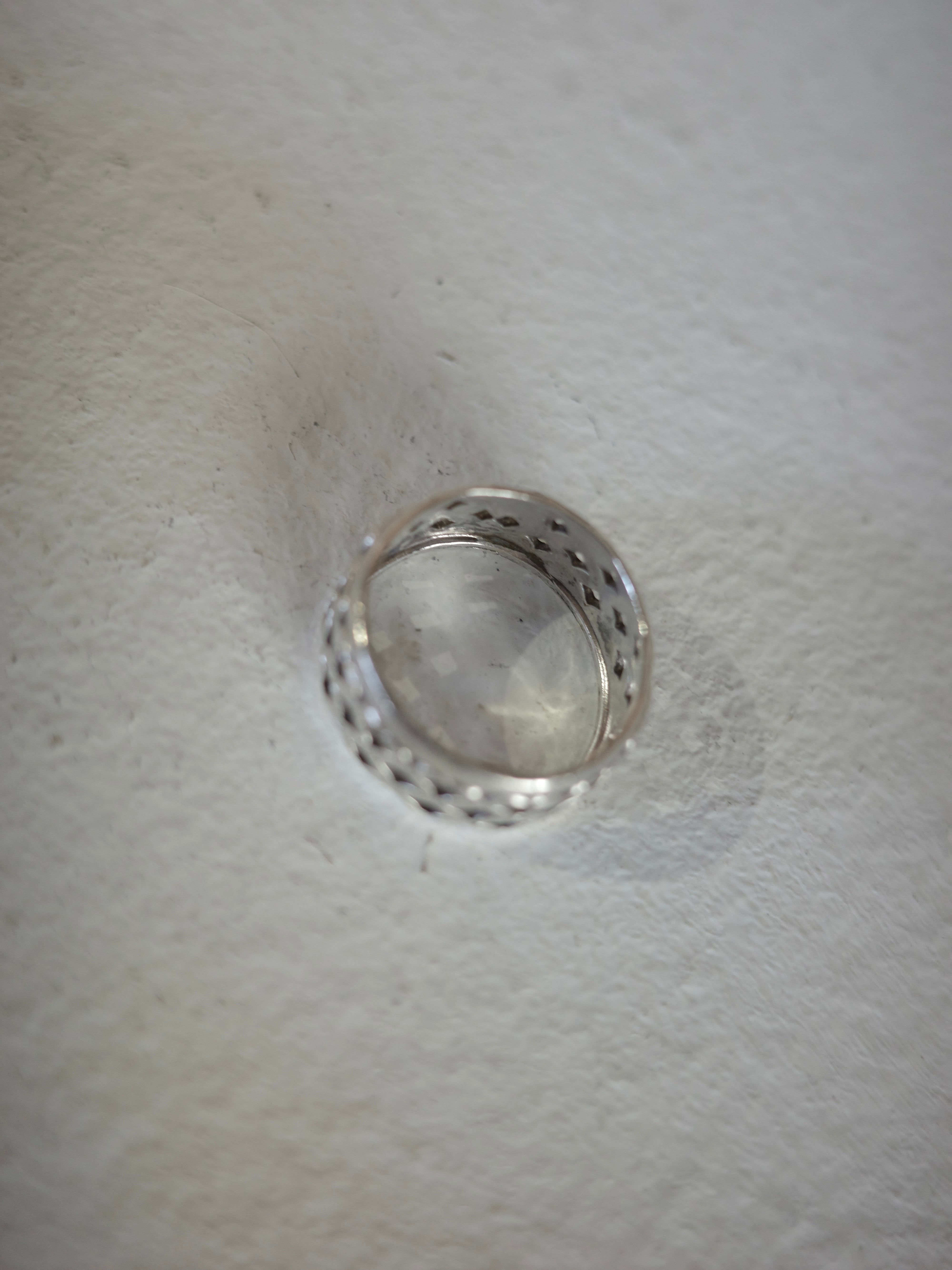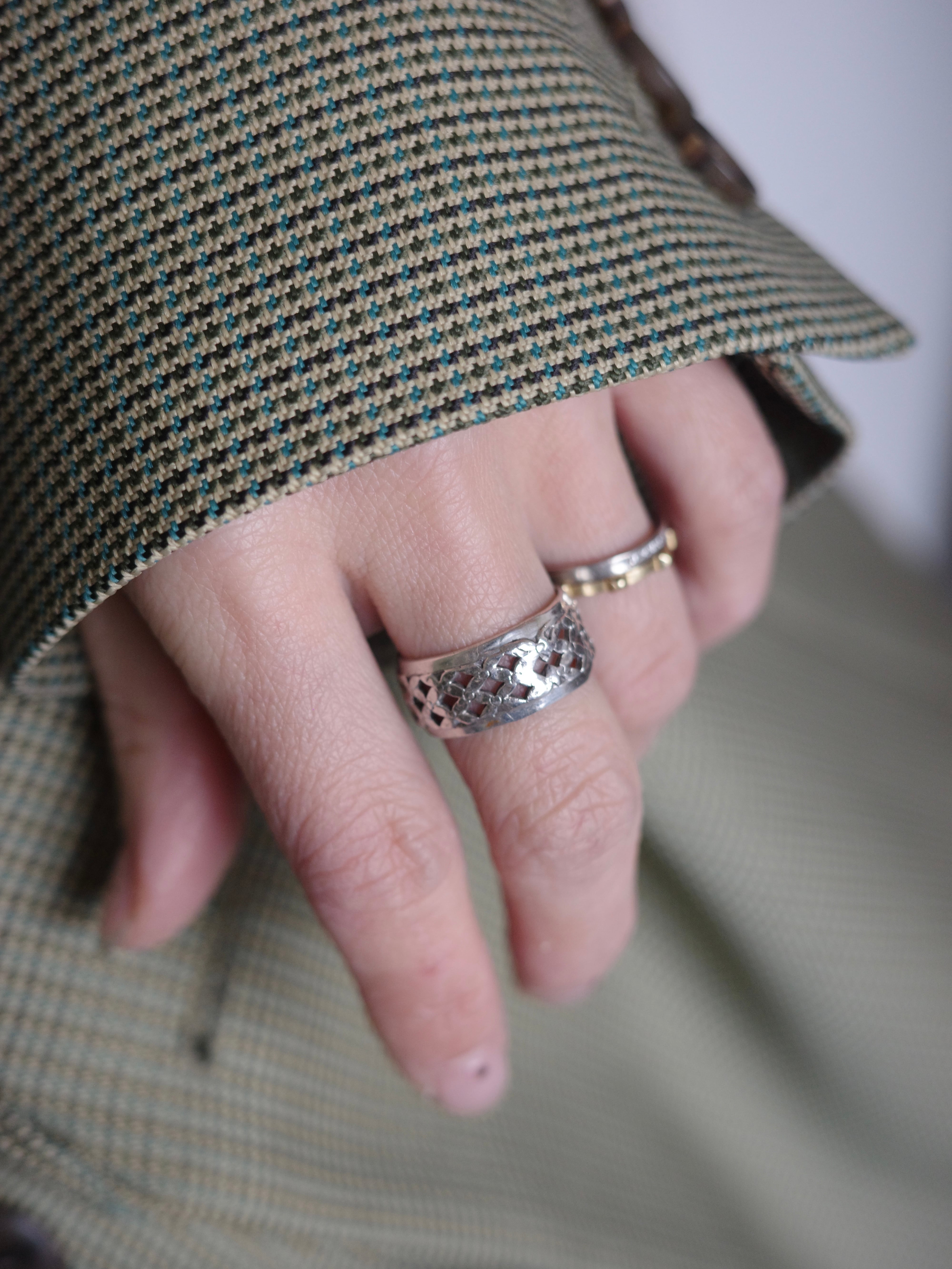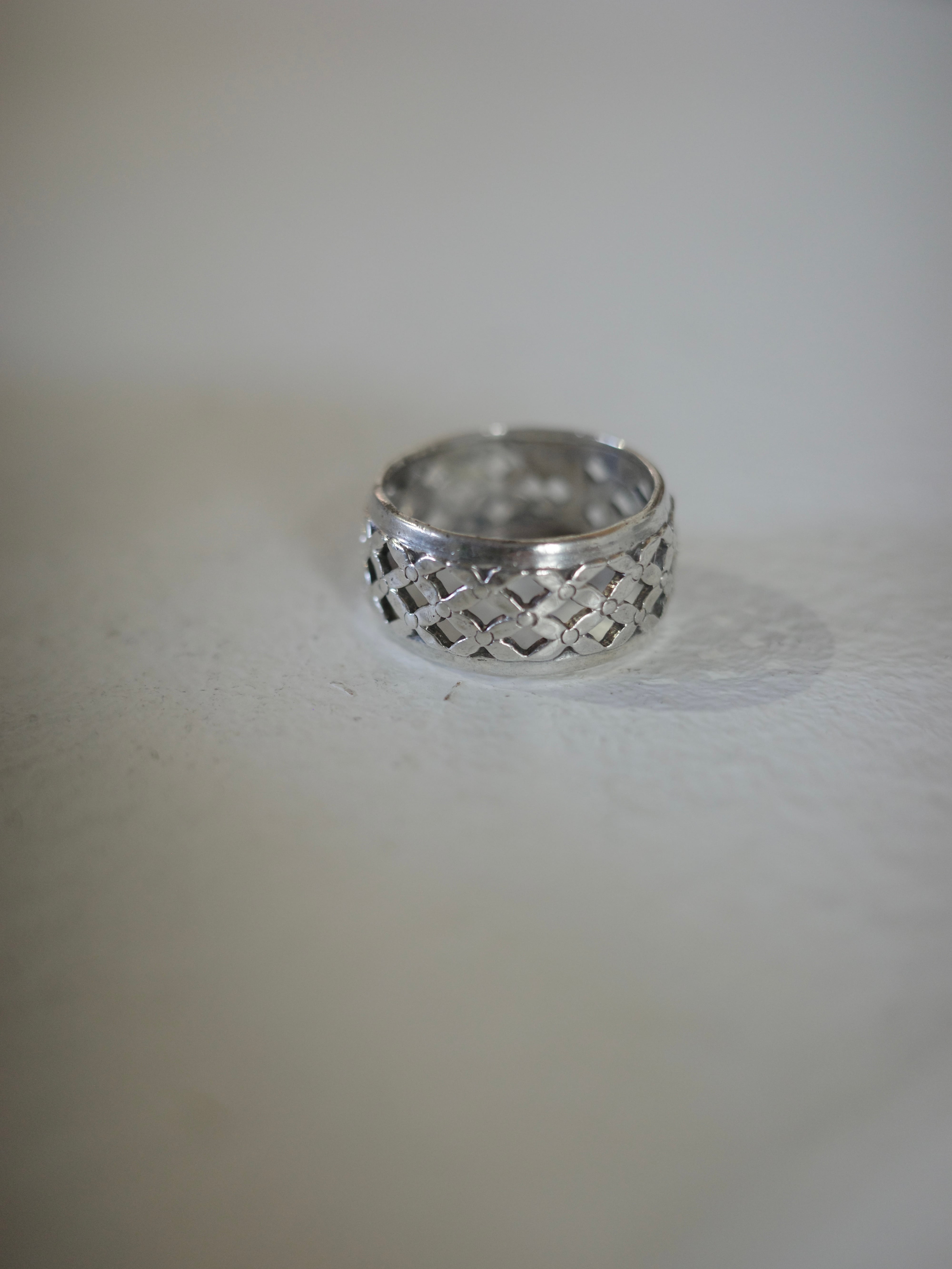 アメリカより仕入れたヴィンテージリングです。メッシュのような透け感のあるバンドリングです。幅広で程よくボリューム感がありますが、透け感とカッテイ ングの煌びやかさが上品なデザインです。