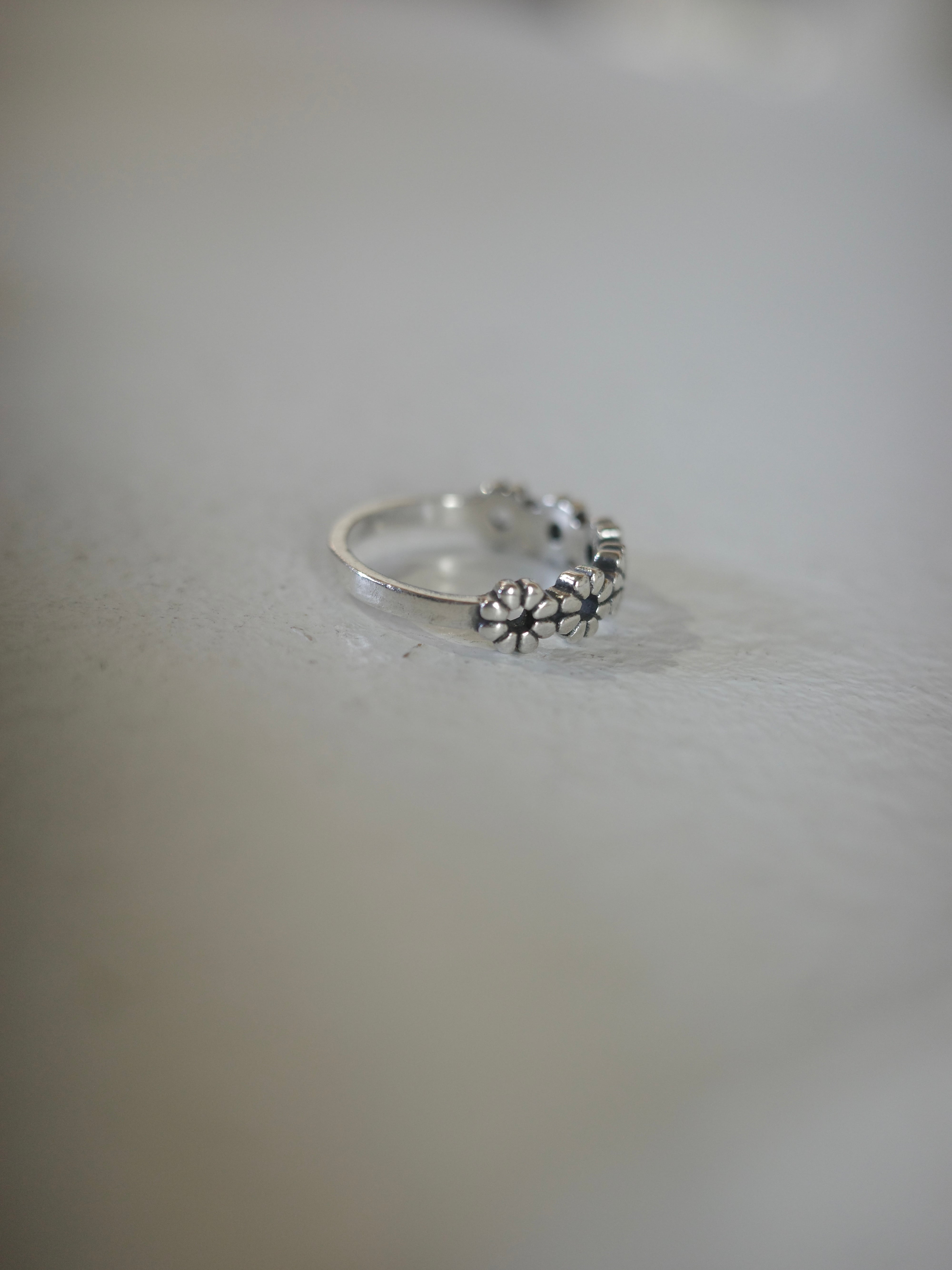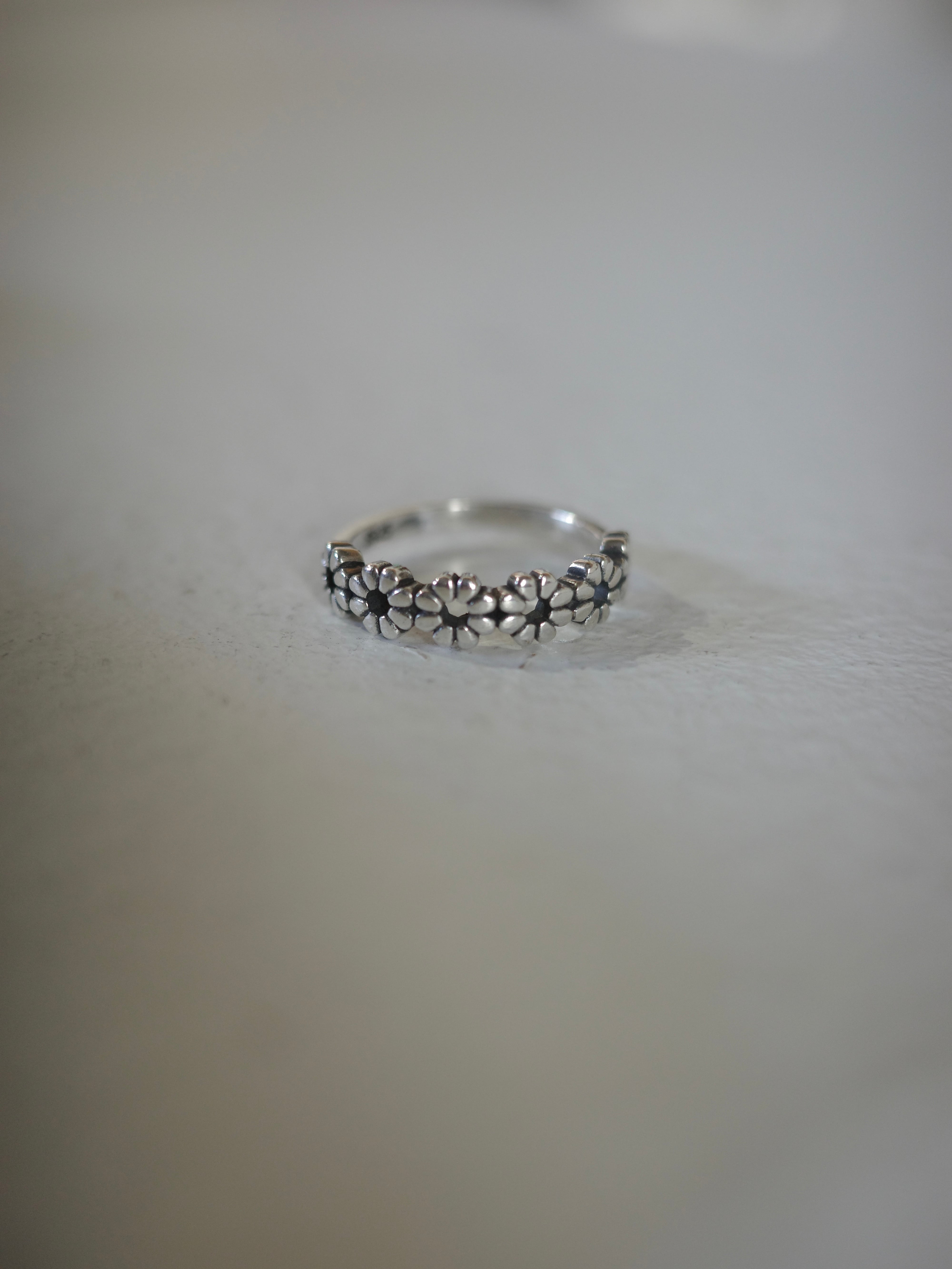 アメリカより仕入れたヴィンテージリングです。小さなお花モチーフが連なった女性らしいデザイン。ほどよいボリューム感でリングのコーディネートもしやすいです。シンプルリングとの重ね付けにもおすすめです。