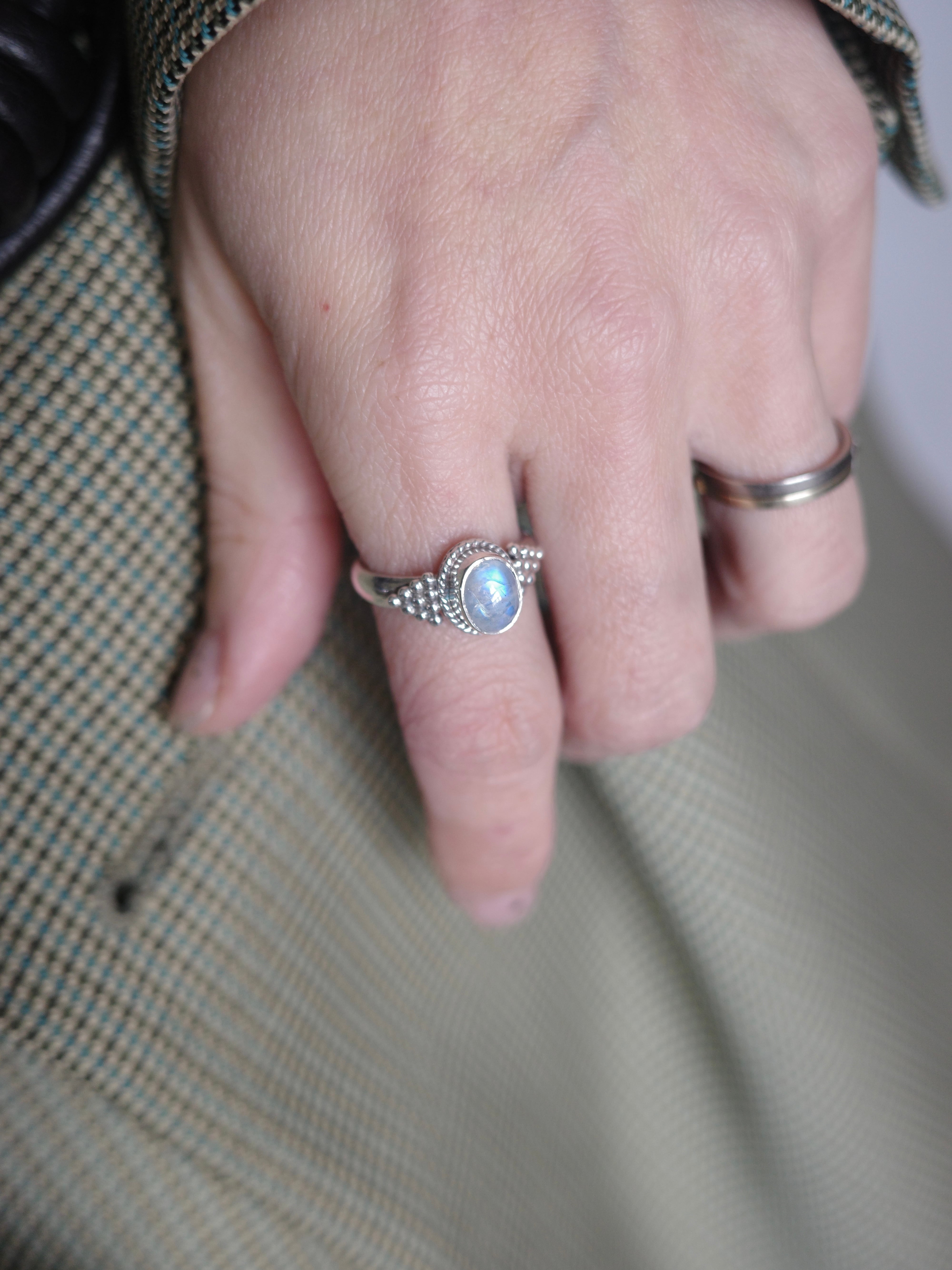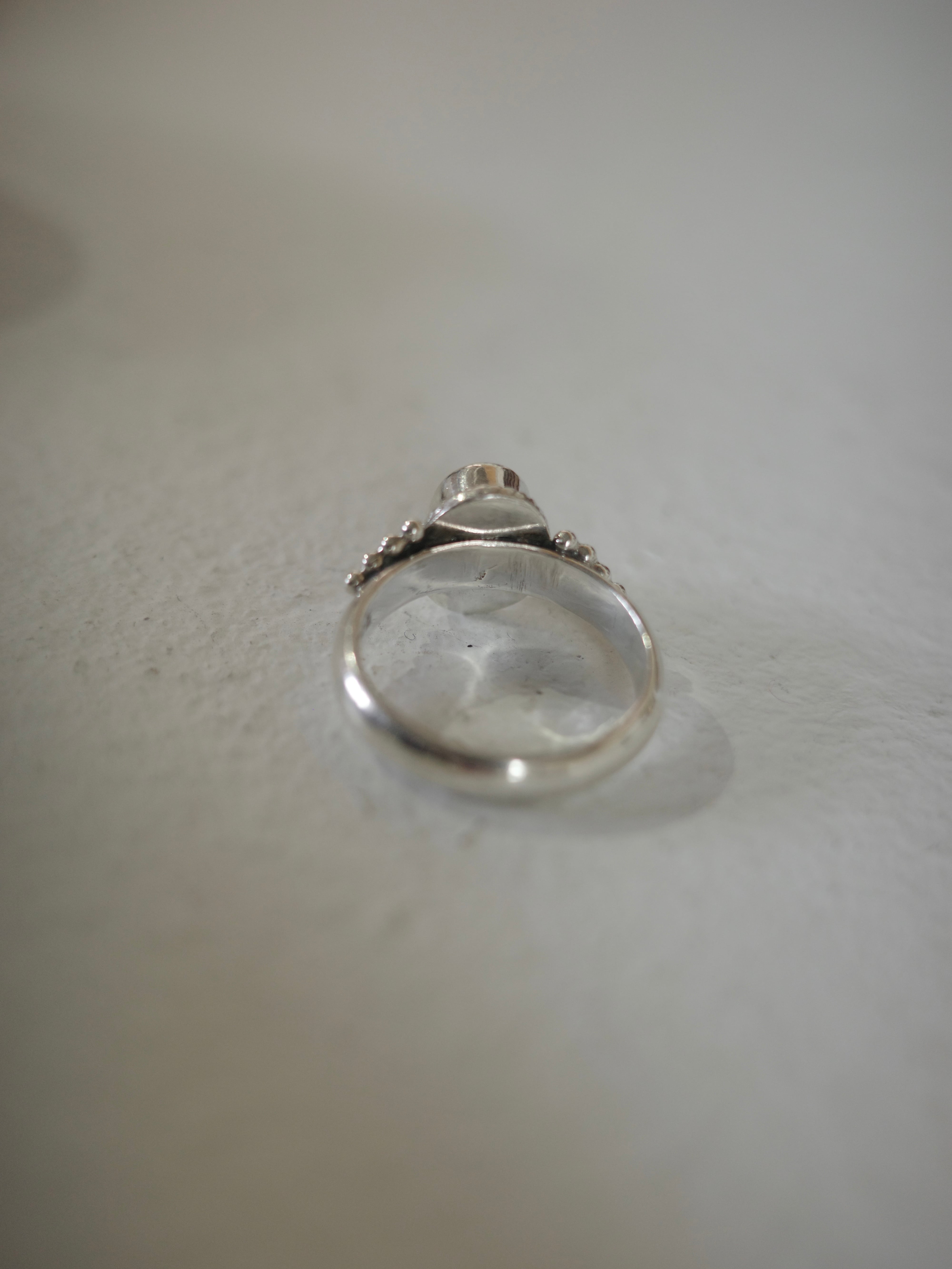 アメリカより仕入れたヴィンテージリングです。ムーンストーンの透け感のある乳白色が絶妙な色合いでとても美しいです。デコラティブな縁のデザインも華やかさをプラスしてくれます。