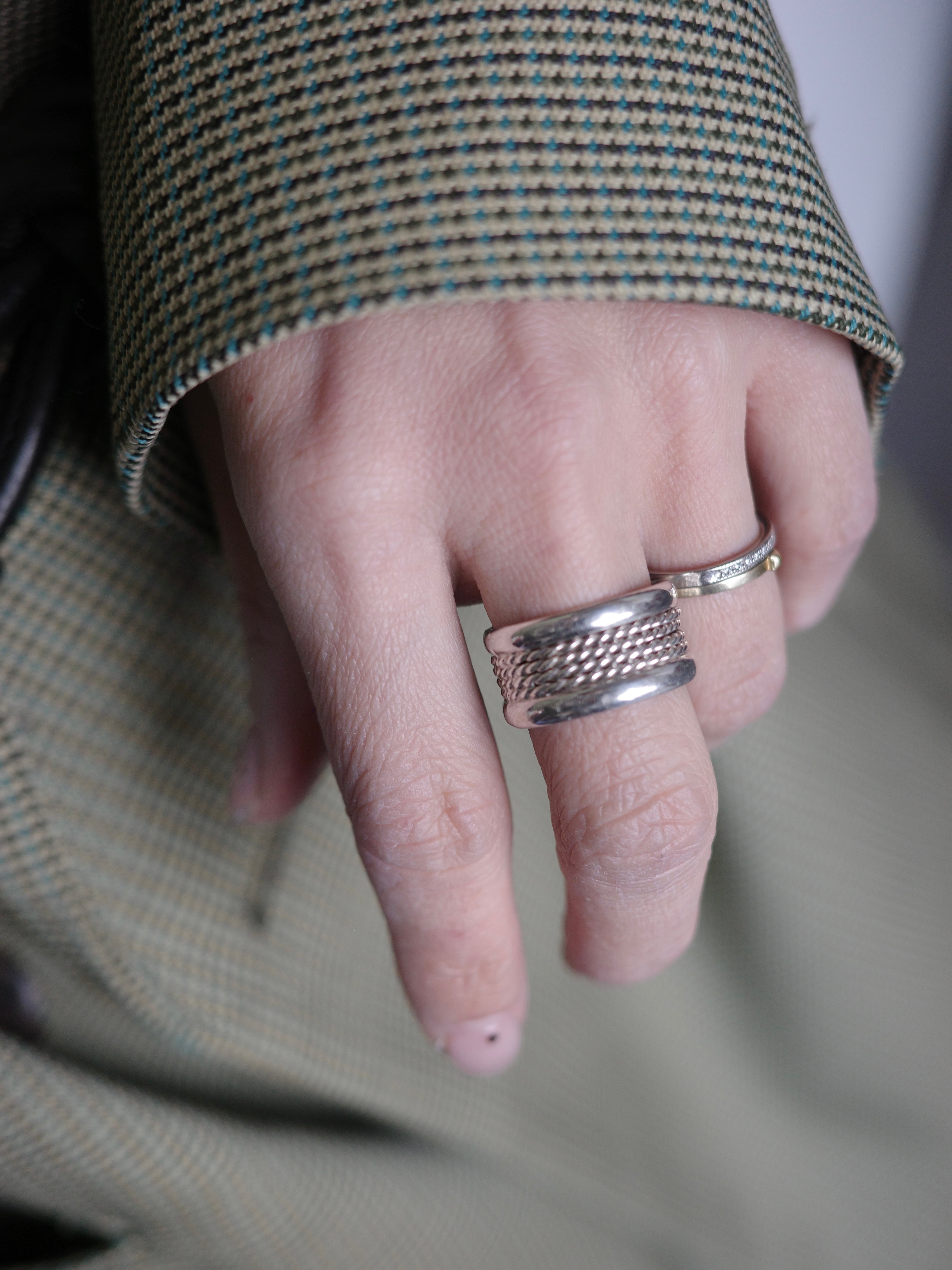 アメリカより仕入れたヴィンテージリングです。ロープのような編み模様が施されたワイドなバンドリング。幅広でボリュームはありますが、厚みがありすぎず、すっきりと着用いただけます。