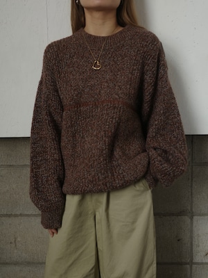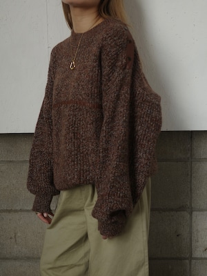 ブラウンベースのミックスカラーが可愛いニットです。胸のラインと肩のボタンがレザー仕様になっているところがポイントです。タッポリとした丸みのあるシルエットも素敵です。