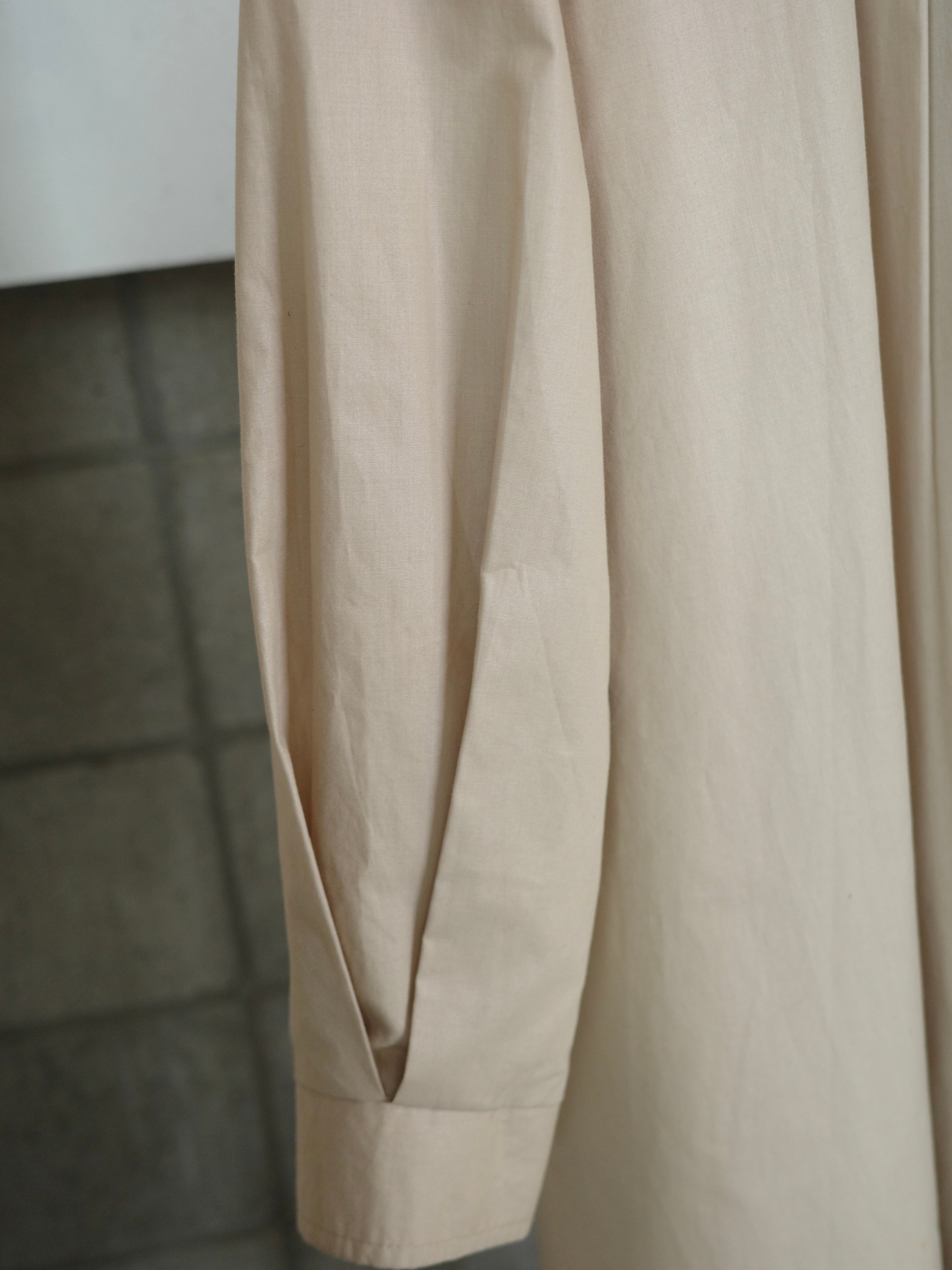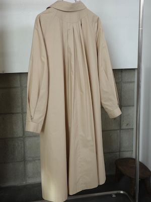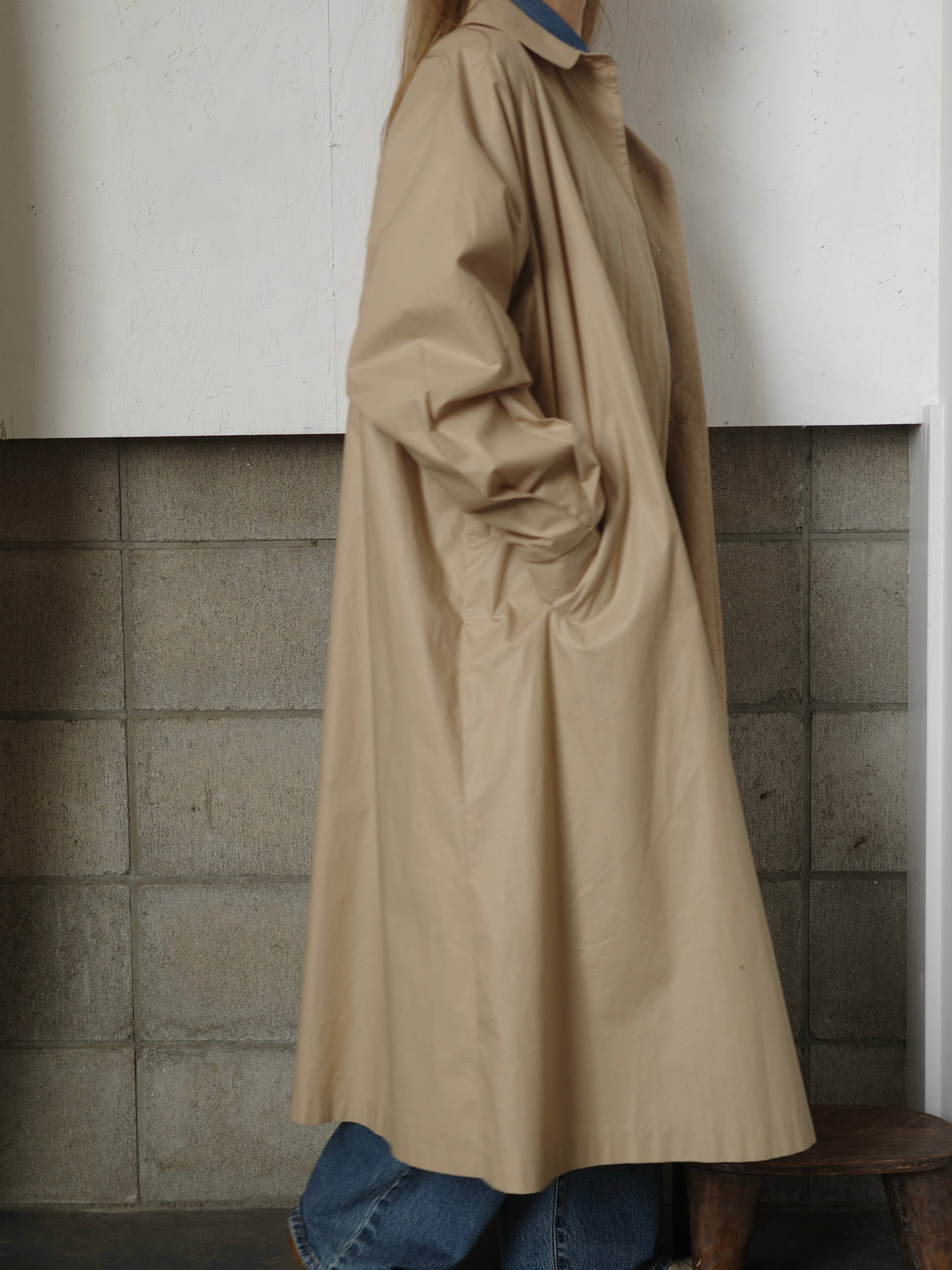 さらっとした生地感のテントコートです。Aラインで足長効果抜群なシルエット。後ろにたっぷりとギャザーが入っていて、歩くたびにふわりと裾が広がるところもとてもカッコ良いです。下梅コートですが裏地もついていて、インナー次第で長い時期着用いただけます。