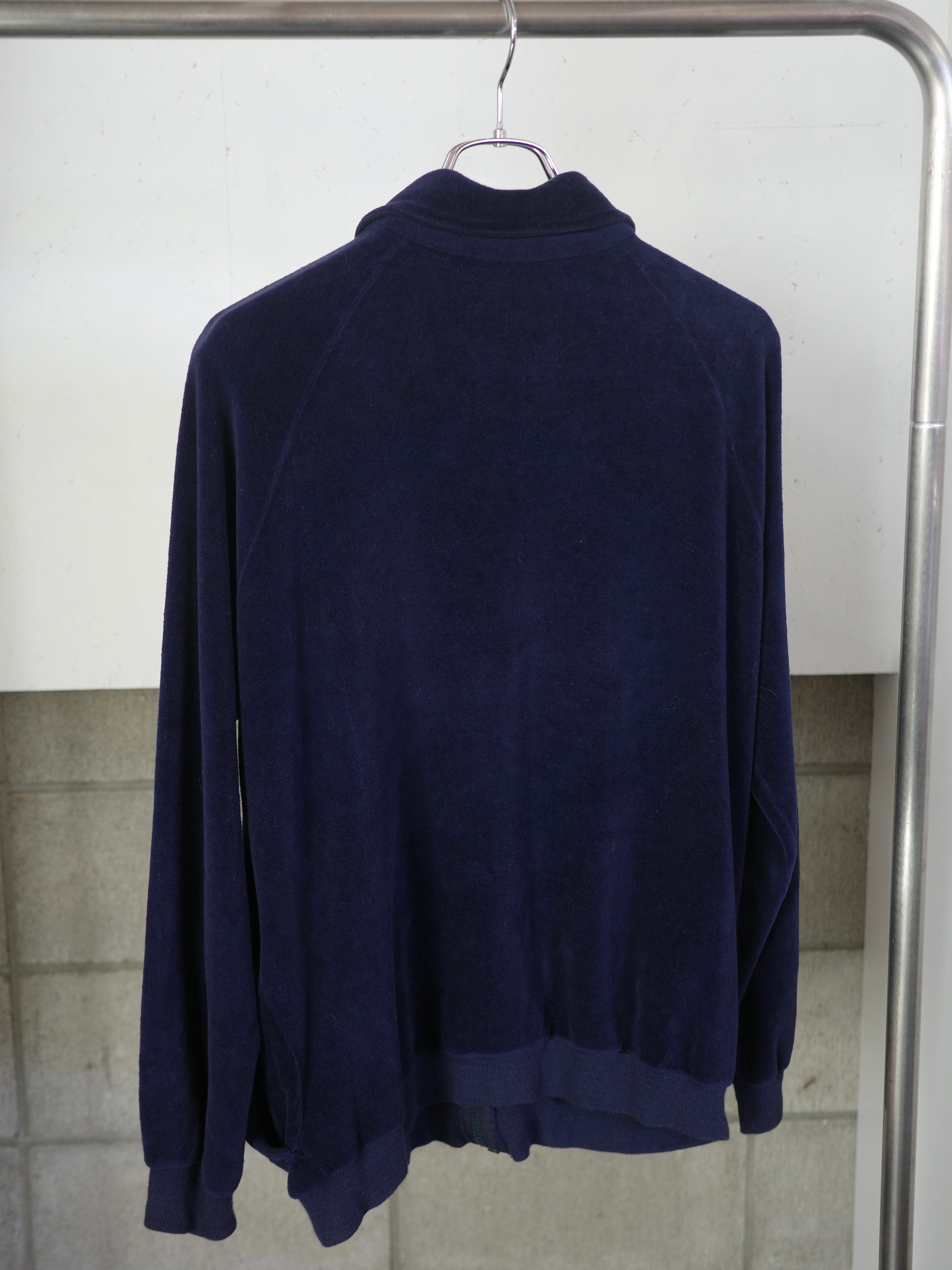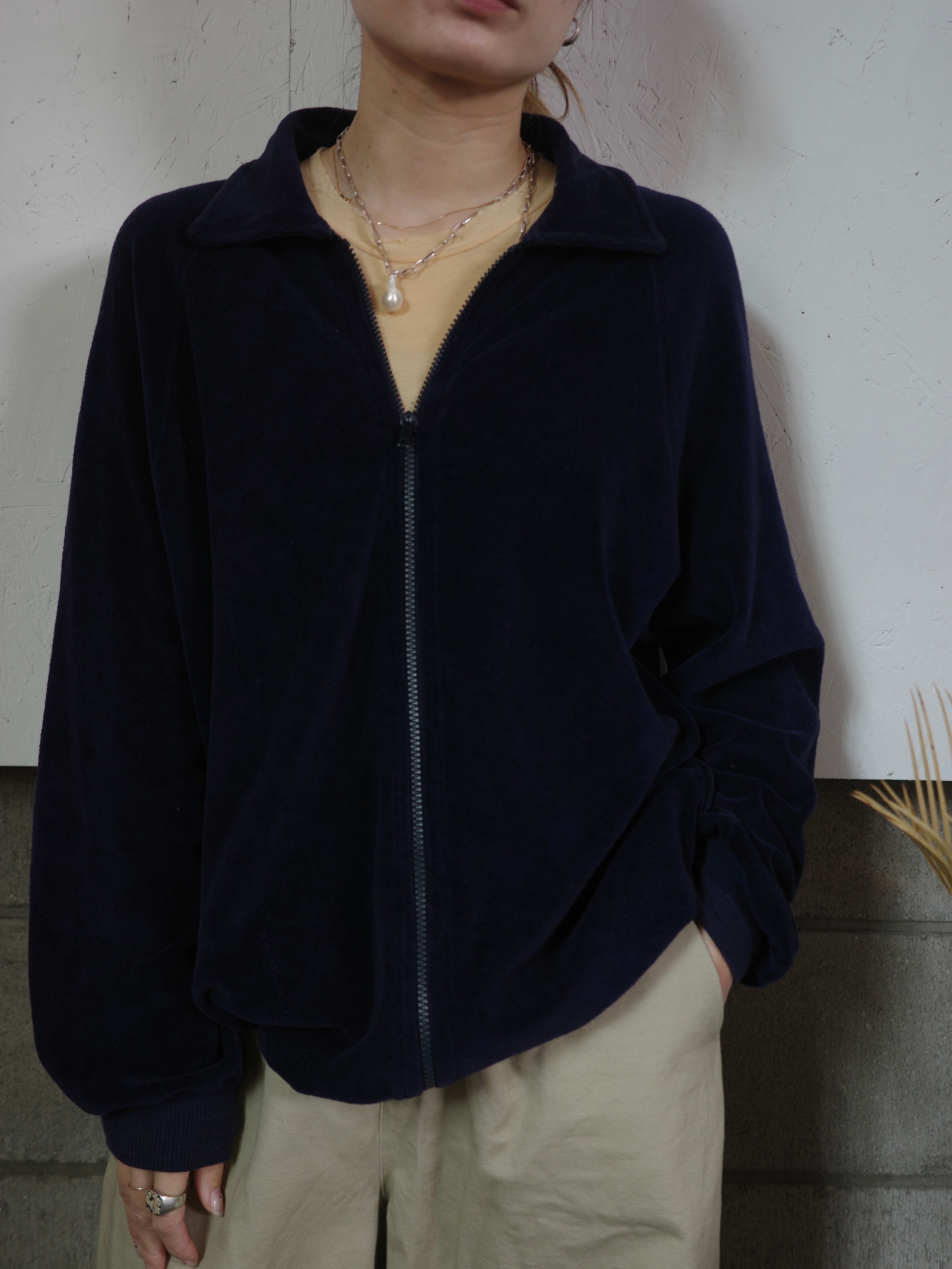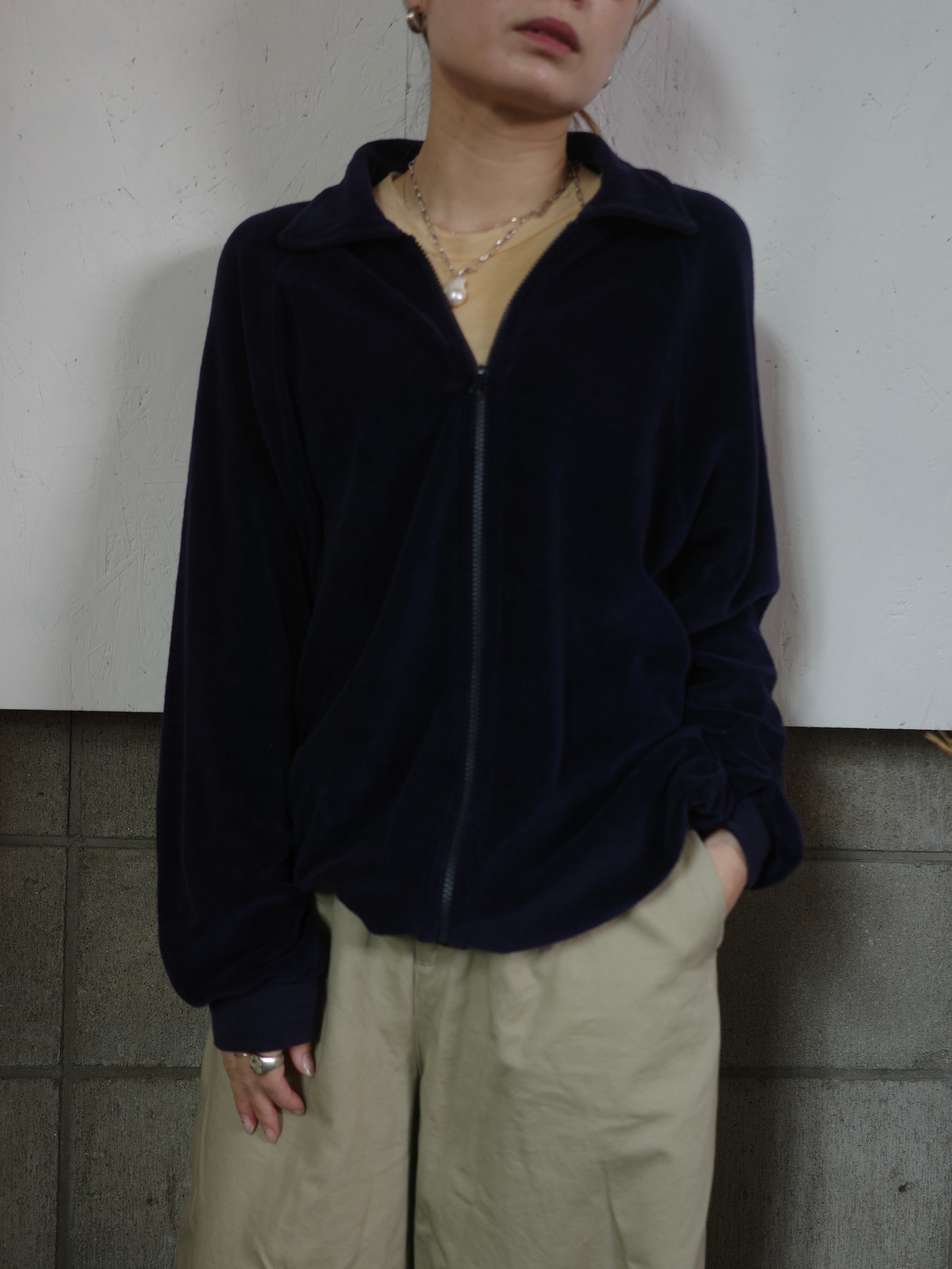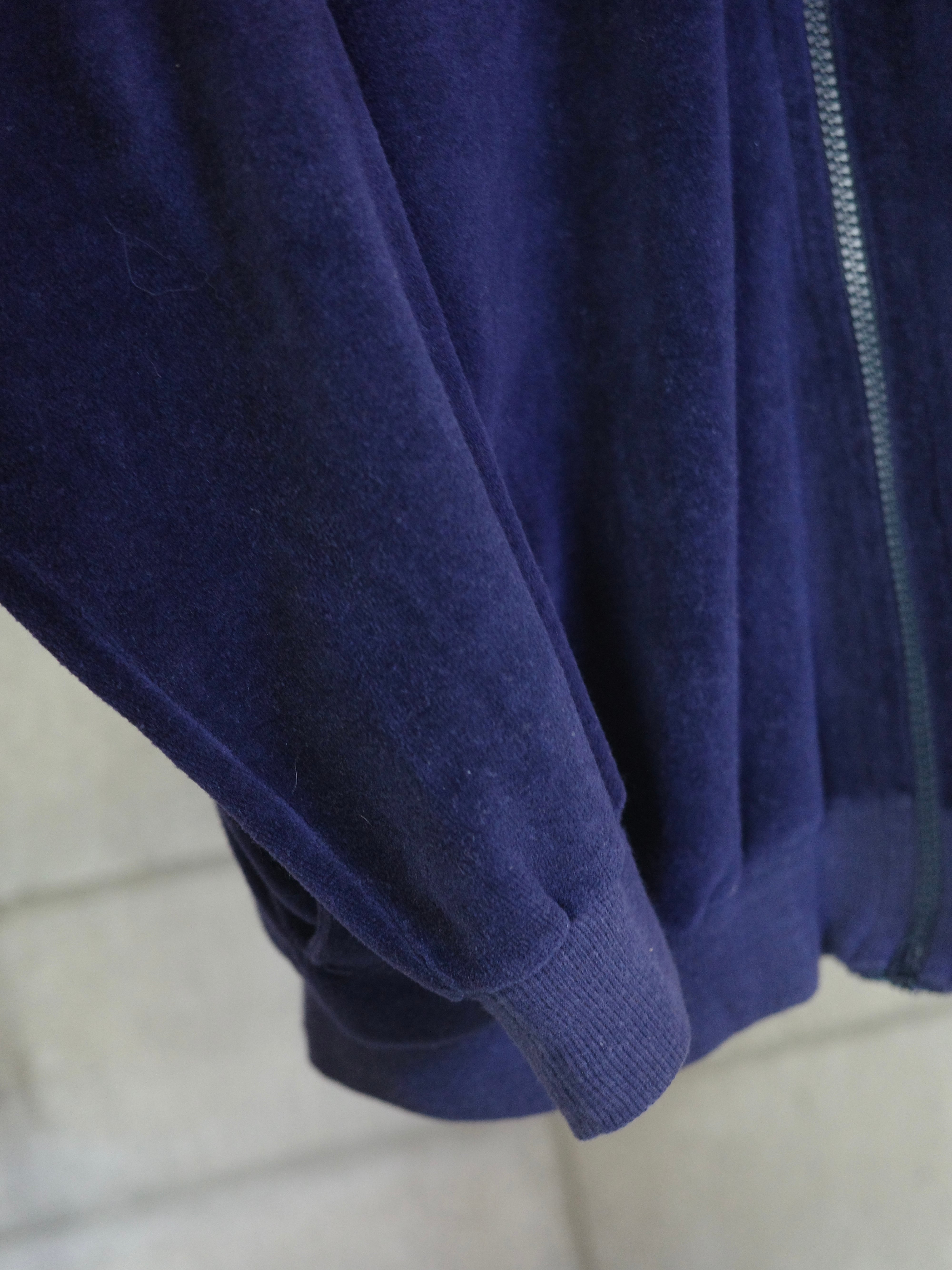 ゆったりサイズでジャージのような形ですがネイビーのベロア素材なので上品に着ていただけます。ポケットもサイドのラインの延長に付けられており、目立ちすぎずとも機能的にお使いいただけます。羽織としてもトップスとしても幅広く着用いただけます。