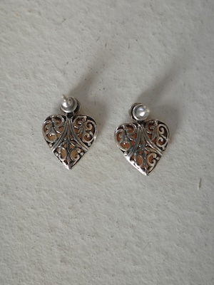 アメリカより仕入れたヴィンテージんピアスです。珍しいピンクカラーのマザーオプパールがハートモチーフになっています。ピアスのトップ部分のデザインはゴシック調のデザインになっていて、甘めなハートモチーフとのバランスがとっても素敵です。ハートモチーフはトリアずしが可能で、小さなピアスだけでも2wayでお使いいただけます。