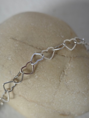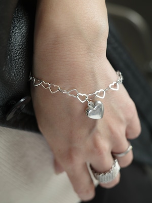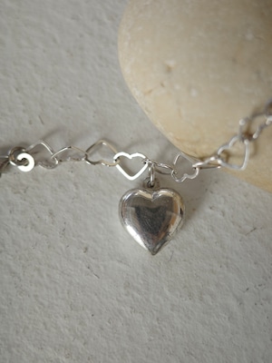 アメリカより仕入れたヴィンテージブレスレットです。ハートがリンクしたチェーンに、ぷっくりとしたハートチャームもついたハートづくしのブレスレットです。立体感のあるデザインで手元のアクセントになります。