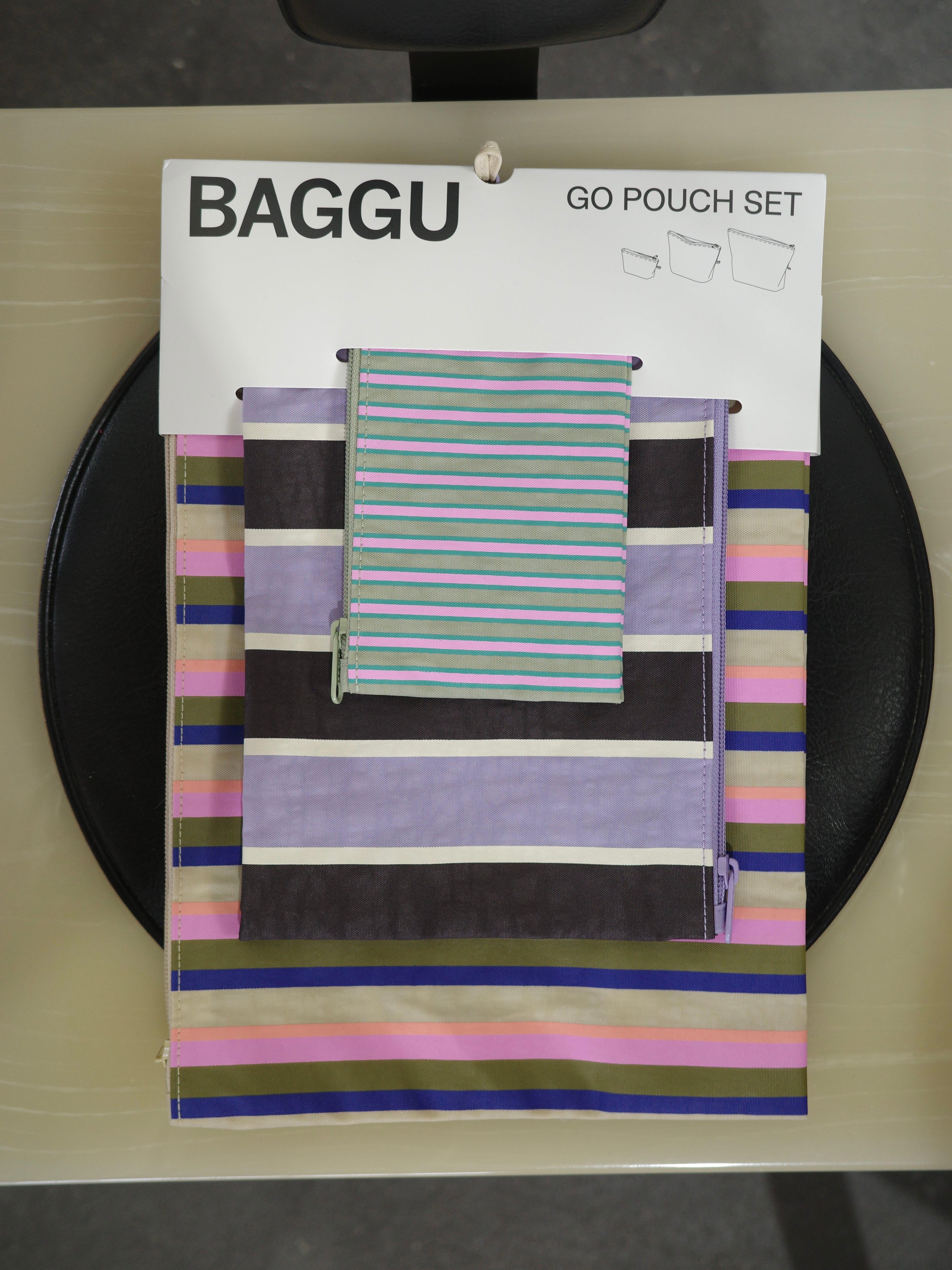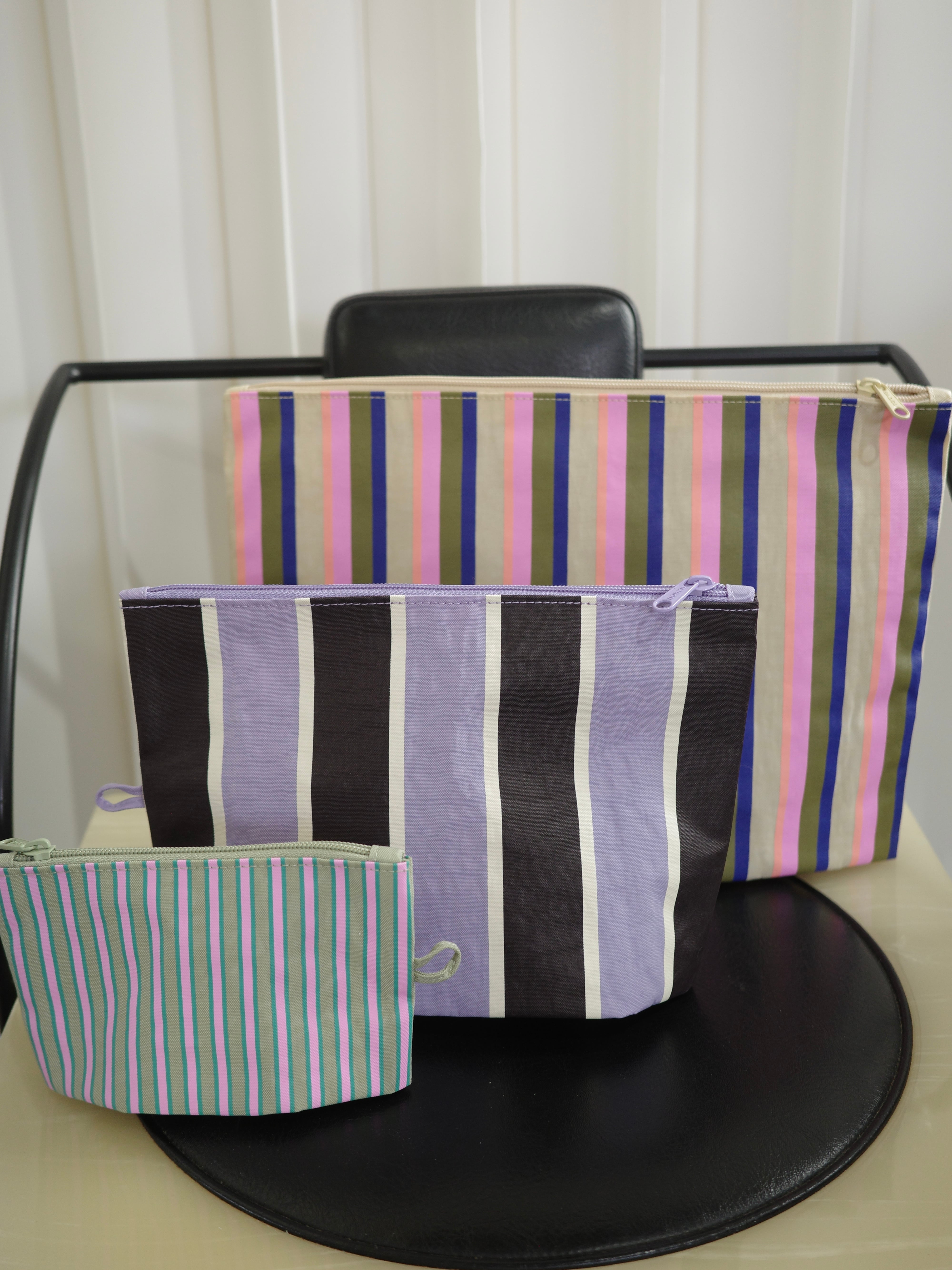 S,M,Lサイズの3つのジップポーチセットです。 マチ付きのポーチは平らにしたり広げたりして、用途によって使い分けられます。