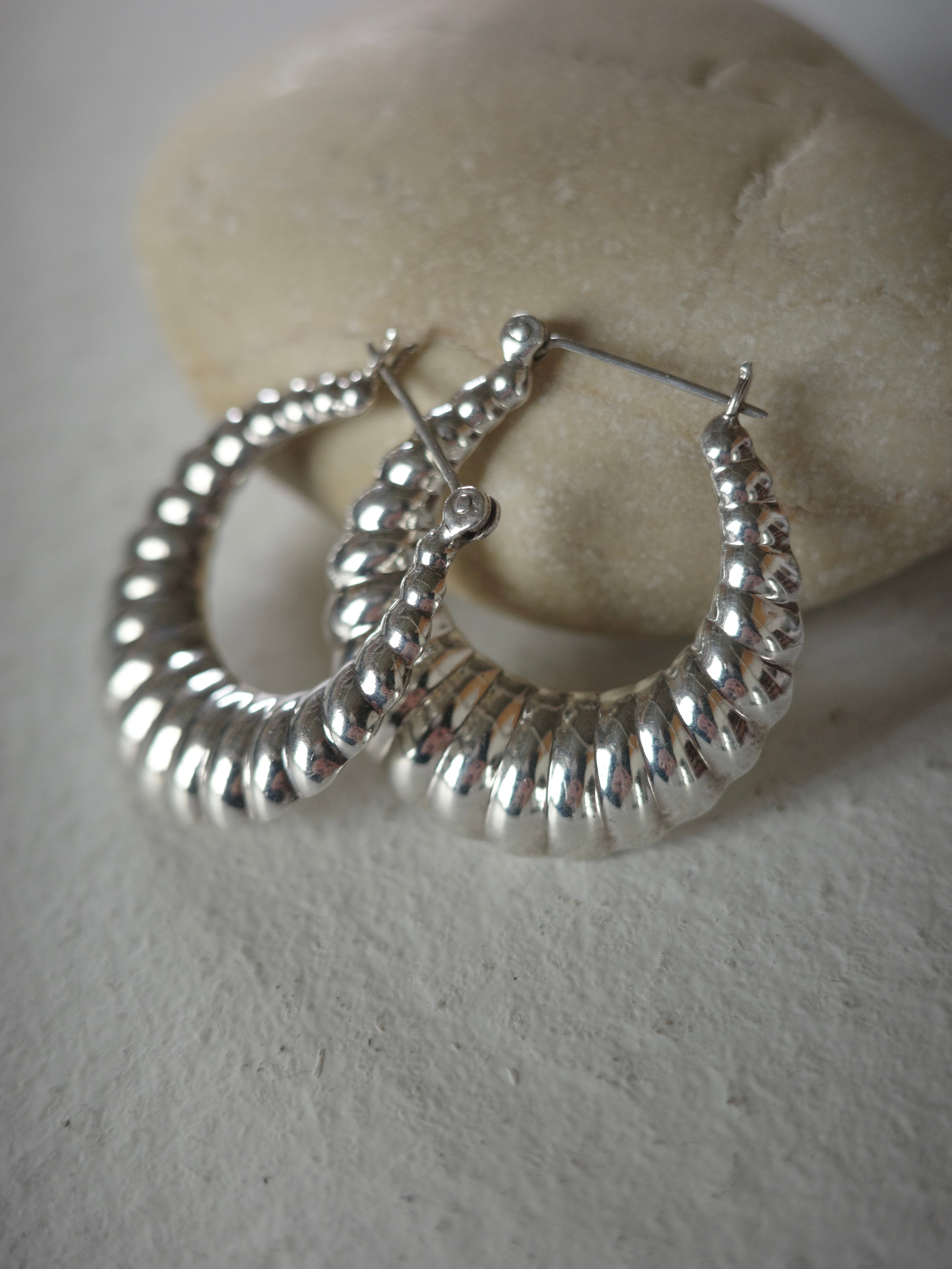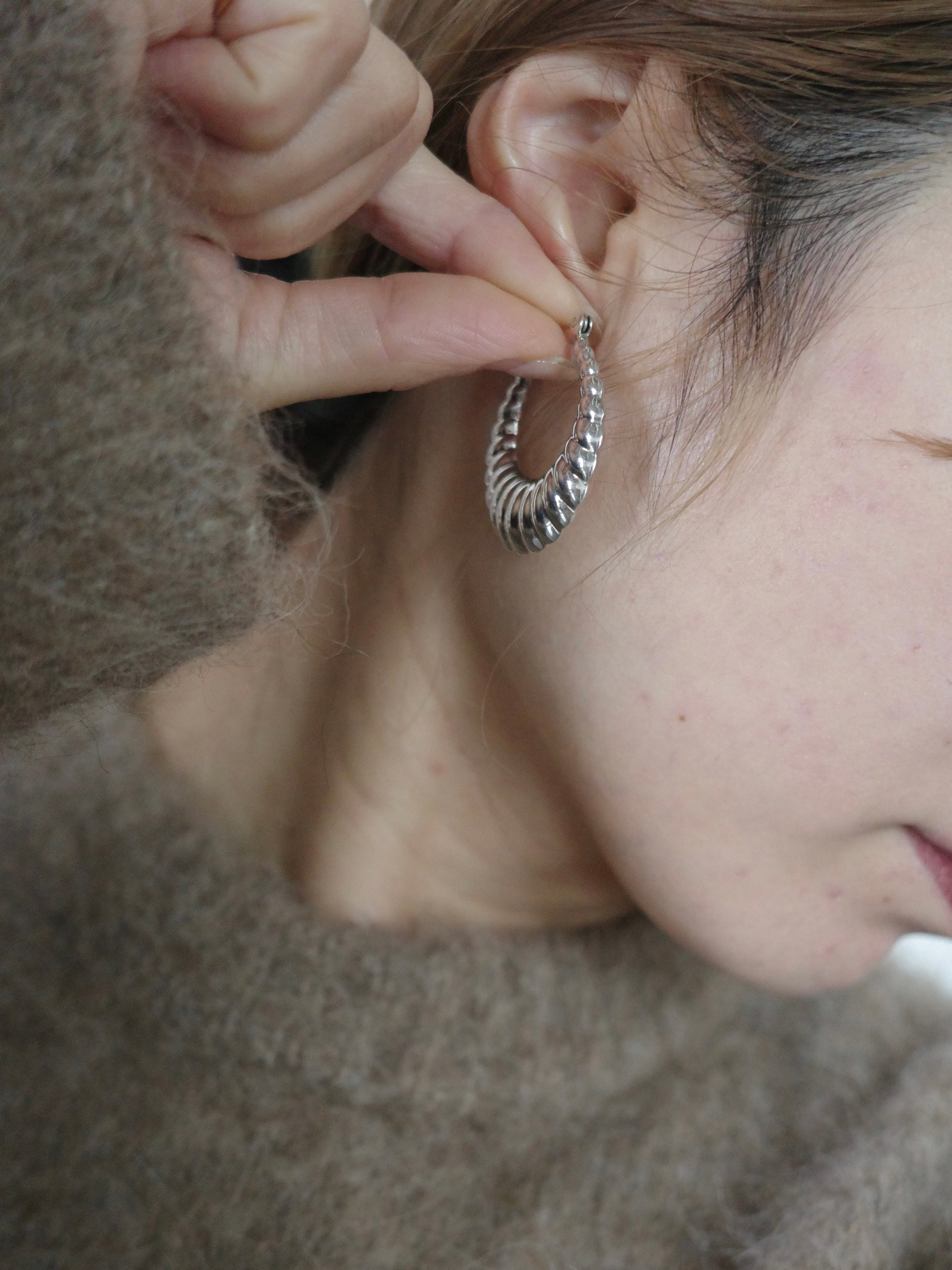 アメリカより仕入れたヴィンテージピアスです。定番で人気なリブデザインの大きめフープ。存在感抜群ですが、中空なので軽くて着用しやすいです。