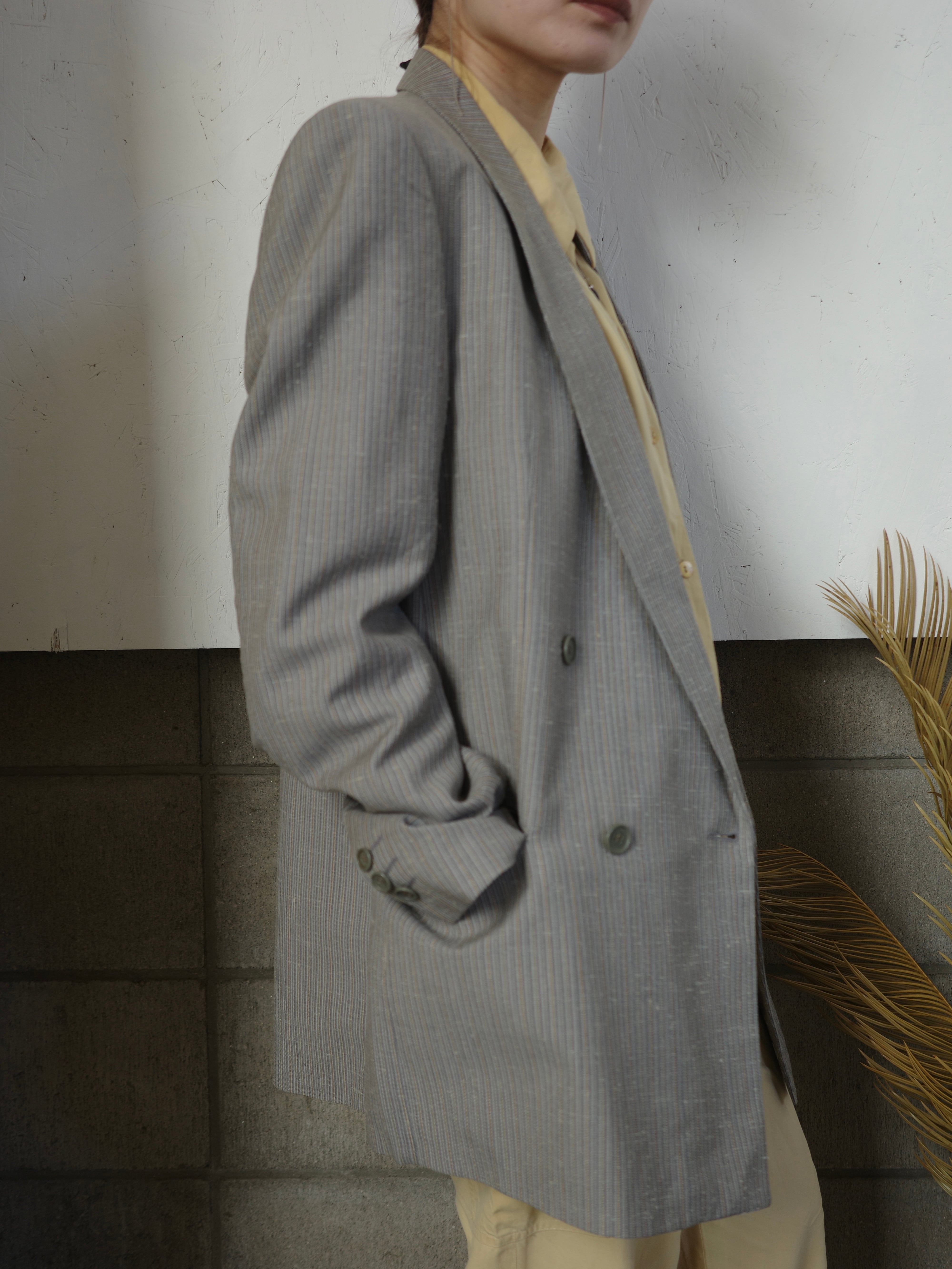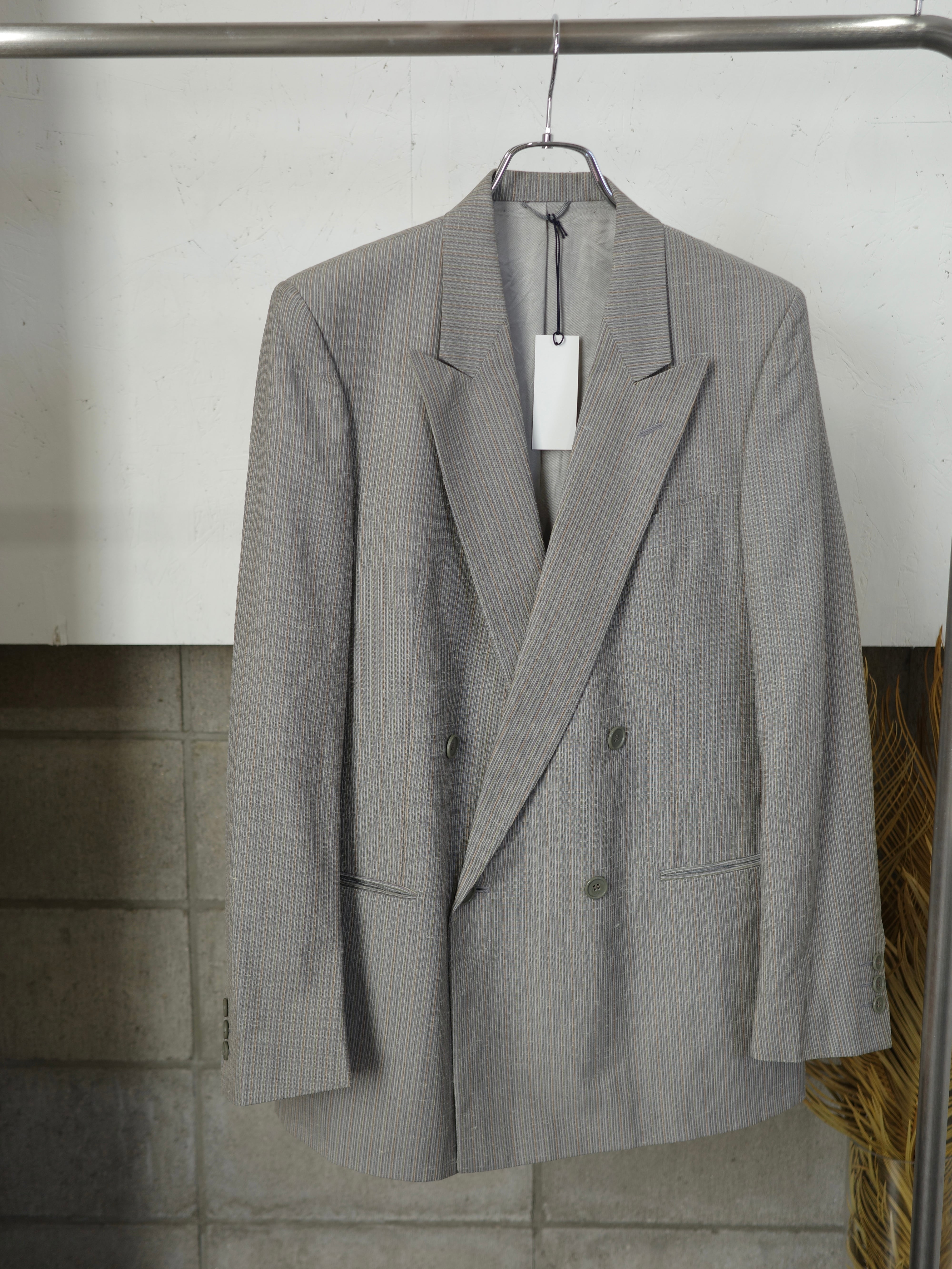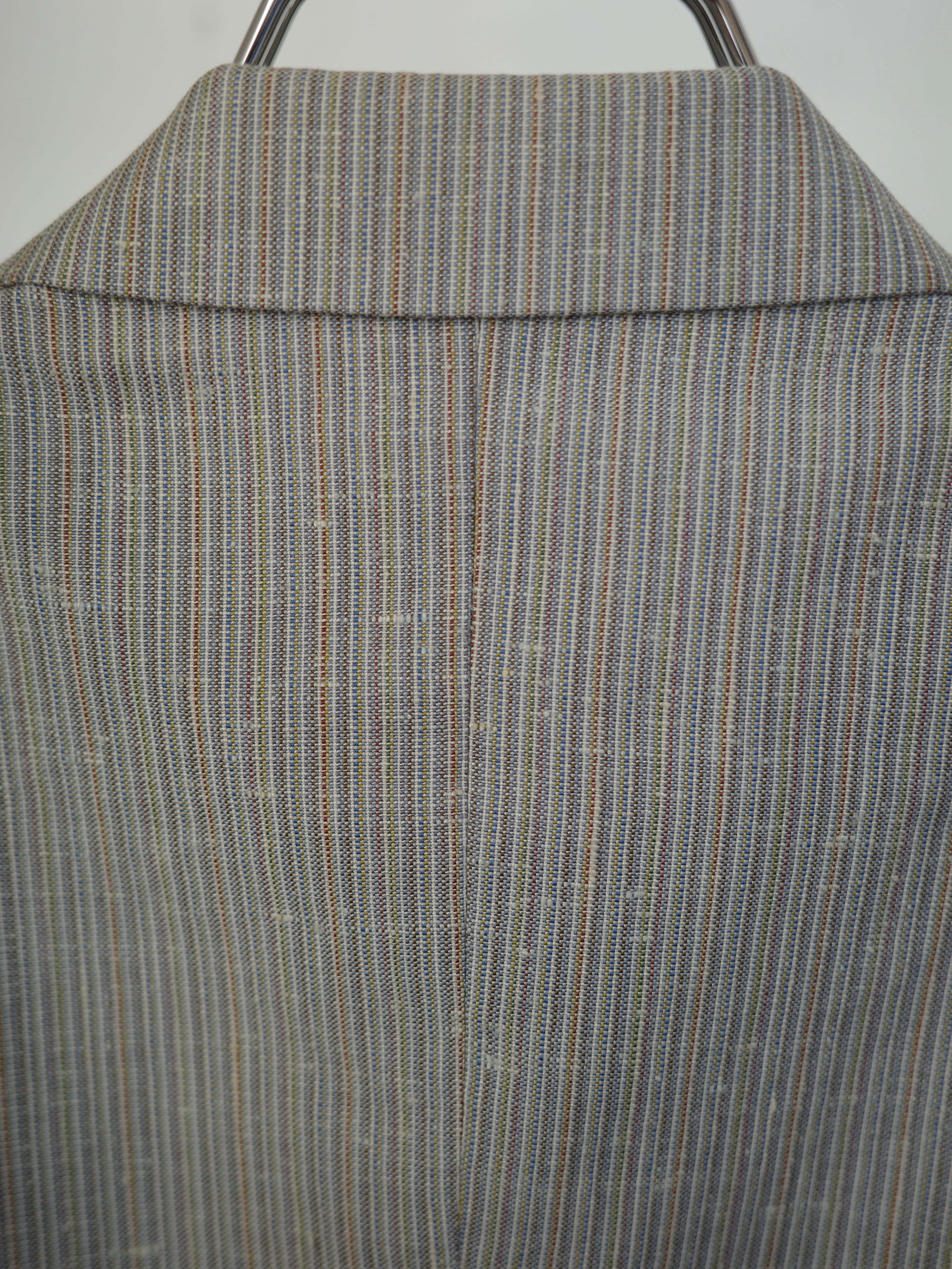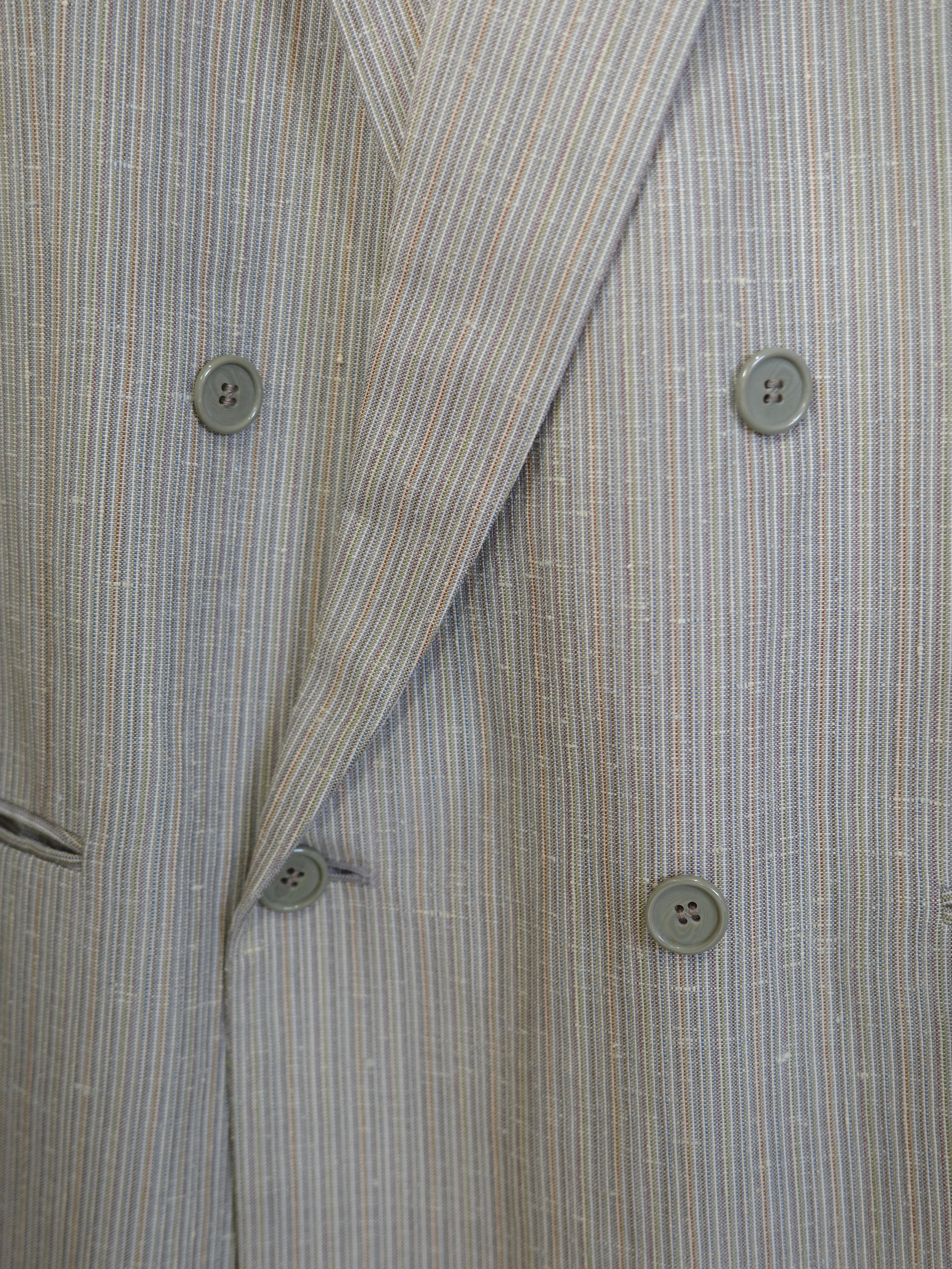 イタリア製のダブルジャケットです。ボックス型のシルエットがとっても美しく、程よくオーバーサイズに着用いただけます。グレーベージュのようなベースカラーですが、ストライプにはさりげなくグリーン、オレンジ、ブルーなどの色が入っていて、珍しい生地や色合いががとってもカッコ良いです。薄手なので、春や秋に活躍するアイテムです。