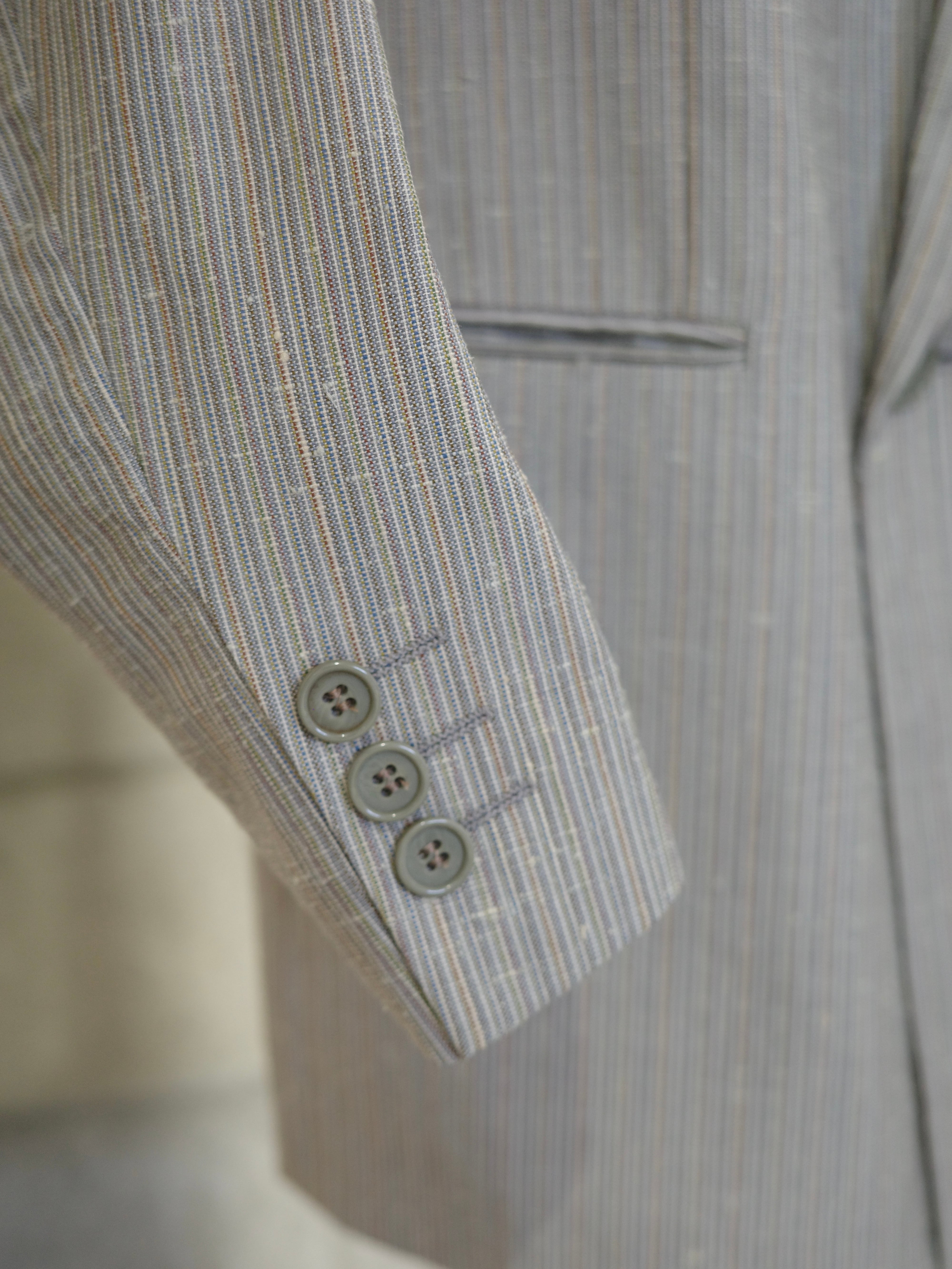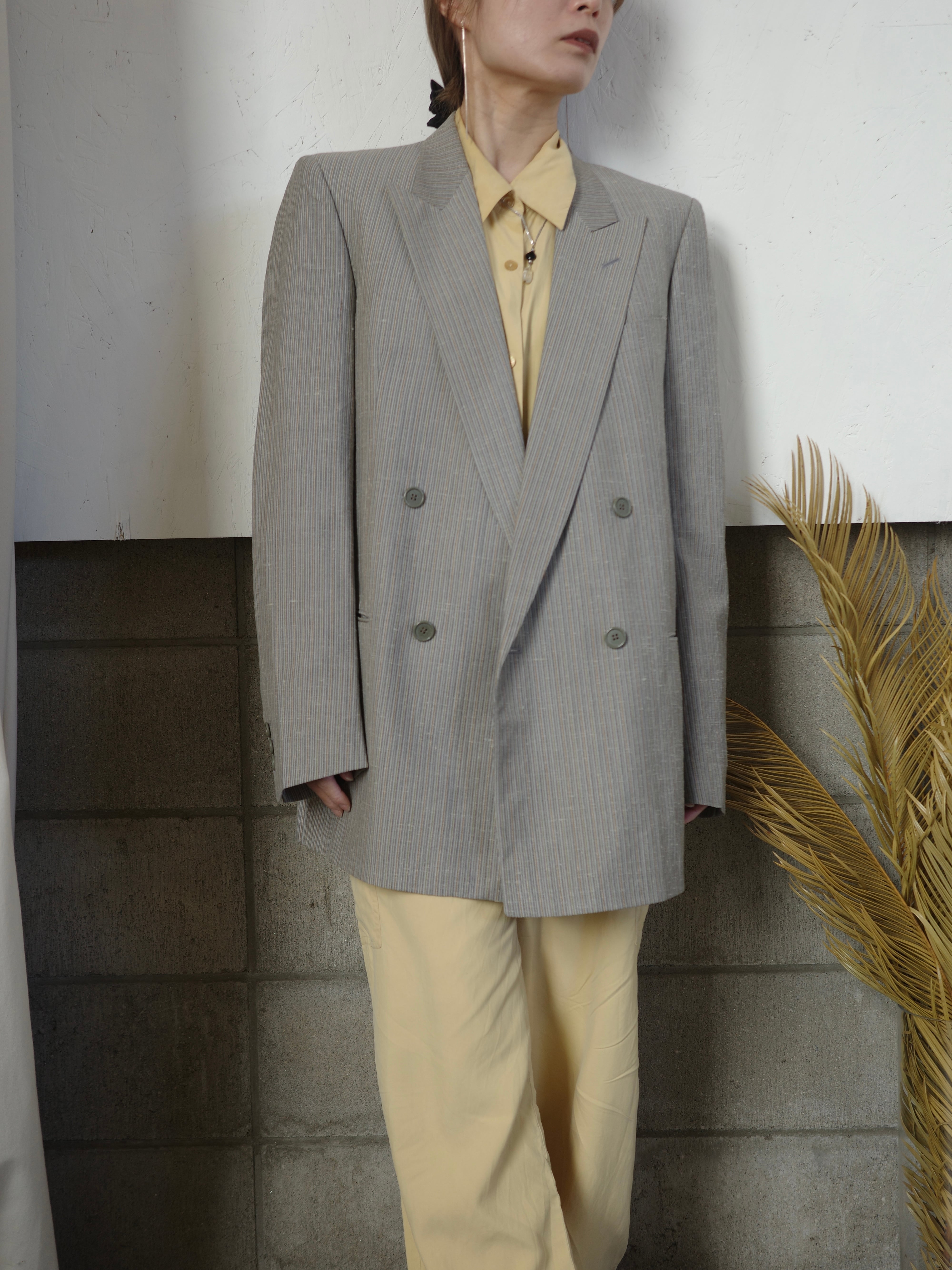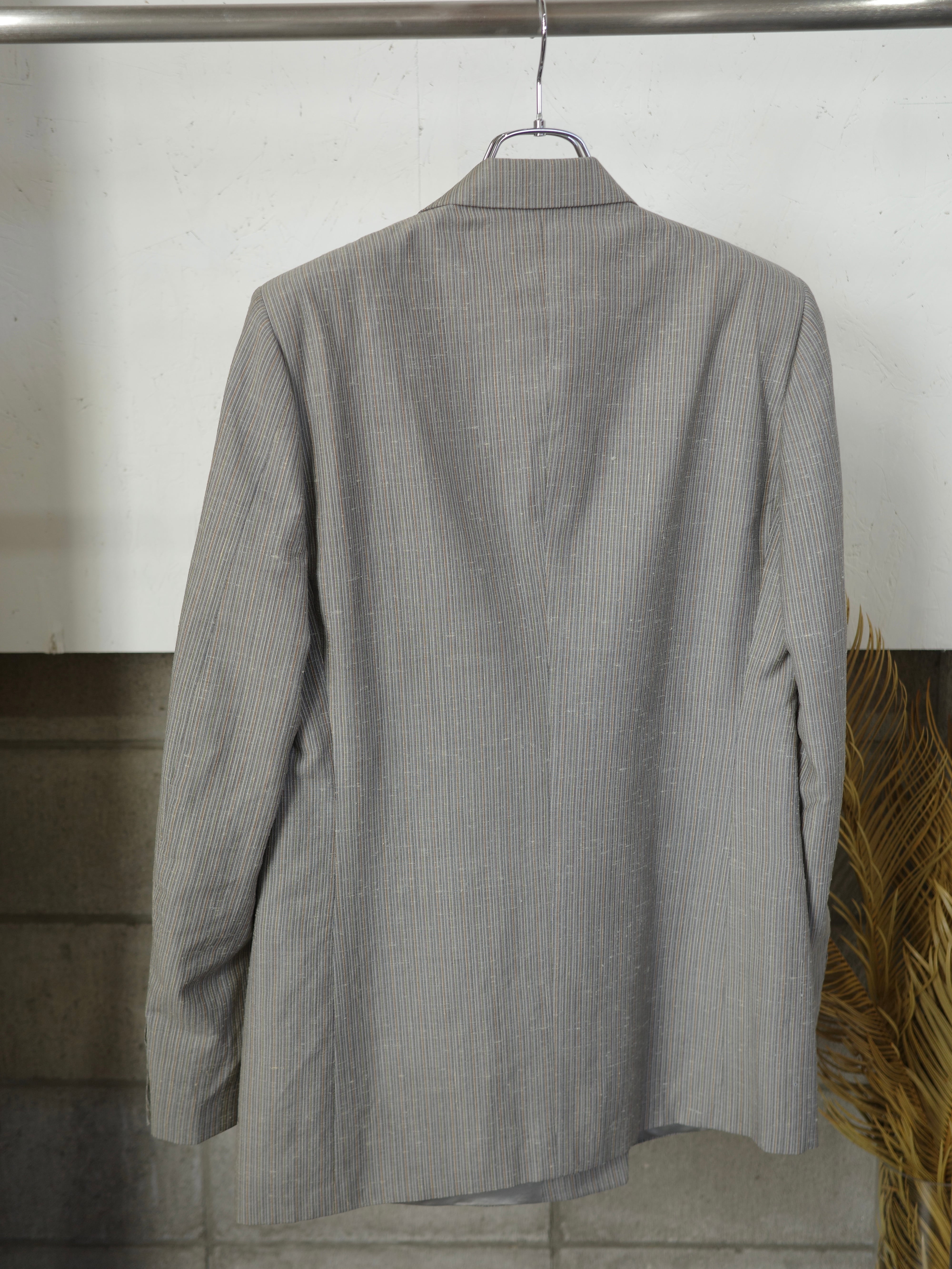 イタリア製のダブルジャケットです。ボックス型のシルエットがとっても美しく、程よくオーバーサイズに着用いただけます。グレーベージュのようなベースカラーですが、ストライプにはさりげなくグリーン、オレンジ、ブルーなどの色が入っていて、珍しい生地や色合いががとってもカッコ良いです。薄手なので、春や秋に活躍するアイテムです。