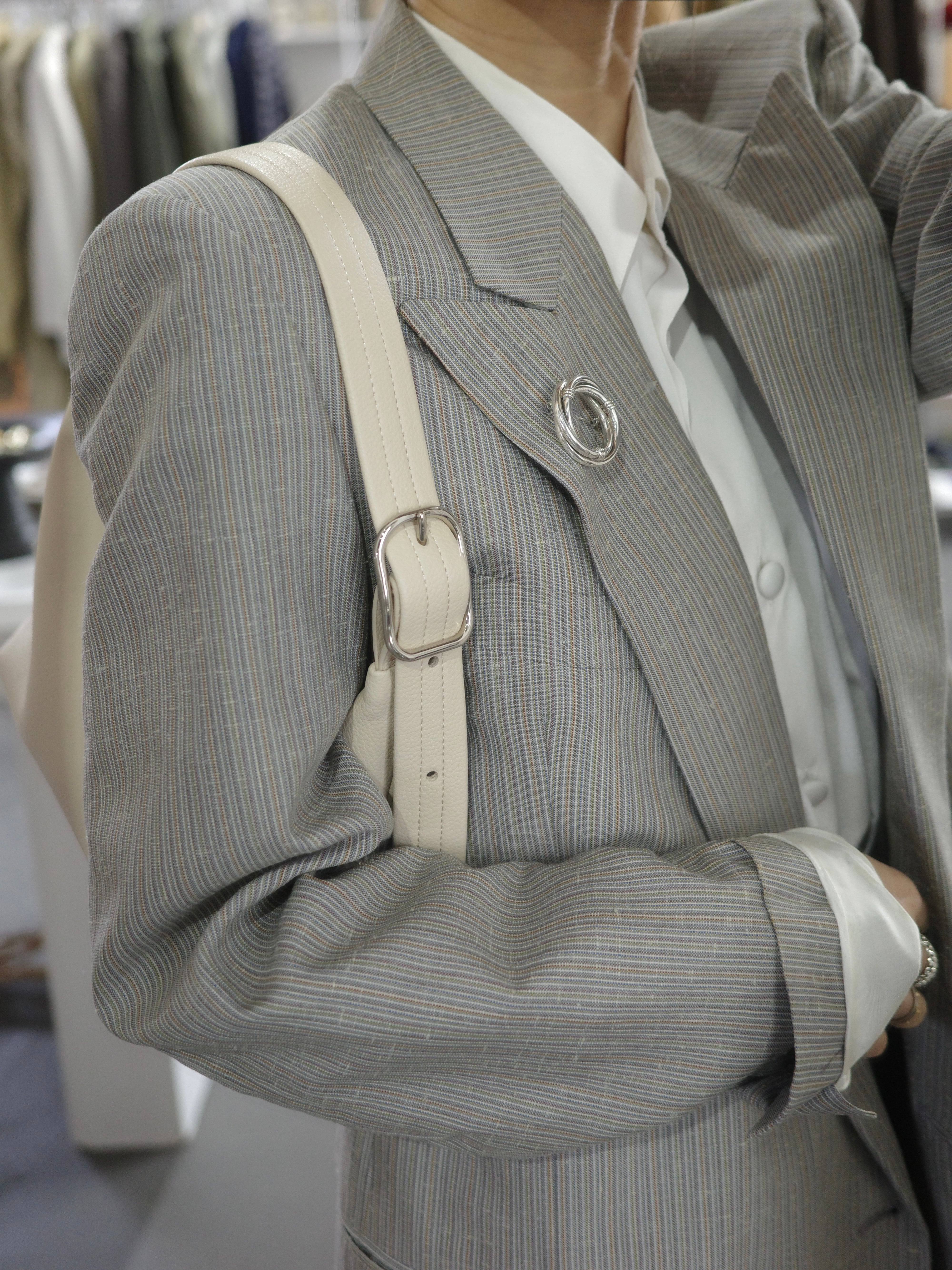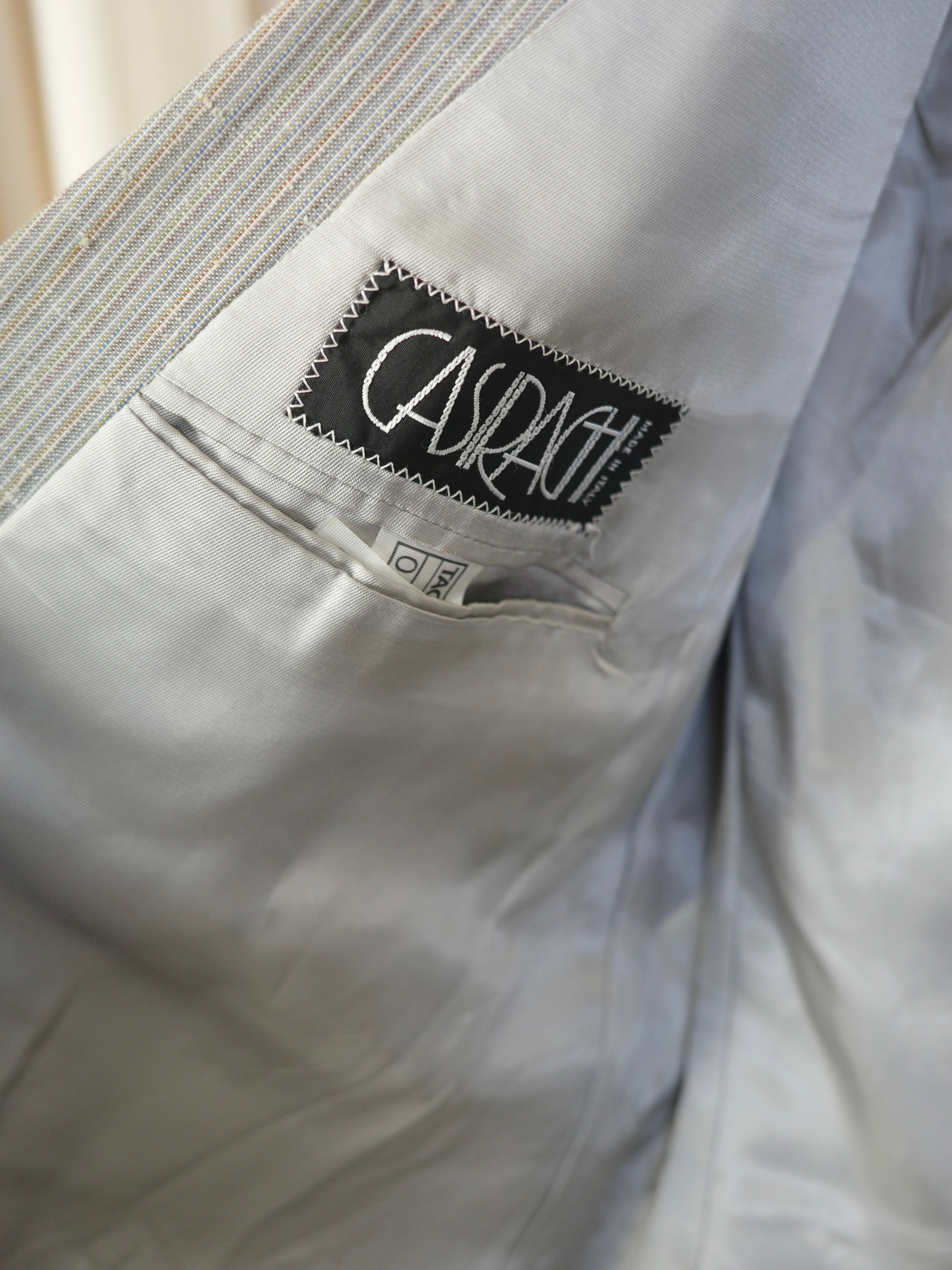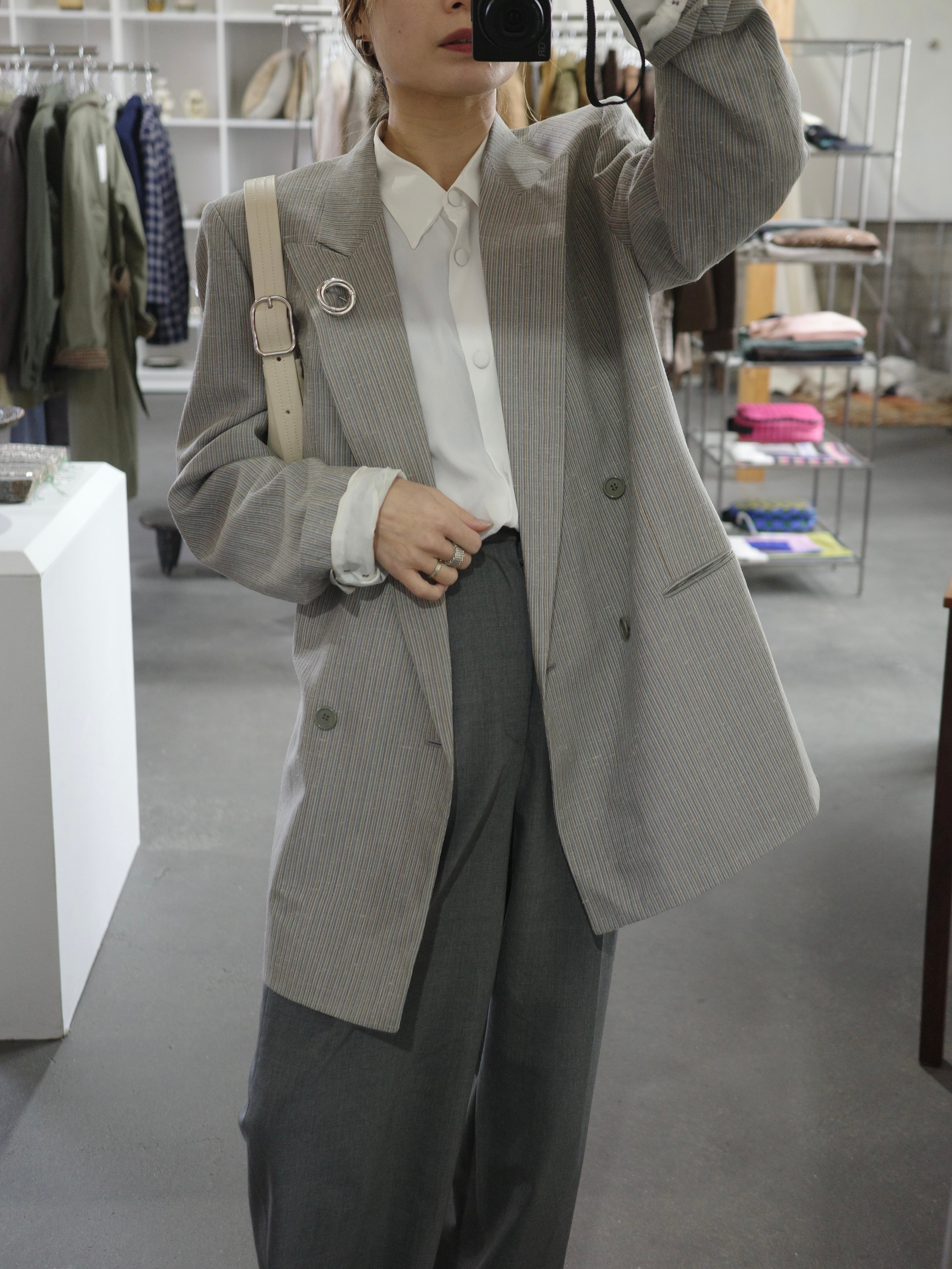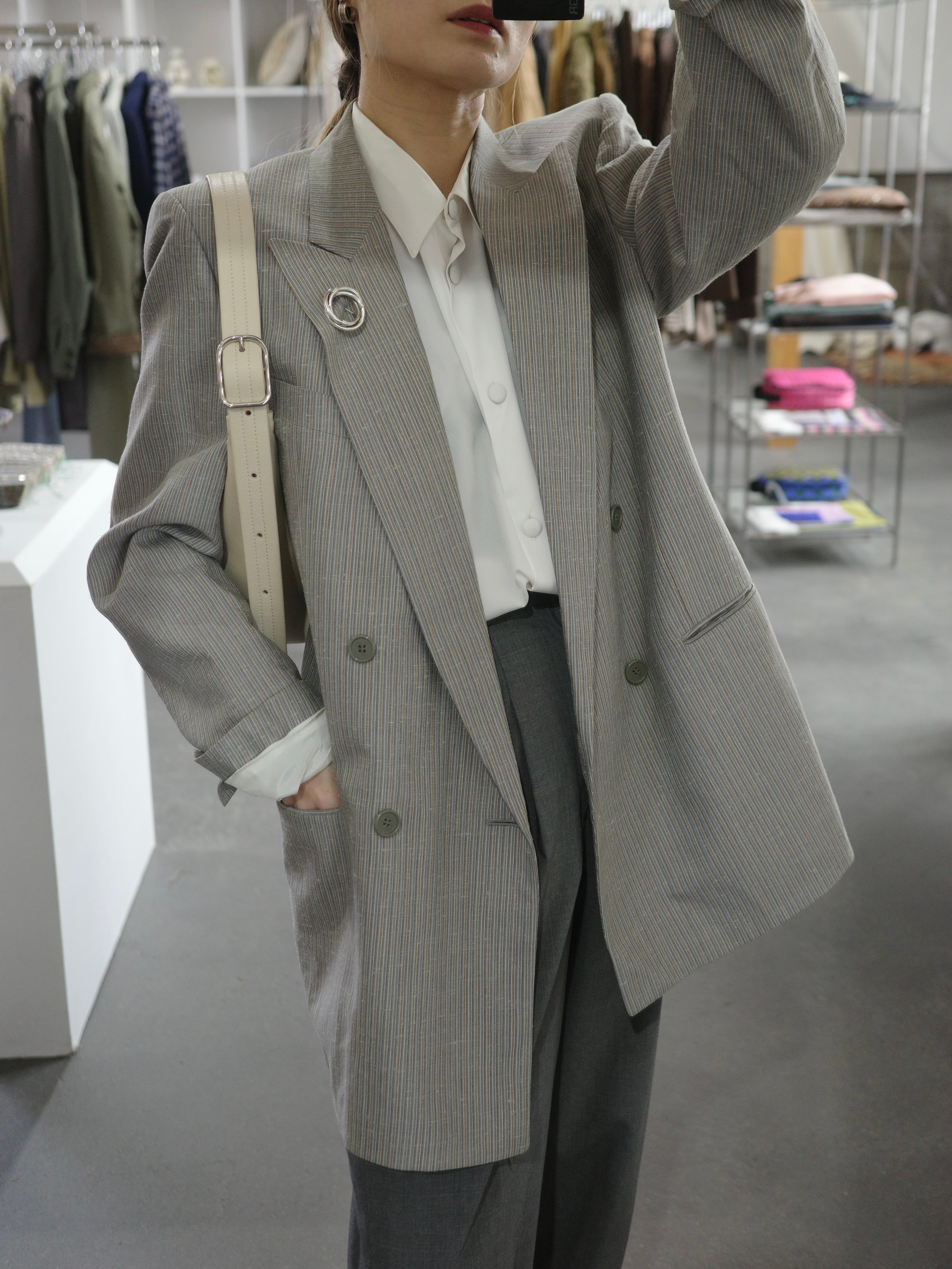 イタリア製のダブルジャケットです。ボックス型のシルエットがとっても美しく、程よくオーバーサイズに着用いただけます。グレーベージュのようなベースカラーですが、ストライプにはさりげなくグリーン、オレンジ、ブルーなどの色が入っていて、珍しい生地や色合いががとってもカッコ良いです。薄手なので、春や秋に活躍するアイテムです。
