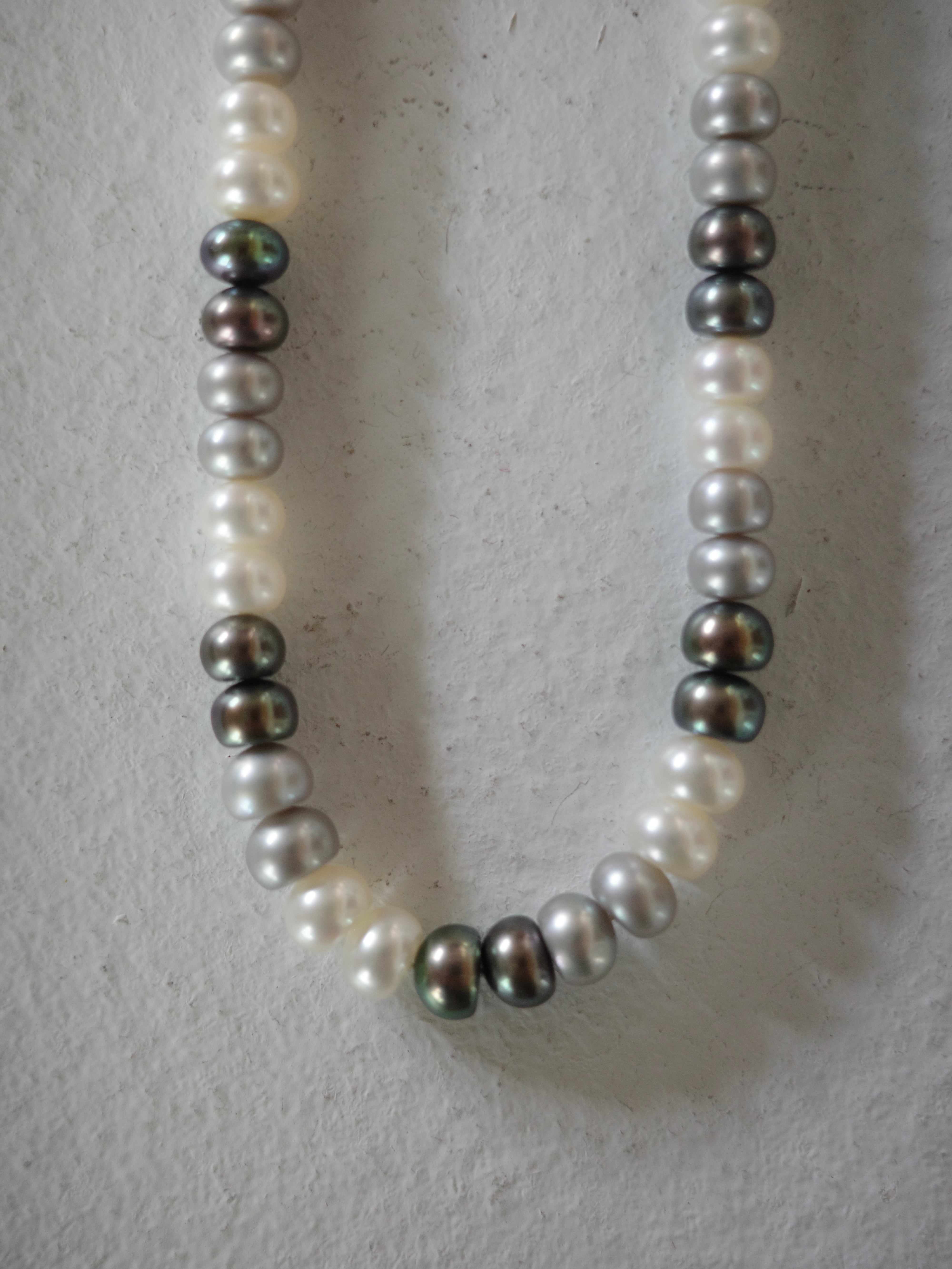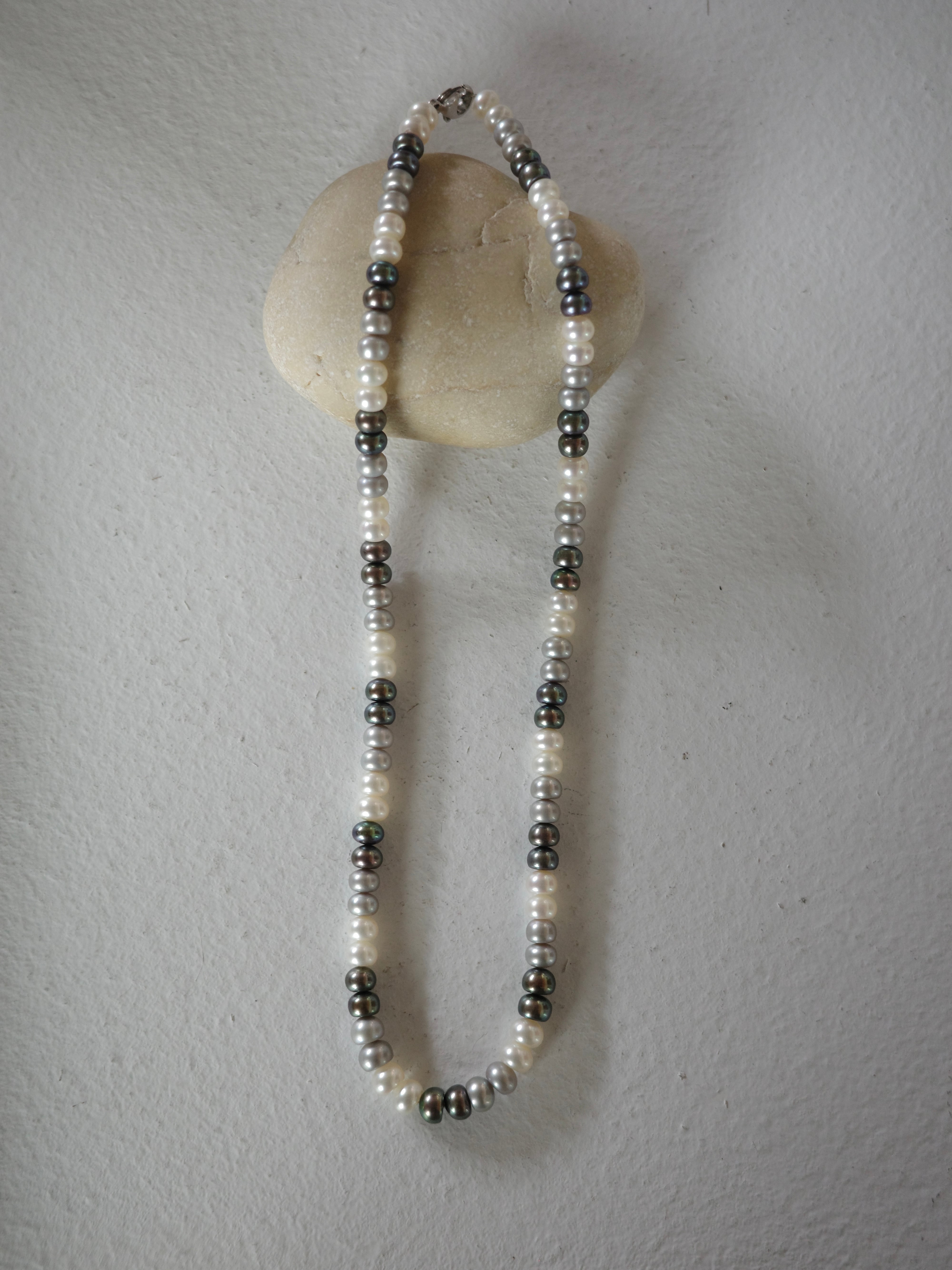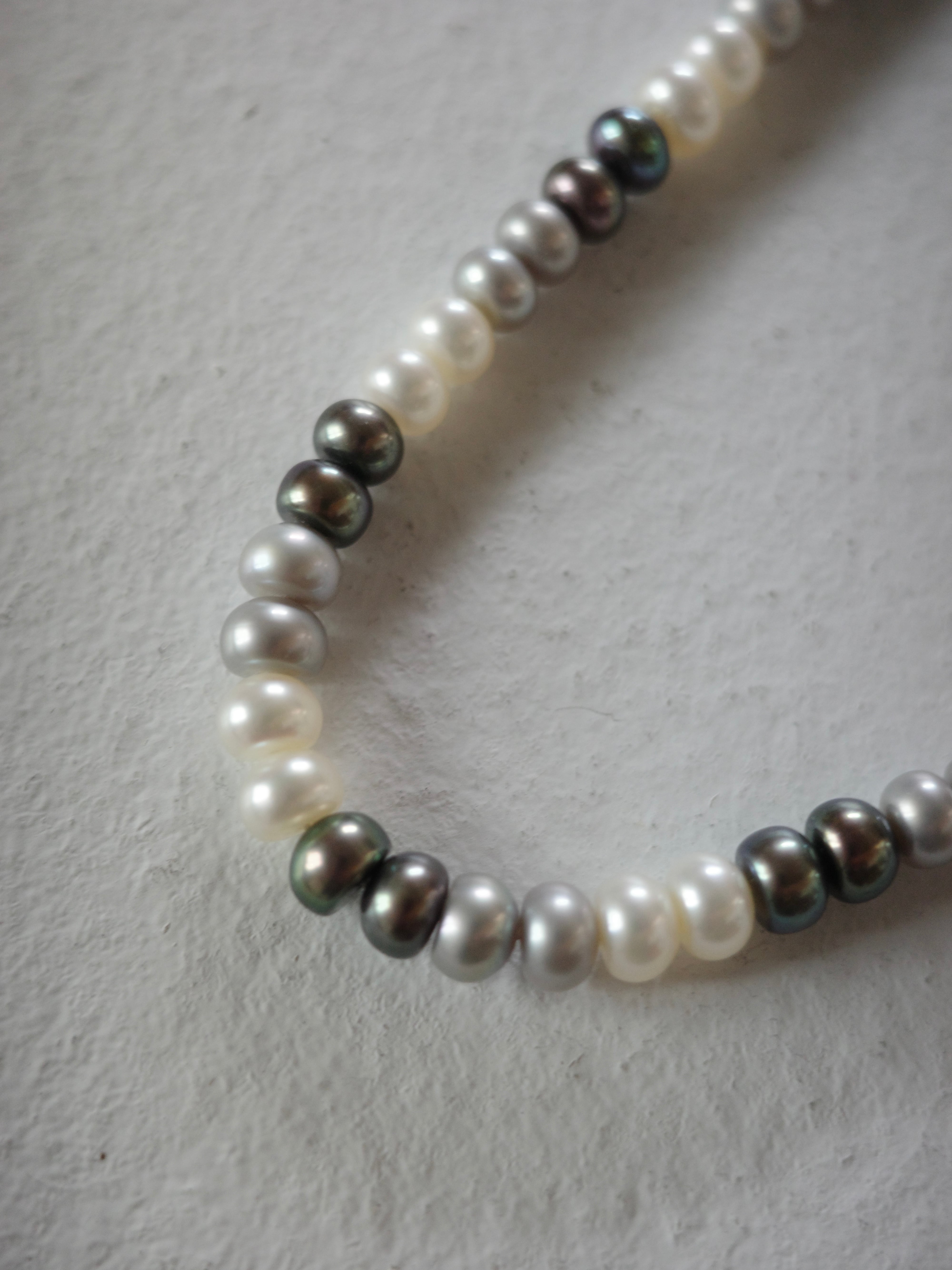 アメリカより仕入れたヴィンテージエックレスです。照りの美しい淡水パールが使用されていて、ホワイト、グリーン、グレのカラーパールが2粒ずつ配置された色合いがとても素敵です。