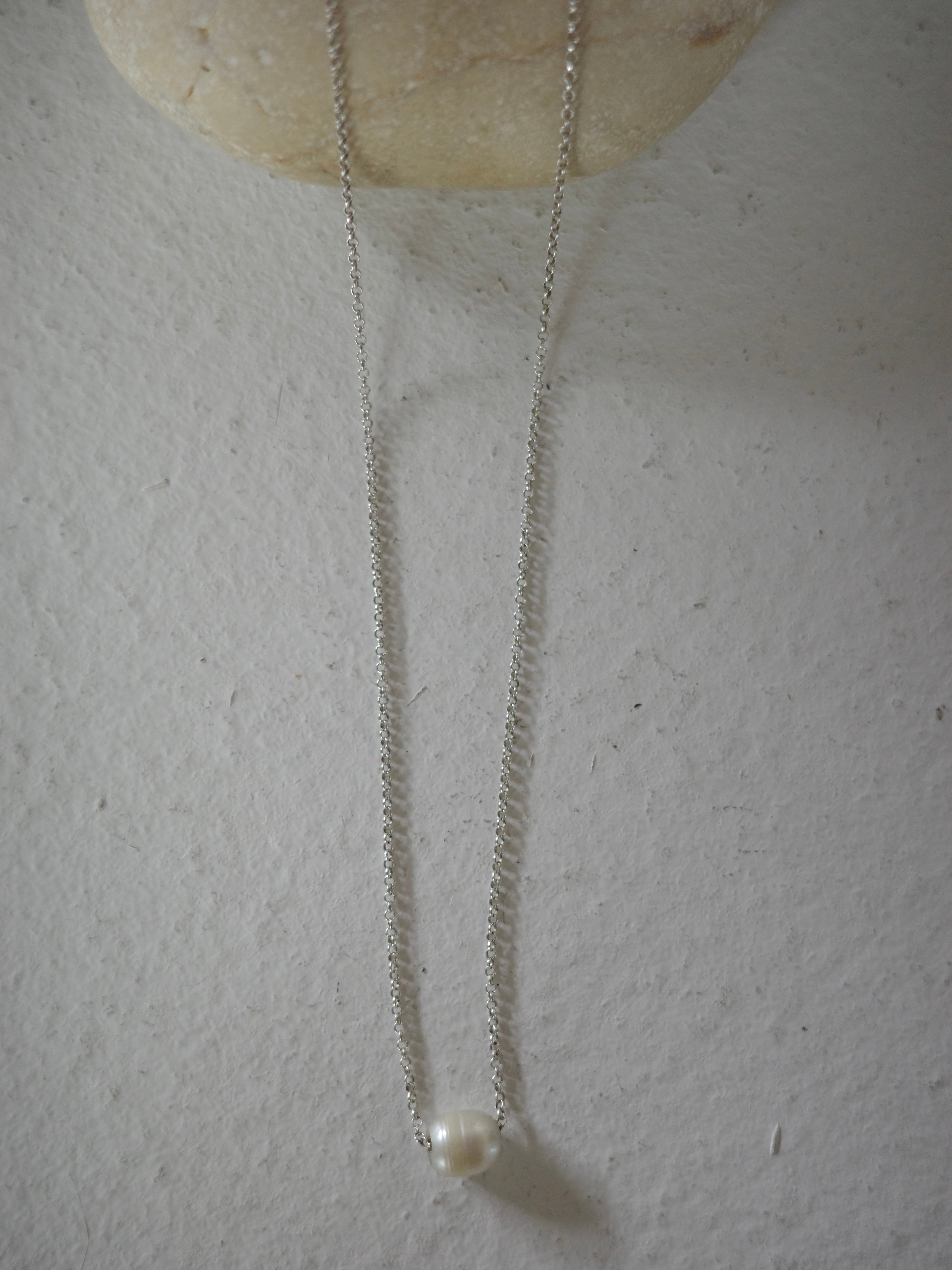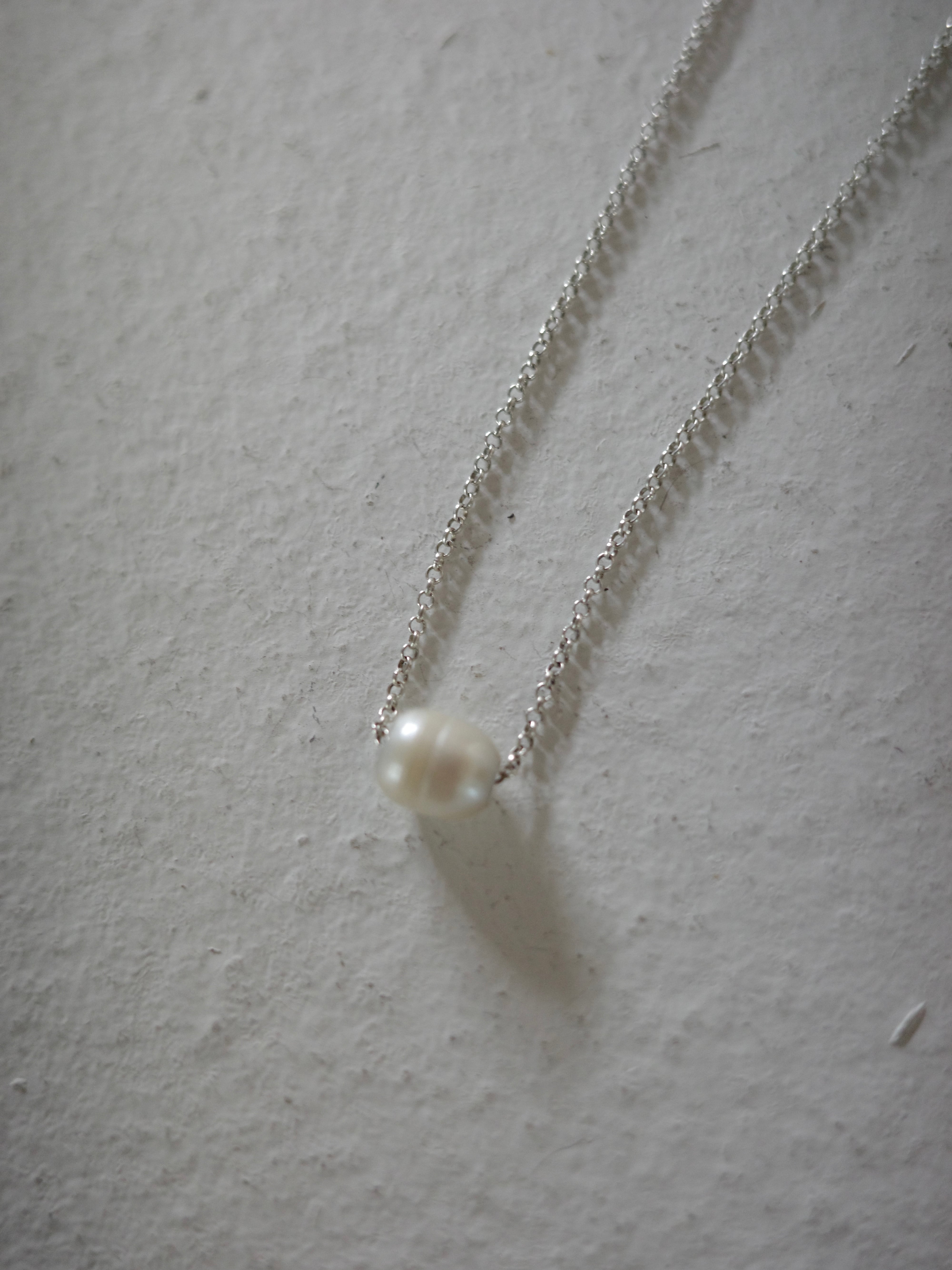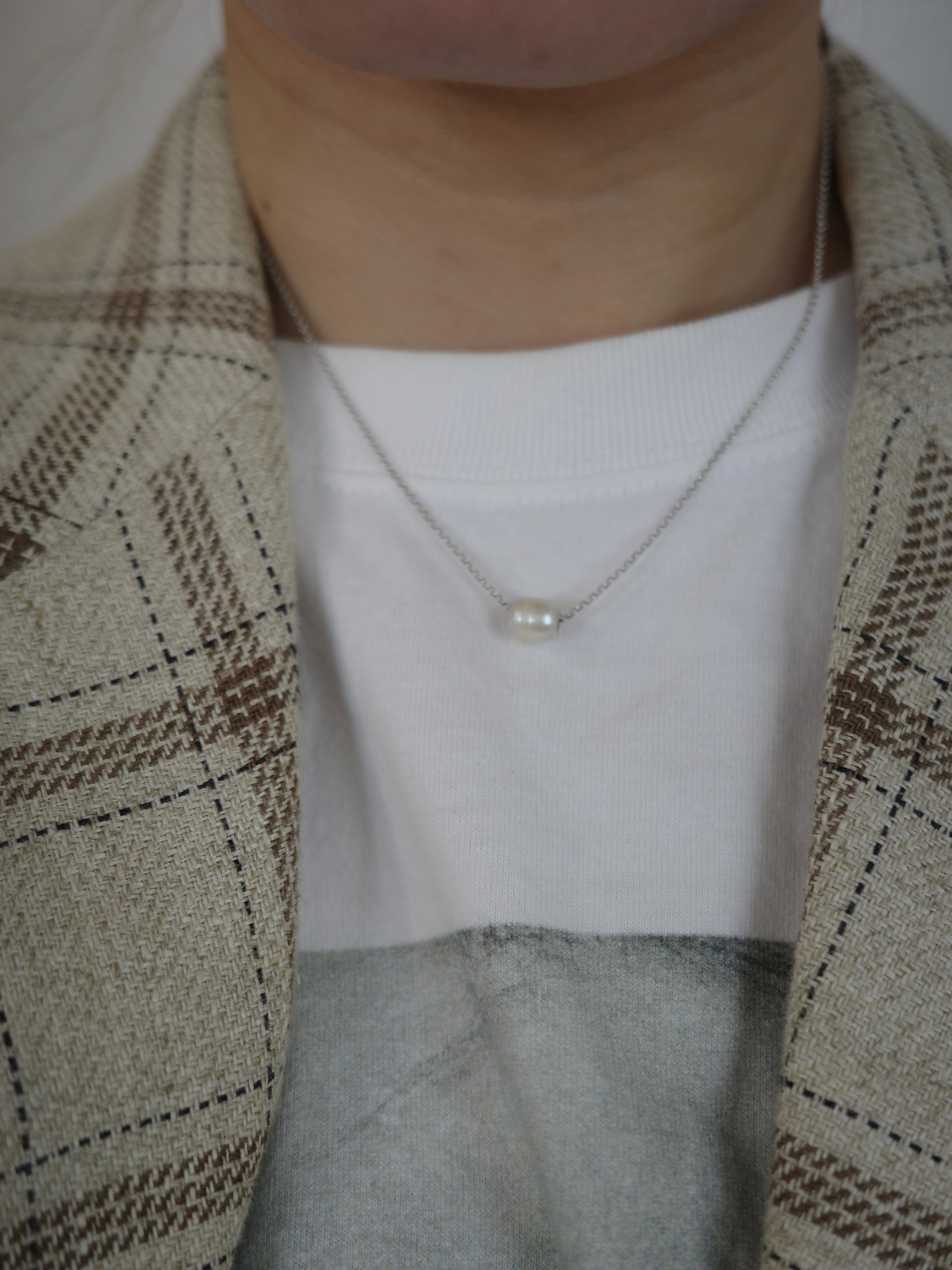 アメリカより仕入れたヴィンテージネックレスです。華奢なチェーンにシンプルな淡水パールが施されています。パールにそのままチェーンが通っているシンプルなデザインで、横向きなのも珍しいアイテム。カジュアルスタイリングの外しや重ね付けにもおすすめです。