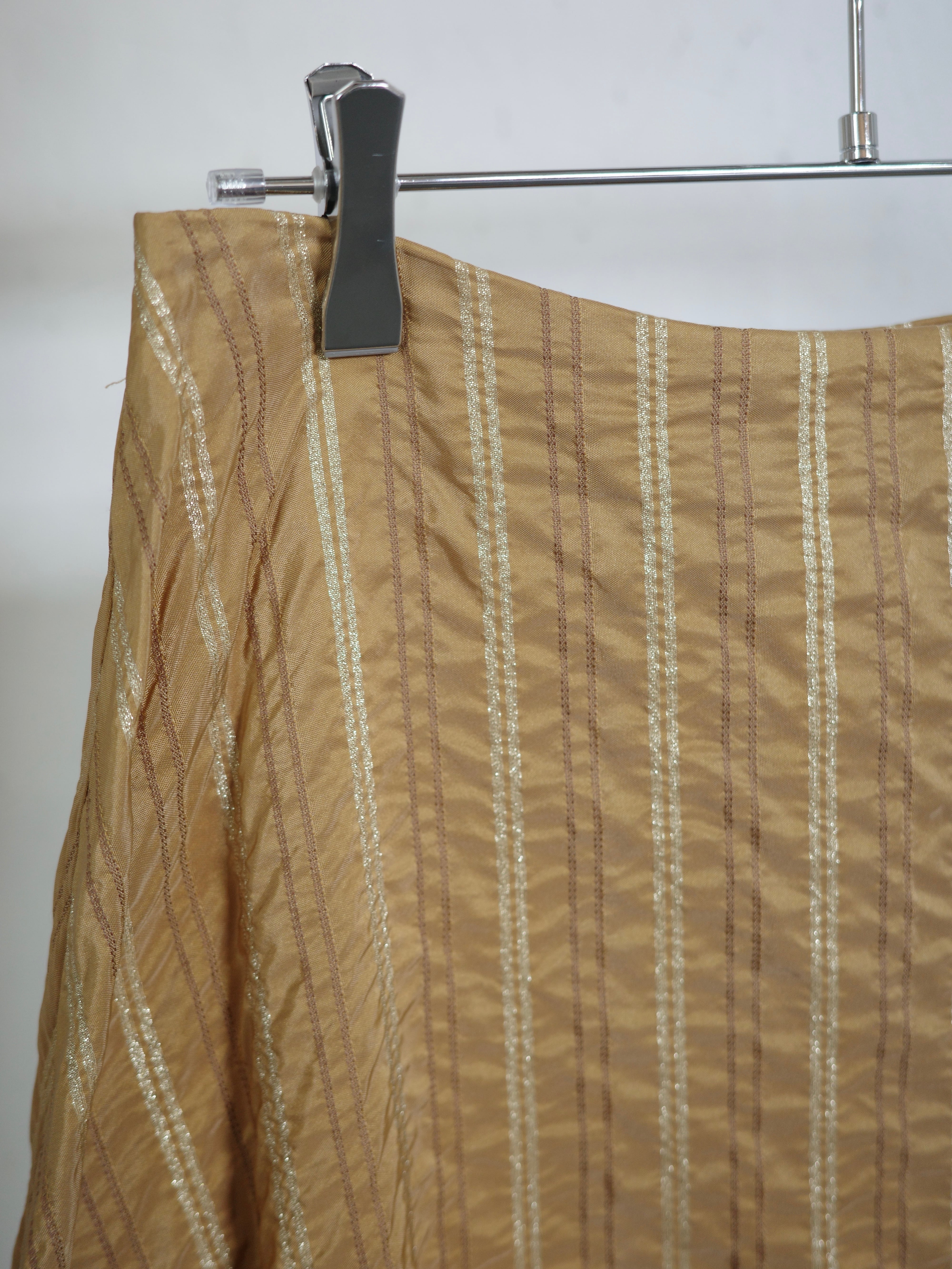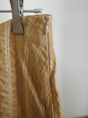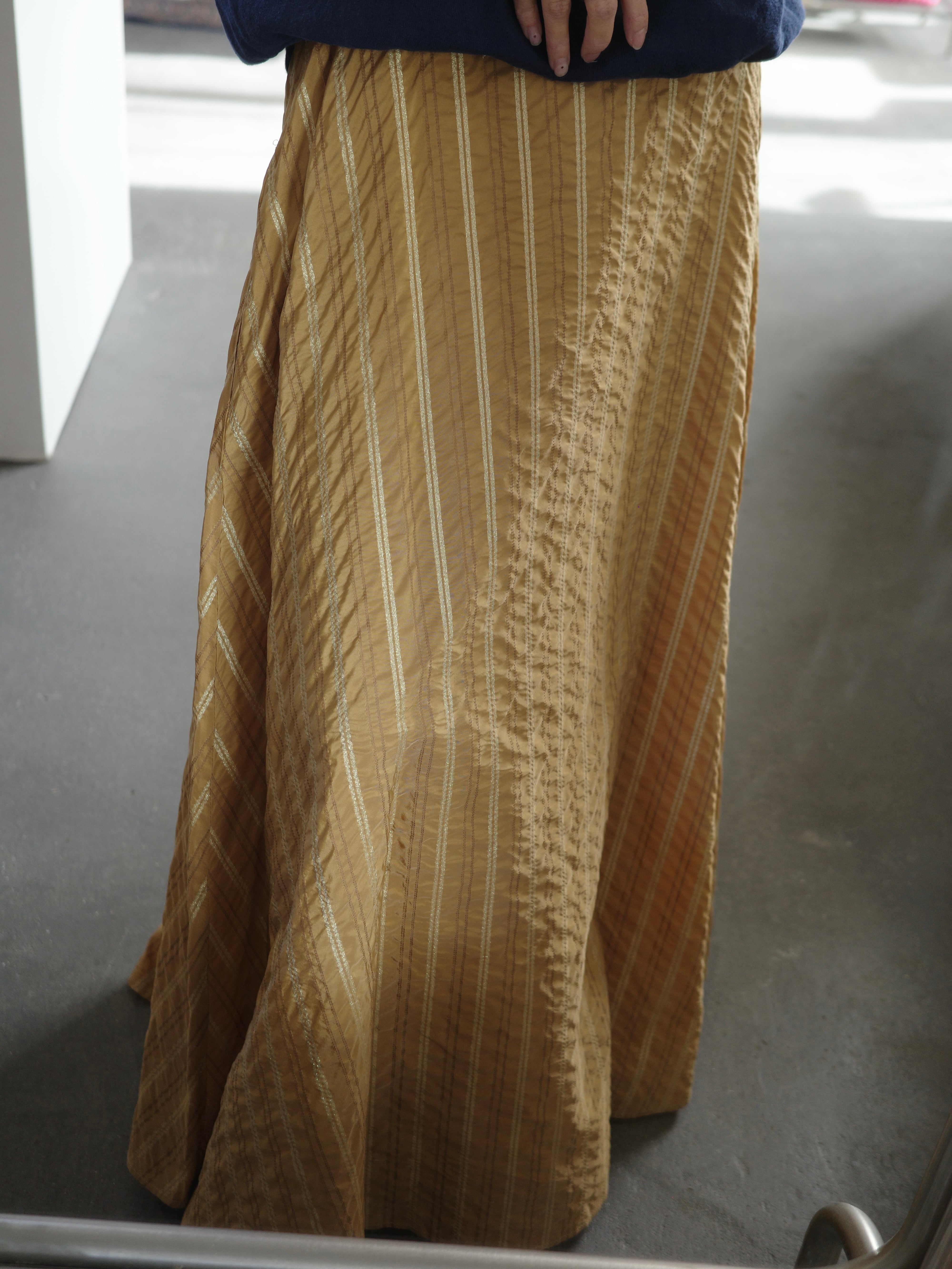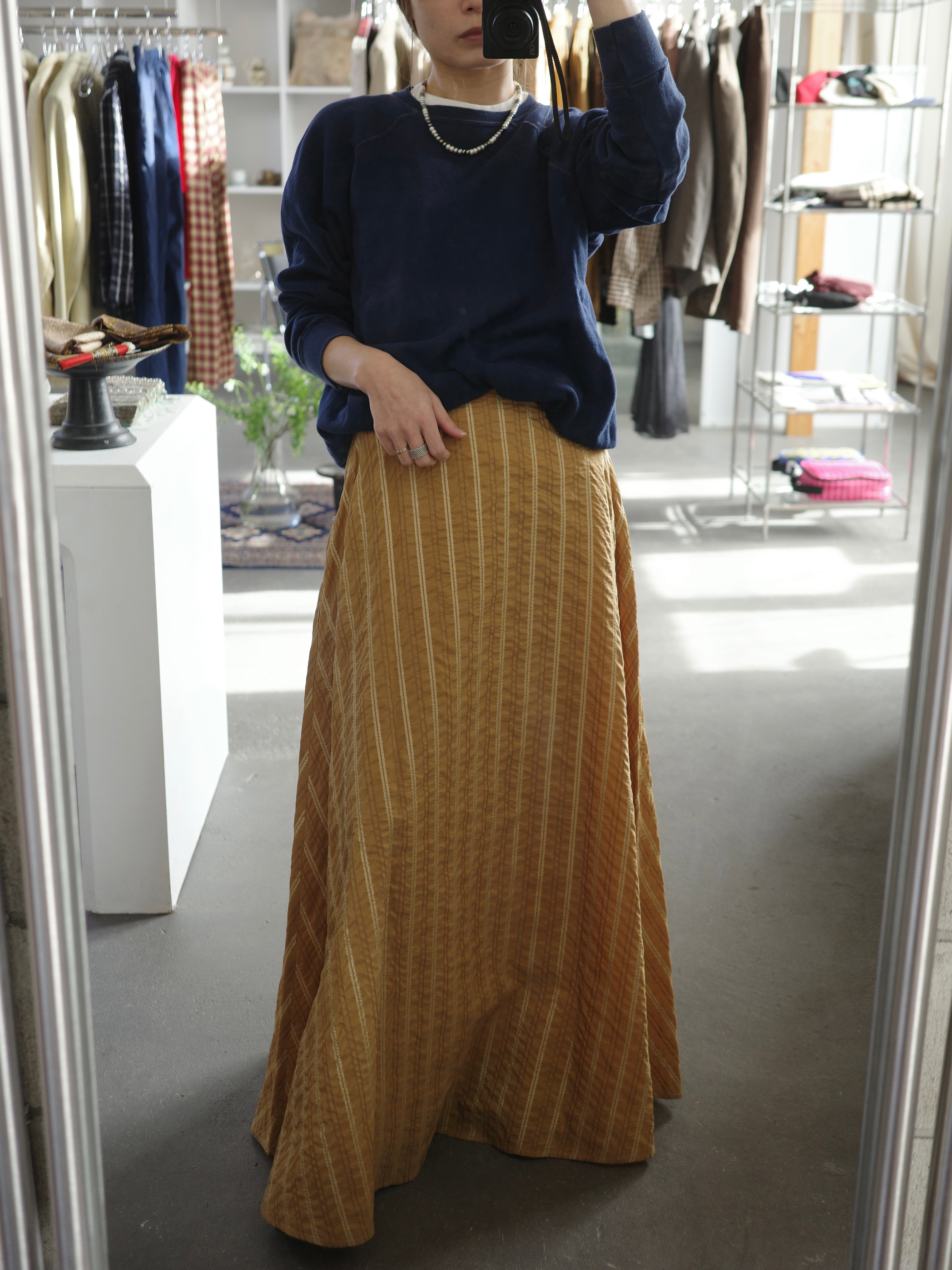 made in Italyのフレアスカートです。ボリュームのある上品なシルエットですが、がさっとした張りのある素材感で、デイリーに使えるカジュアルさもあります。ずるずるギリギリで履ける着丈が可愛く、トップスはシャツやスウェットなどカジュアルアイテムでバランスをとっていただくのがおすすめです。