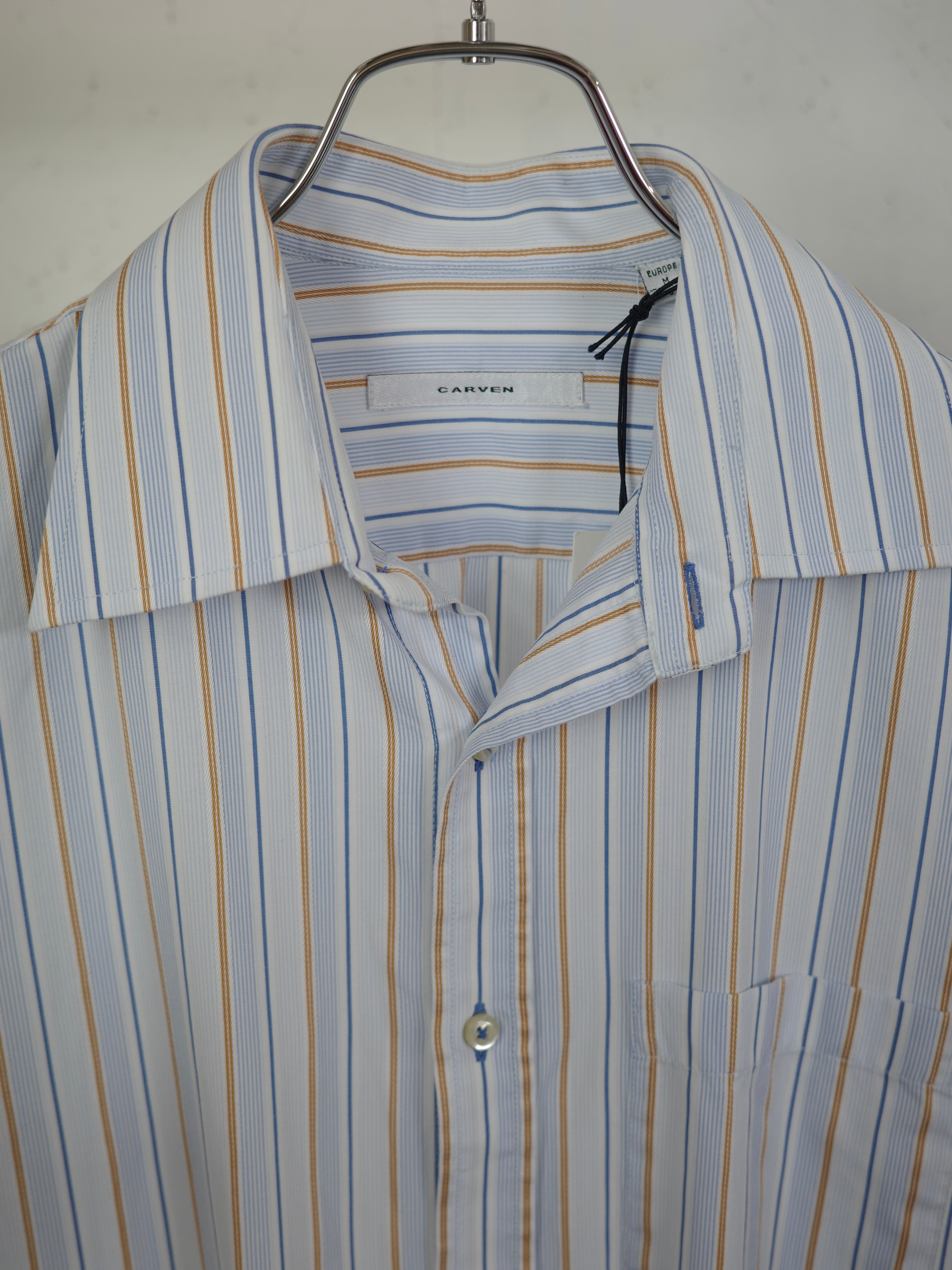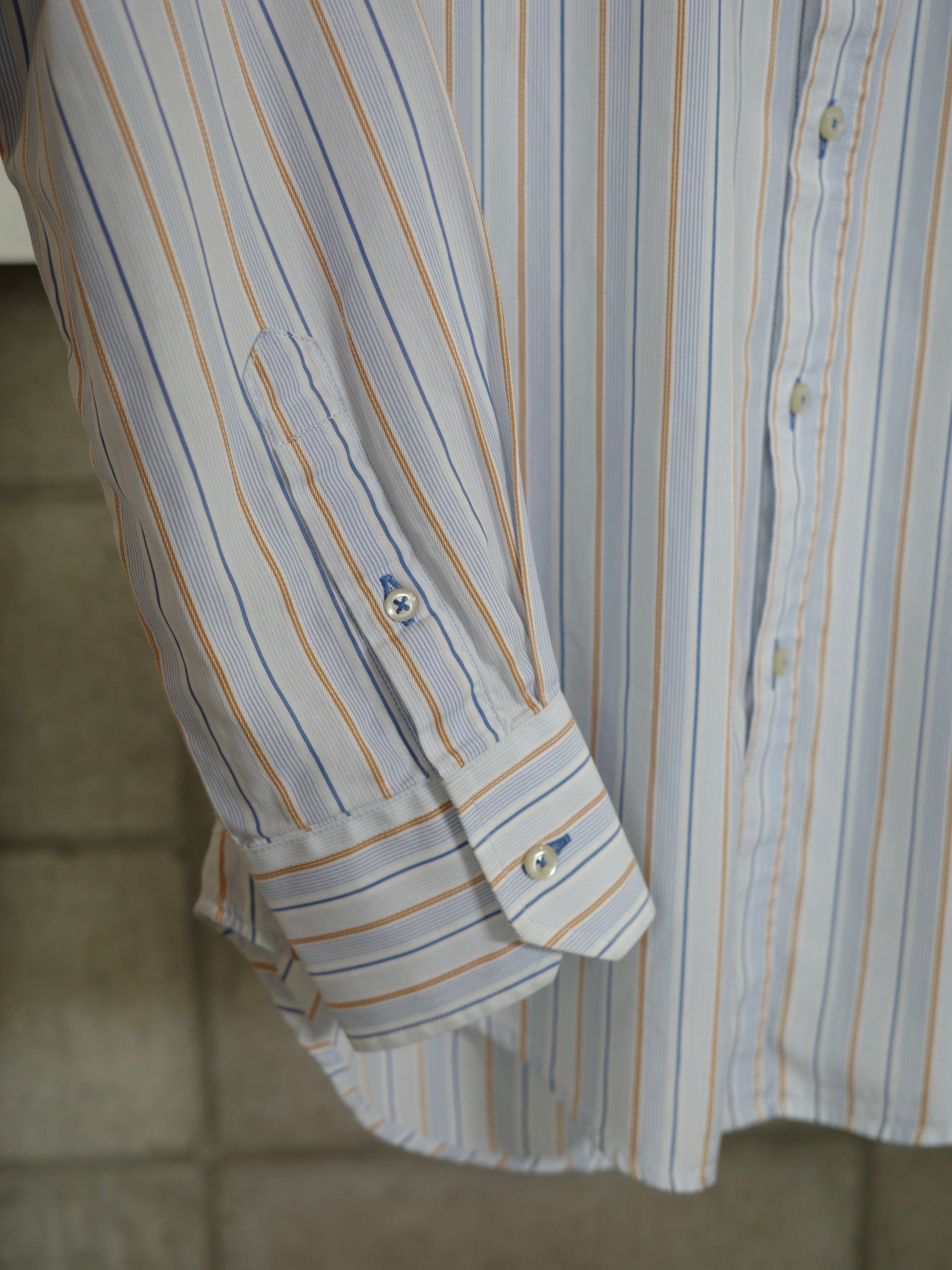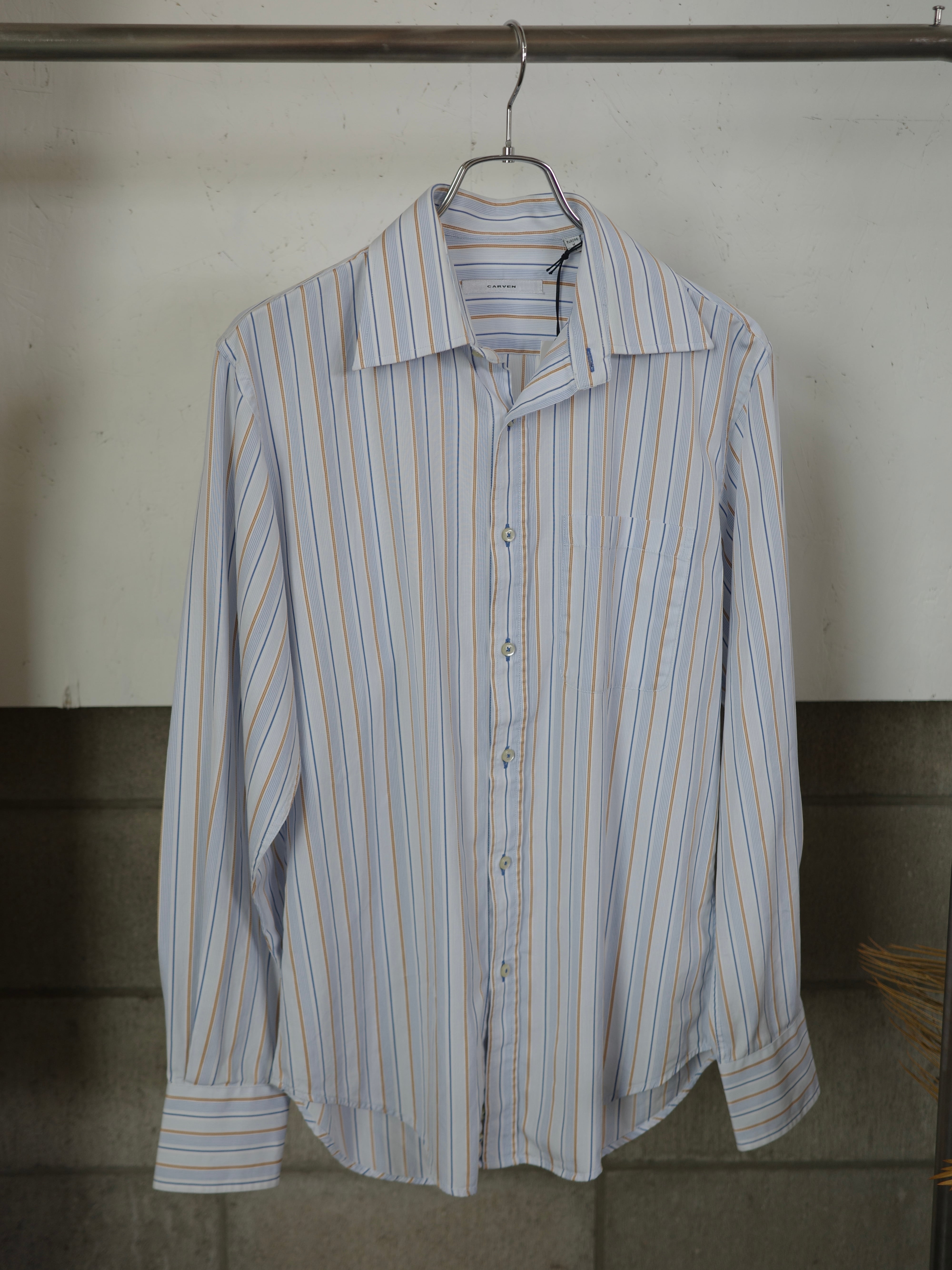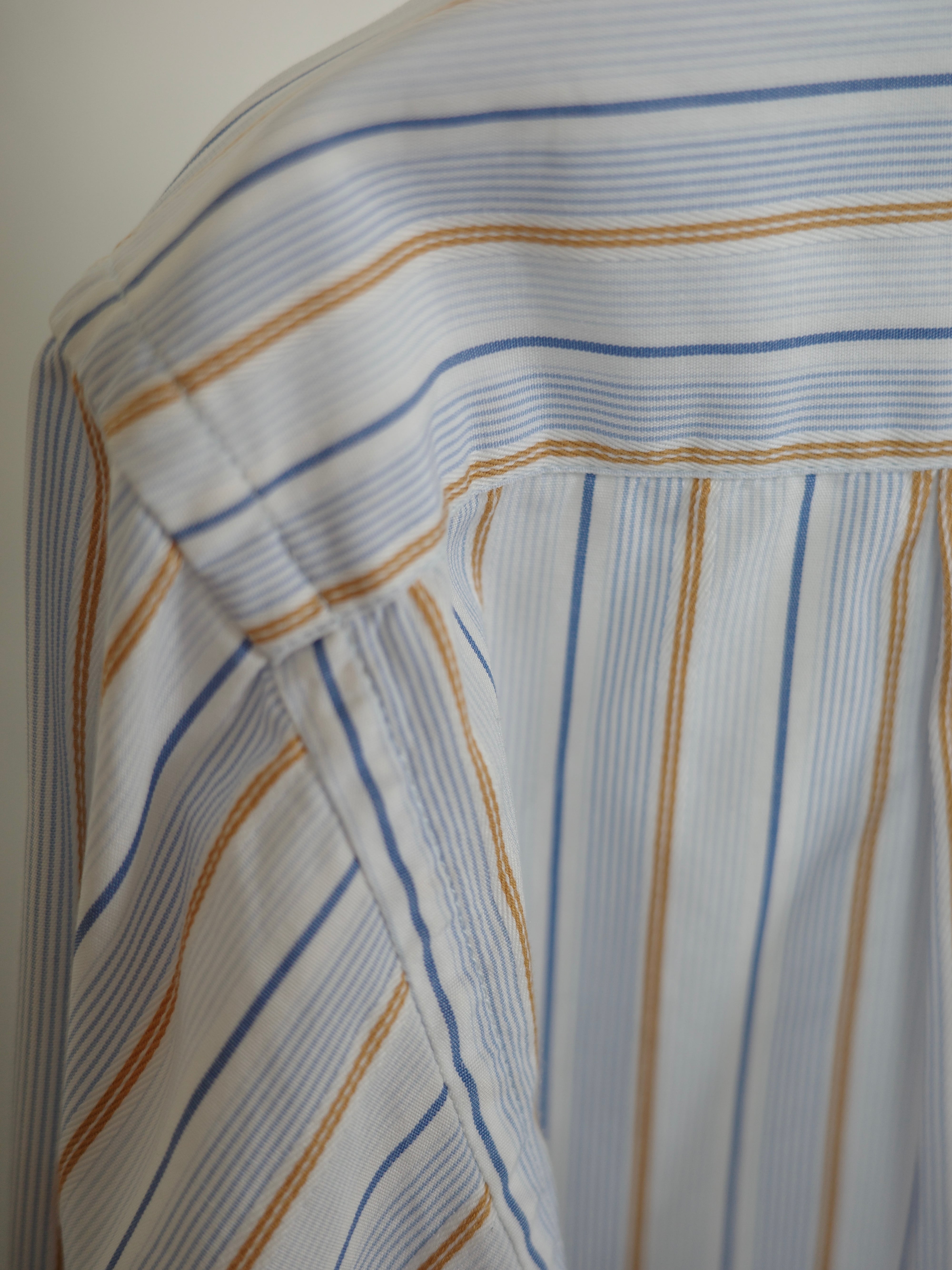 ブラウンとブルーのマルチストライプの配色が素敵なシャツです。襟芯が入っており、生地もハリがある綺麗めなアイテムです。オーバーすぎずコンパクトすぎないサイズ感で、オールシーズンレイヤードにも活躍しそうです。