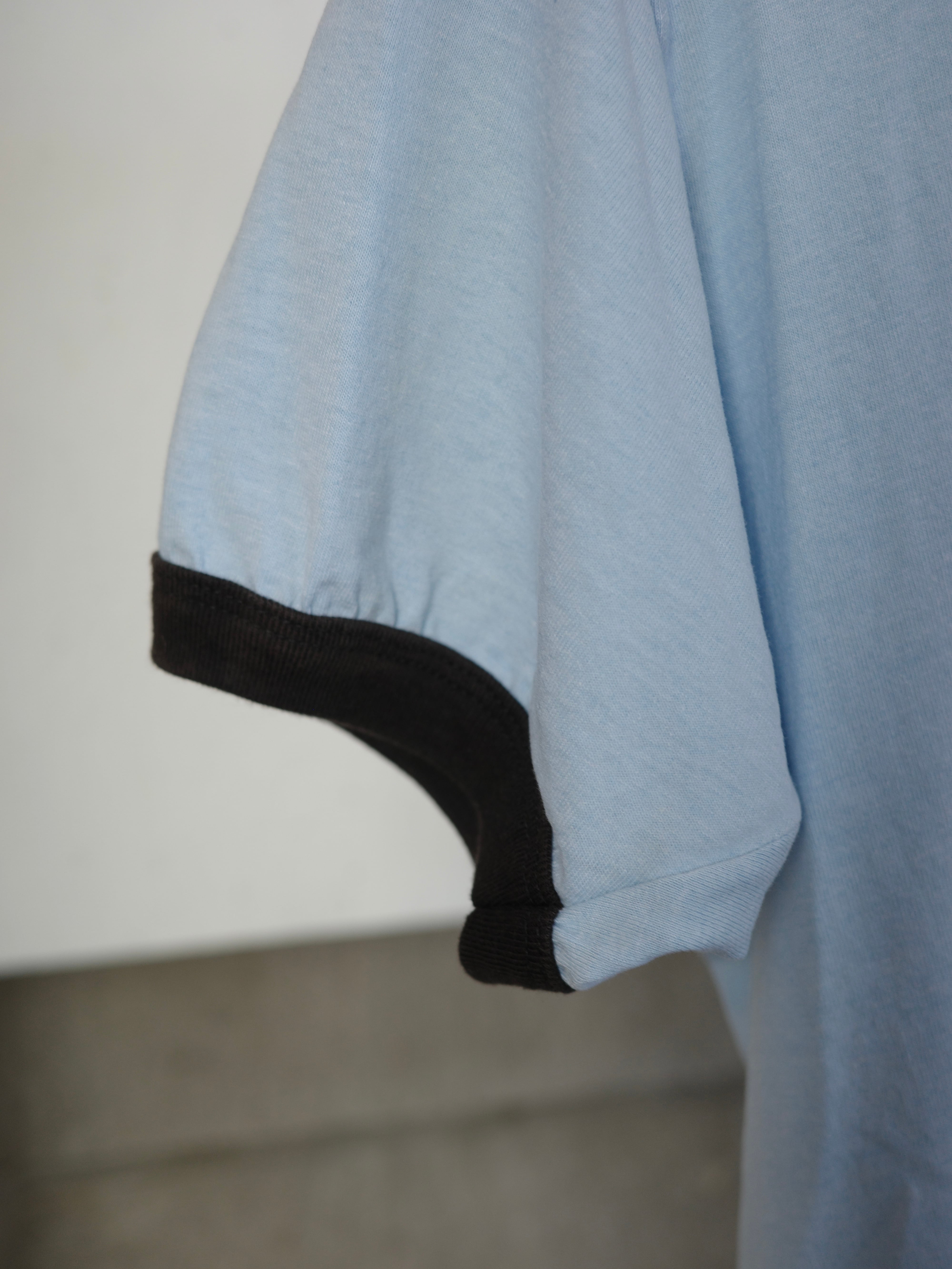 水色ベースの配色が素敵なリンガーTシャツ。カジュアルなロゴと相反するパフっとした袖のデザインが可愛らしいアイテム。