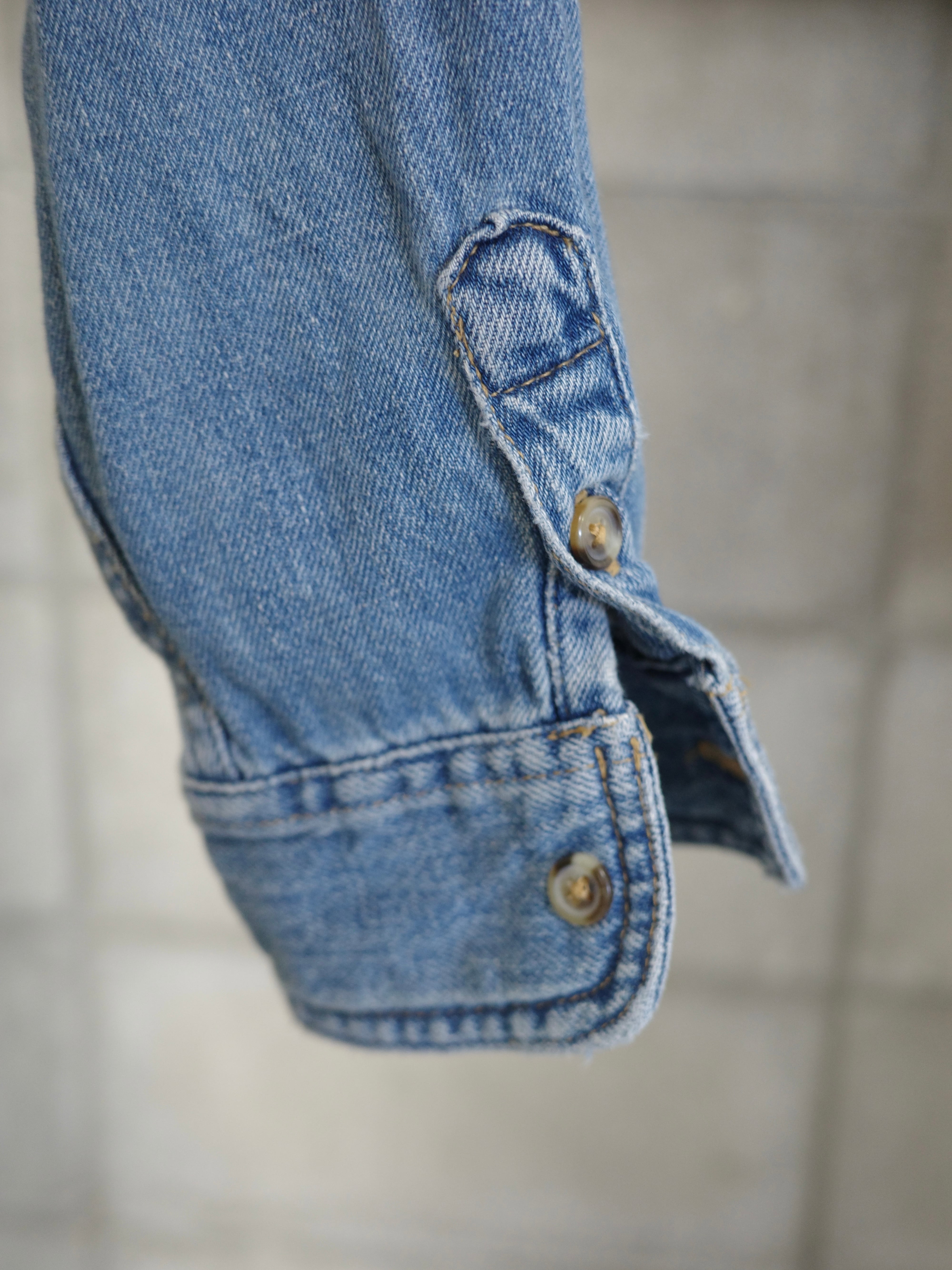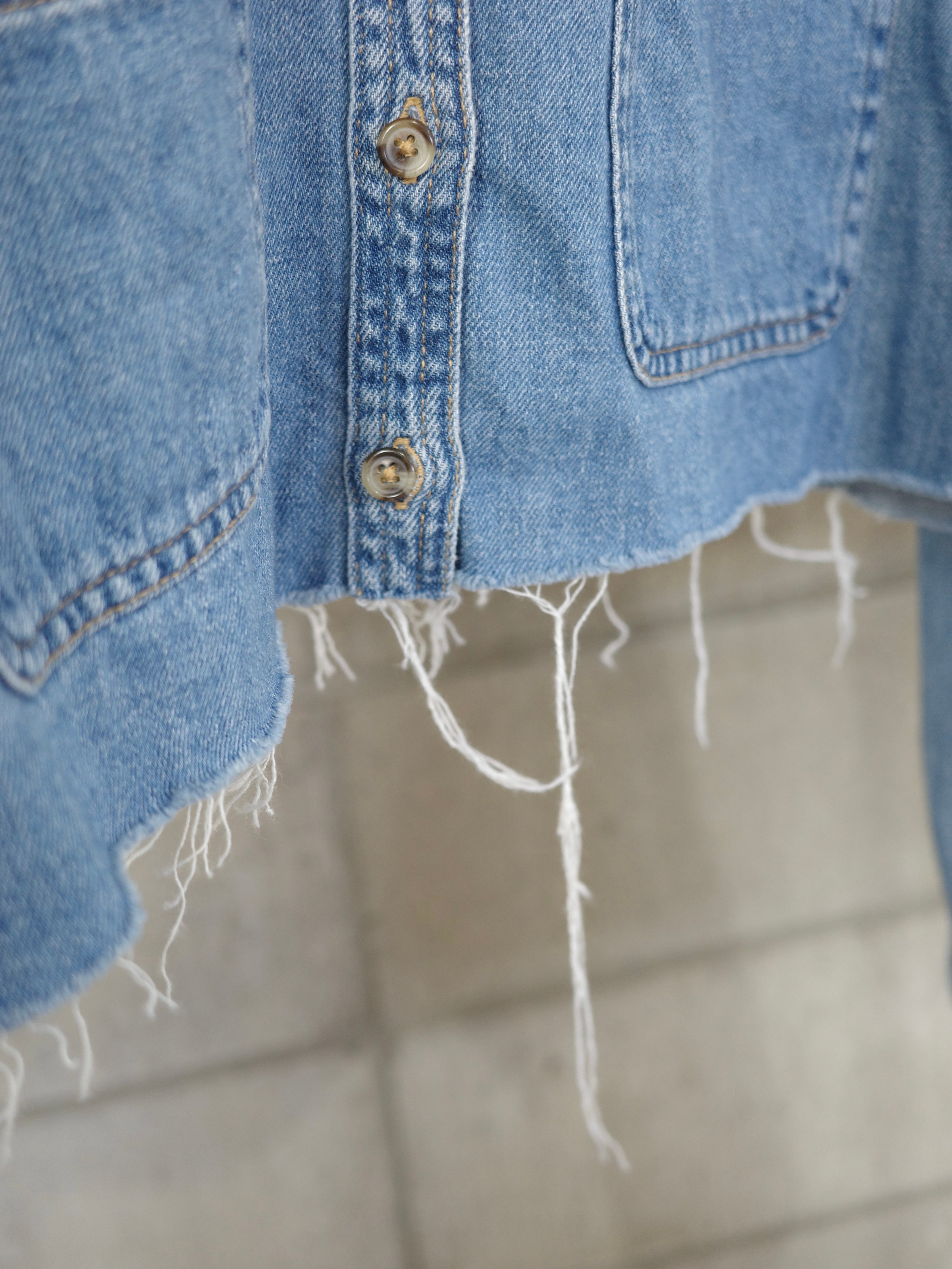 薄手のデニムシャツを短丈に切りっぱなしにした大胆なデザイン。コンパクトでバランスが取利やすいアイテムで、ハイウエストなボトムやワンピースと相性抜群です。前を閉じてトップスのようにしても良いですし、夏はサラッと羽織れるアイテムとして活躍します。