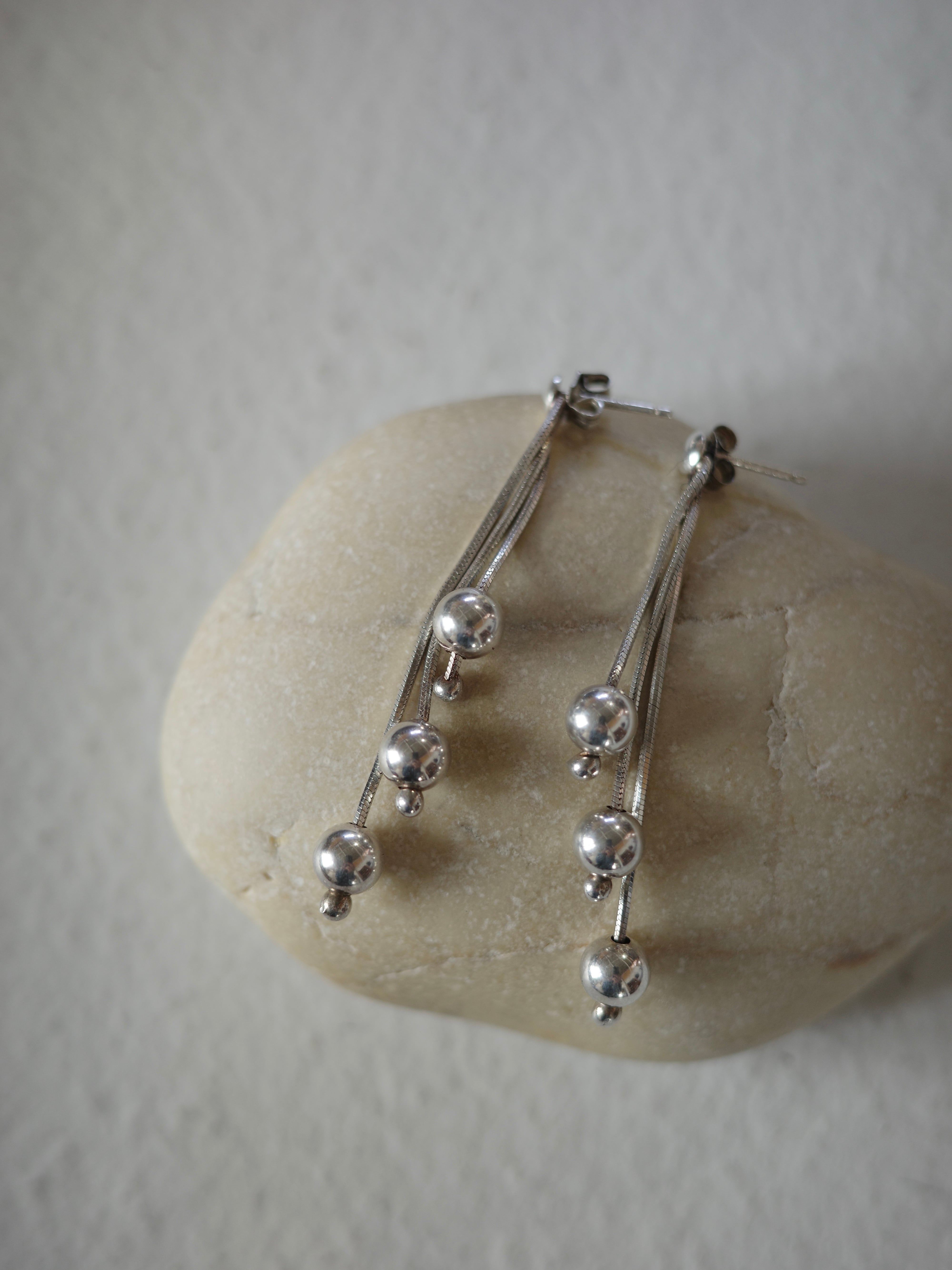アメリカより仕入れたヴィンテージピアスです。長さの異なる3本のチェーンの先にボールビーズが施されています。デザイン性がありながらも、大きすぎないのでさりげなくコーデのポイントになってくれます。