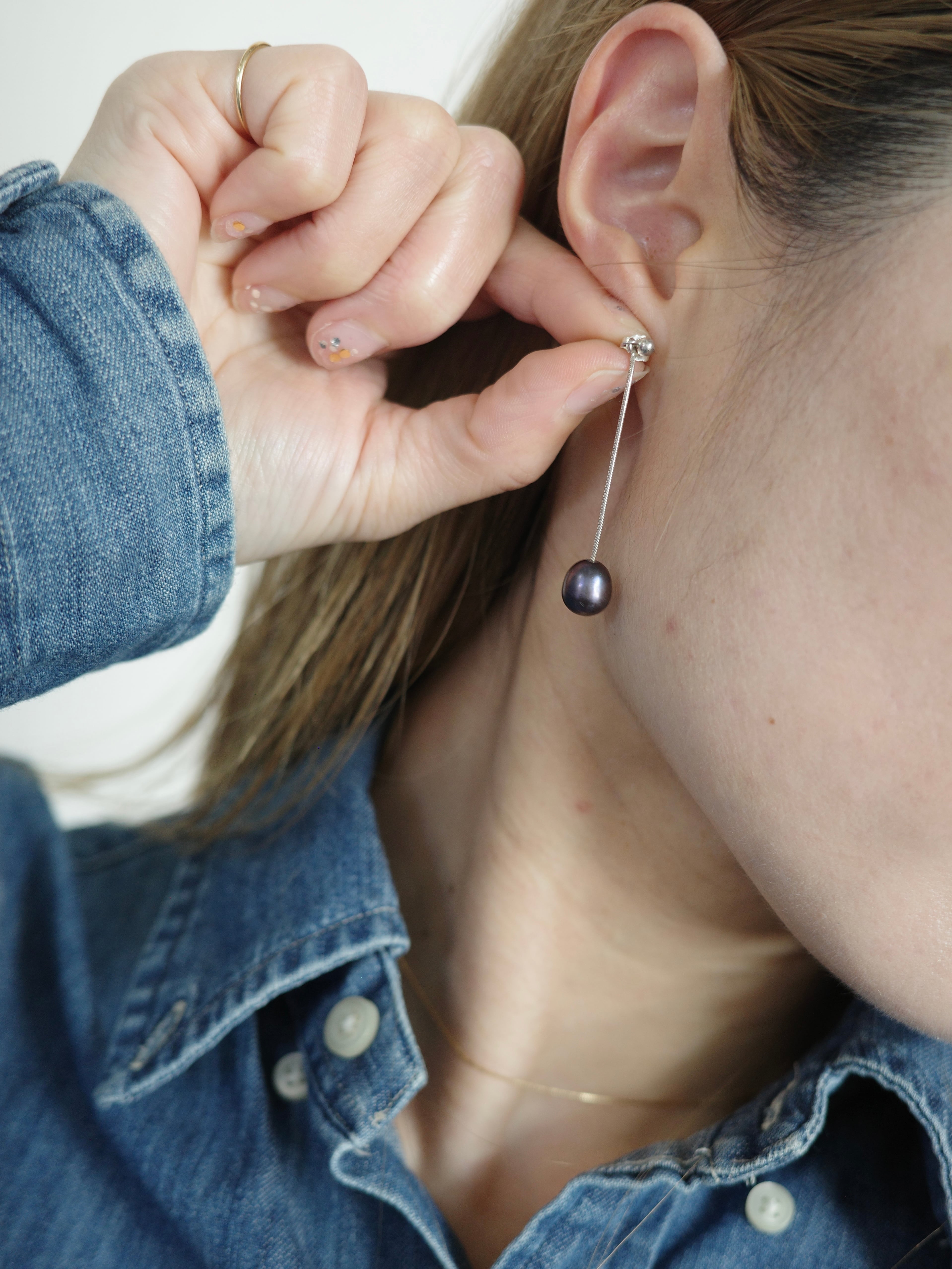 アメリカより仕入れたヴィンテージピアスです。シンプルなチェーンの先にブラックパールが施された上品なデザイン。ゆらゆらと動きのあるところと、ブラックパールのシックな色合いが素敵です。