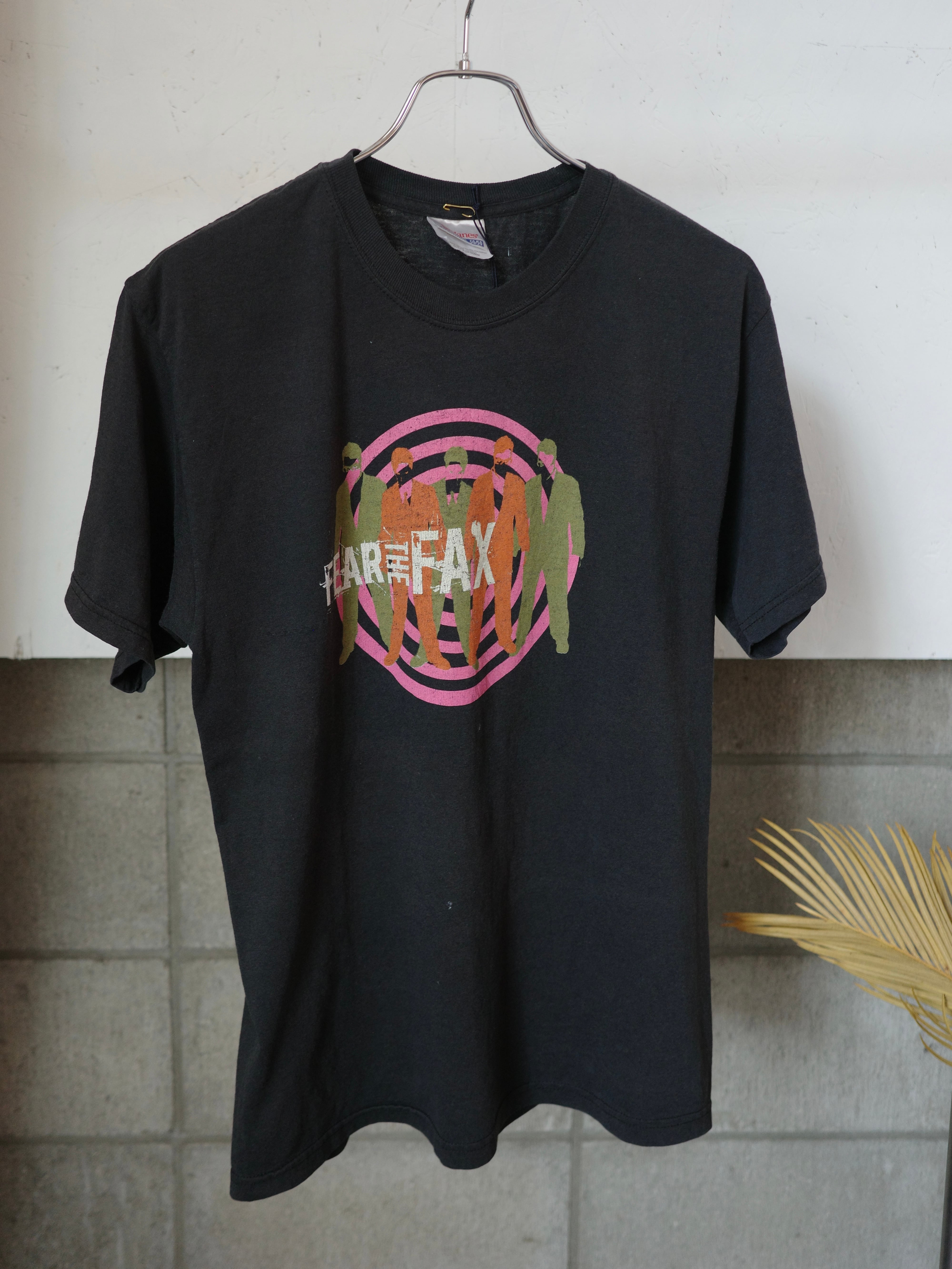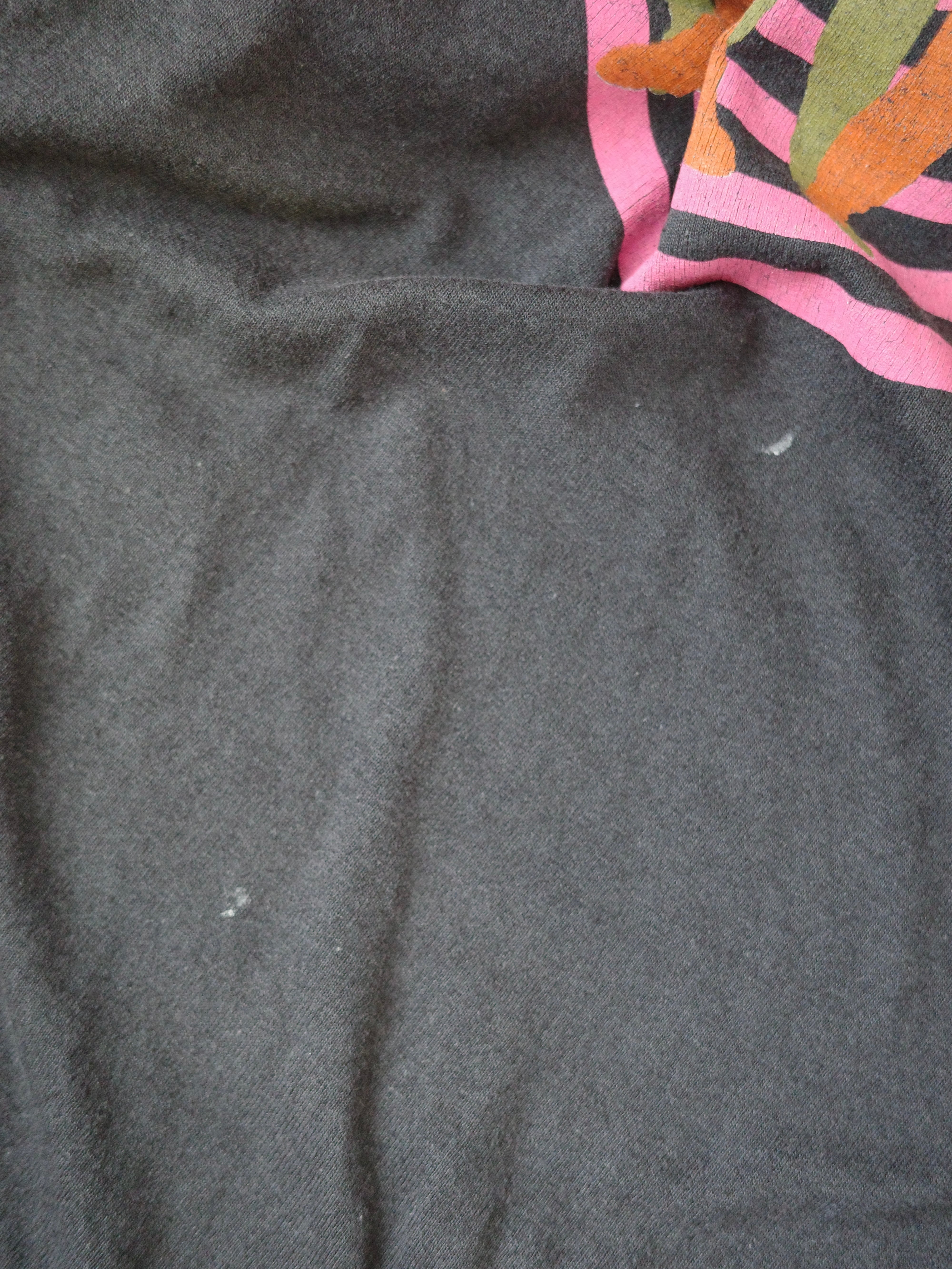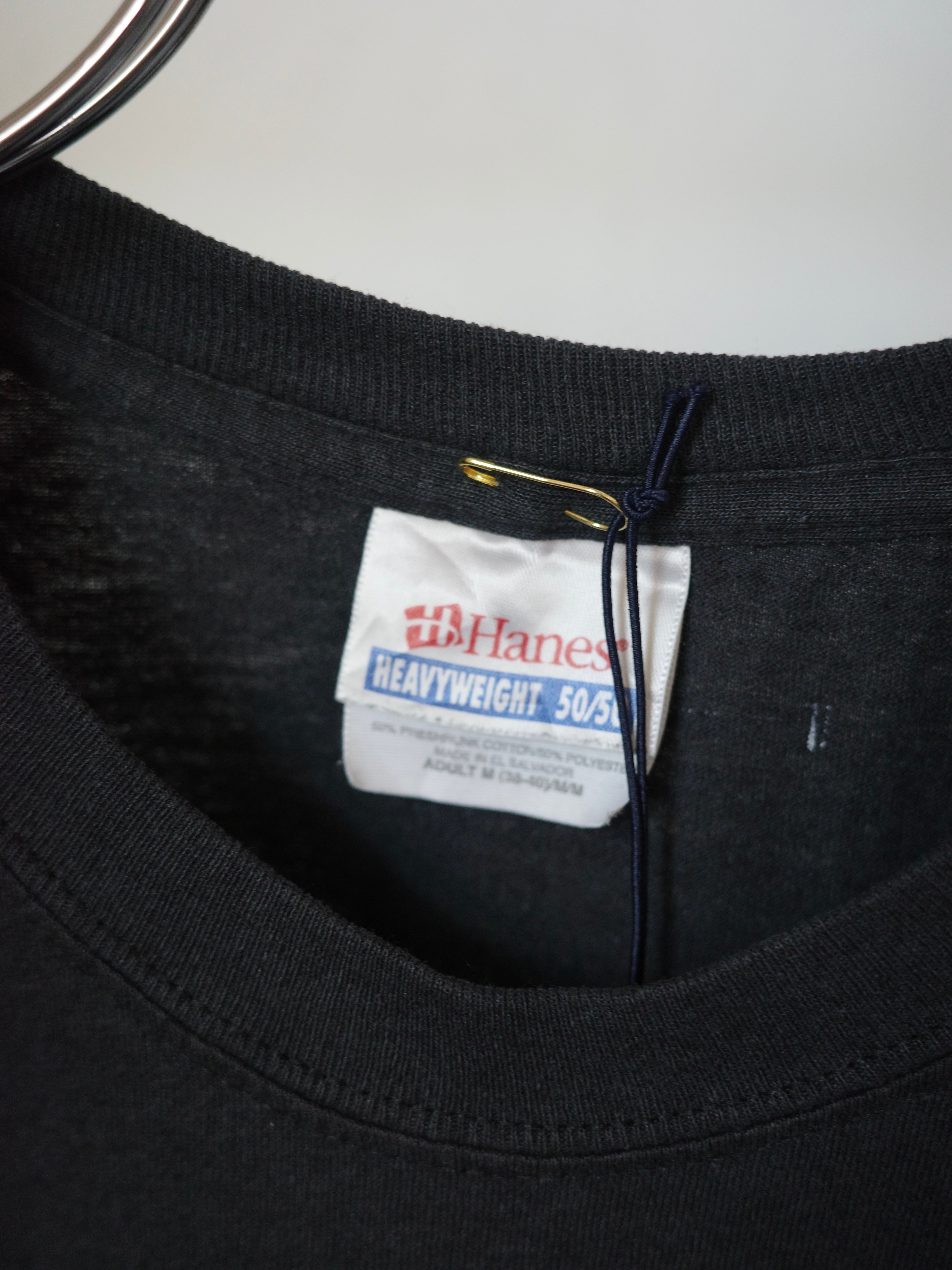 HanesベースのTシャツ。スミクロの褪せたカラーが良い風合いで、カラフルなプリントが映えるデザインです。バックの首元プリントもポイントです。インでもアウトでも着やすいサイズ感になっています。