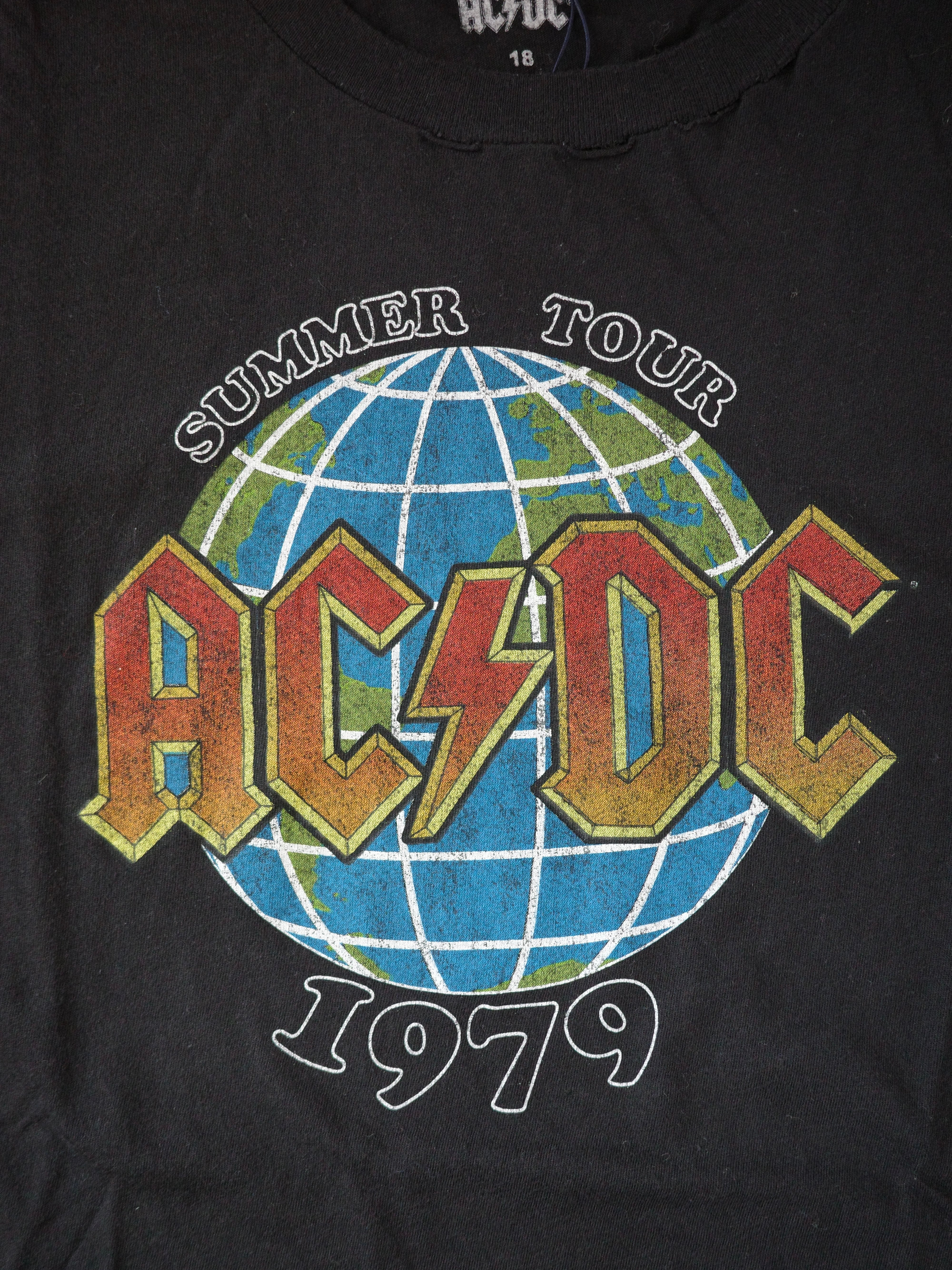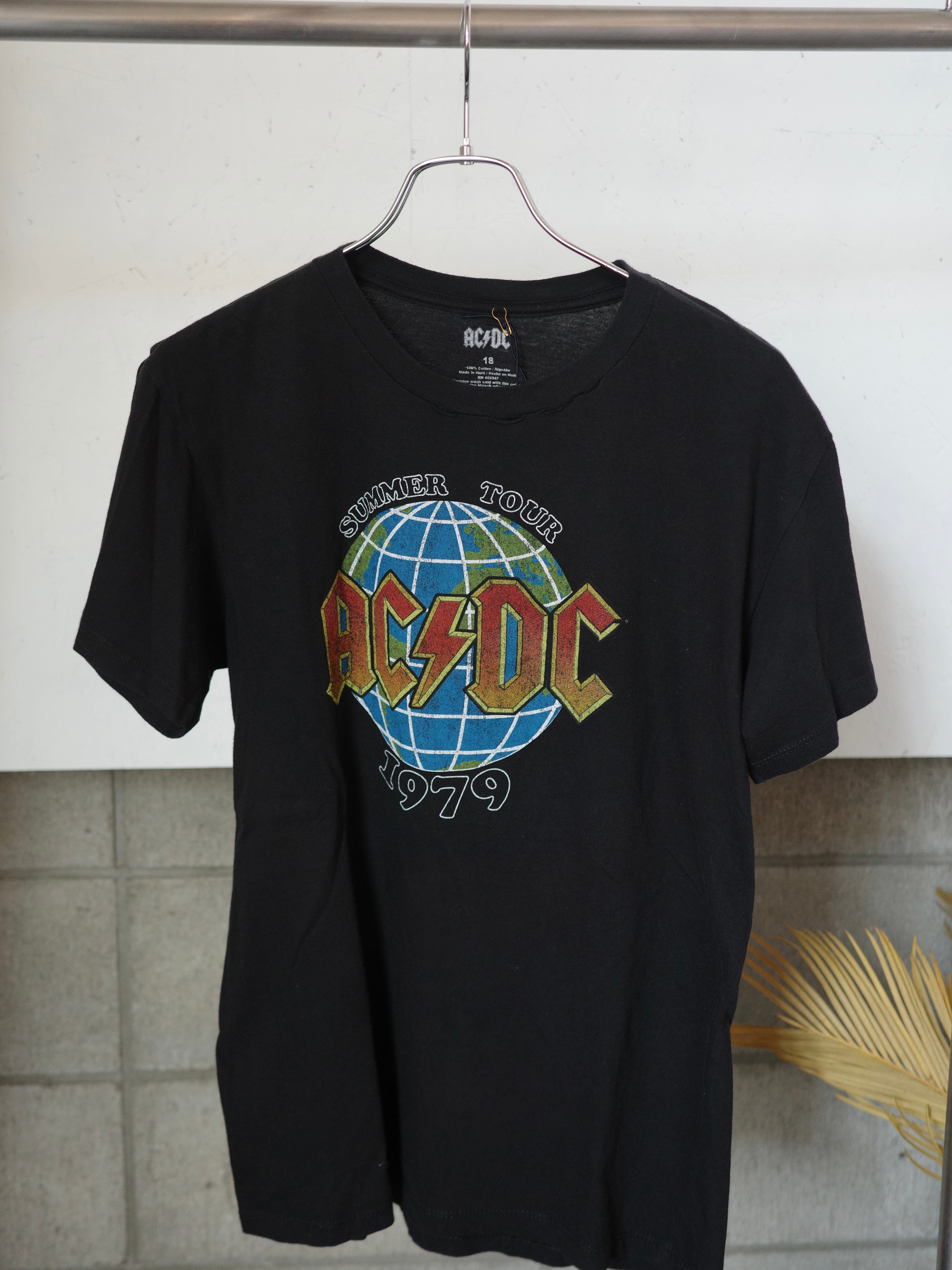 ACDCの1979年サマーツアーTシャツです。ブラックにカラープリントが映える一枚。首元に破れがありますが、このダメージもデザインとしてカッコよく着ていただけるかと思います。
