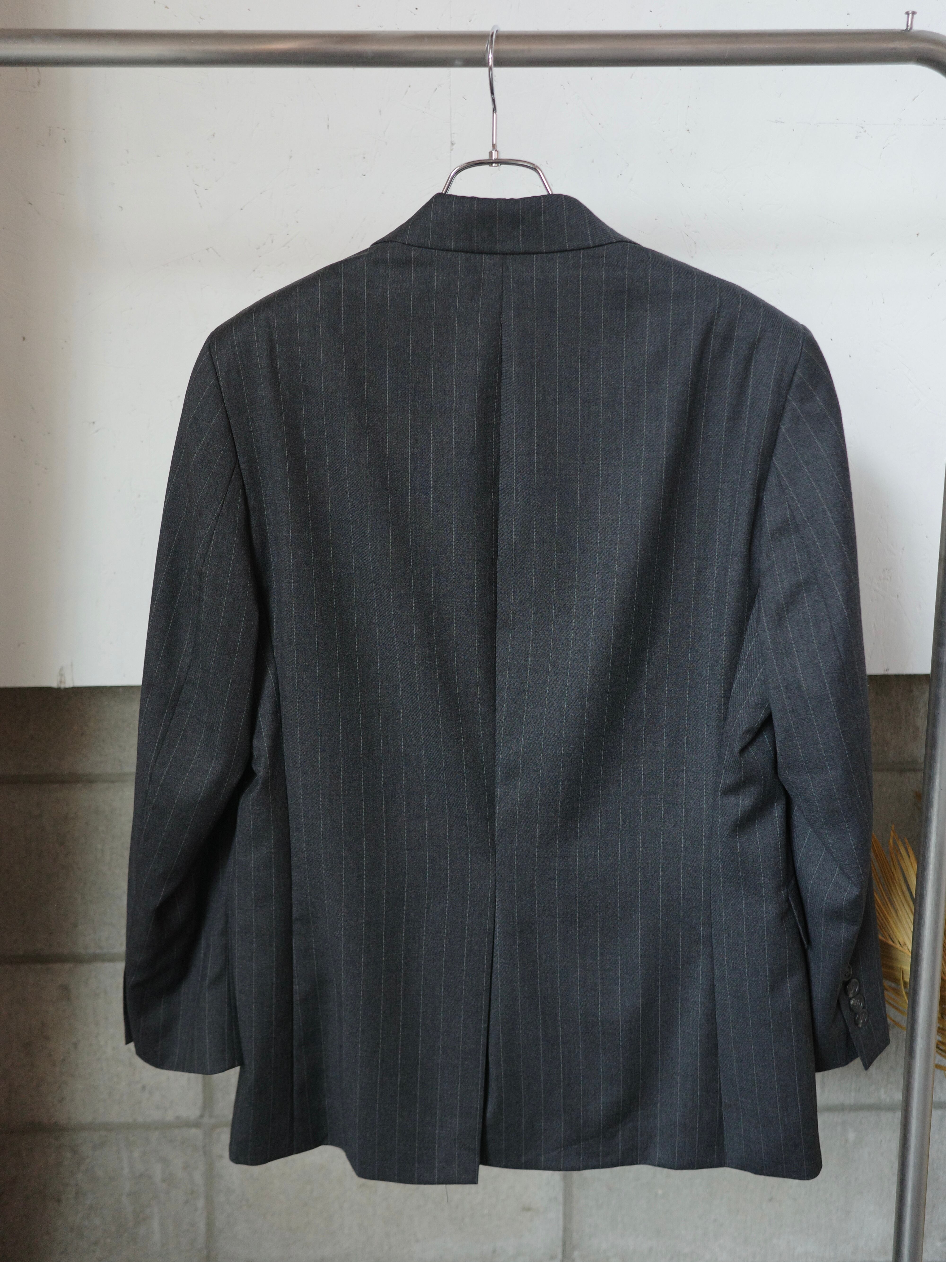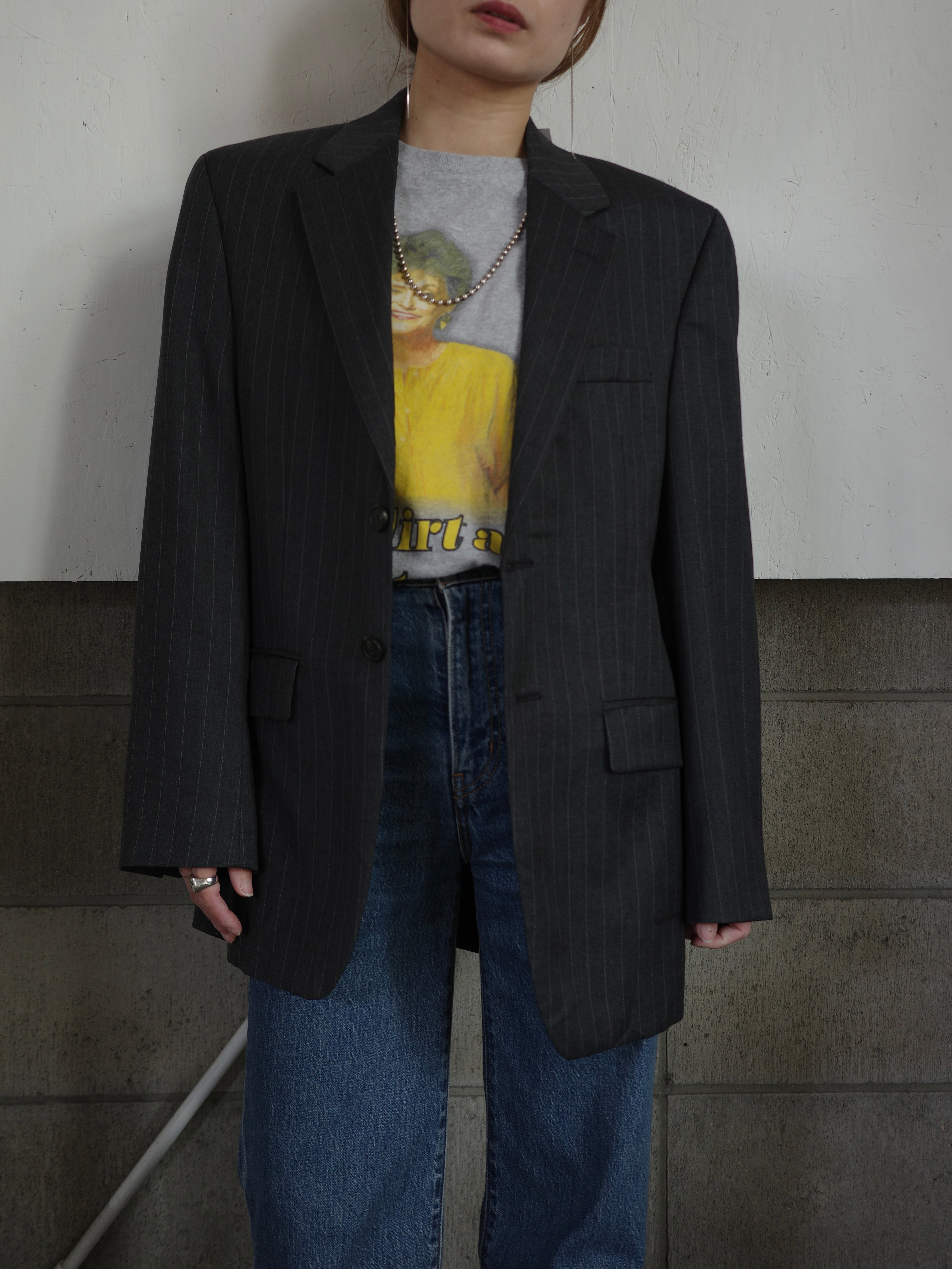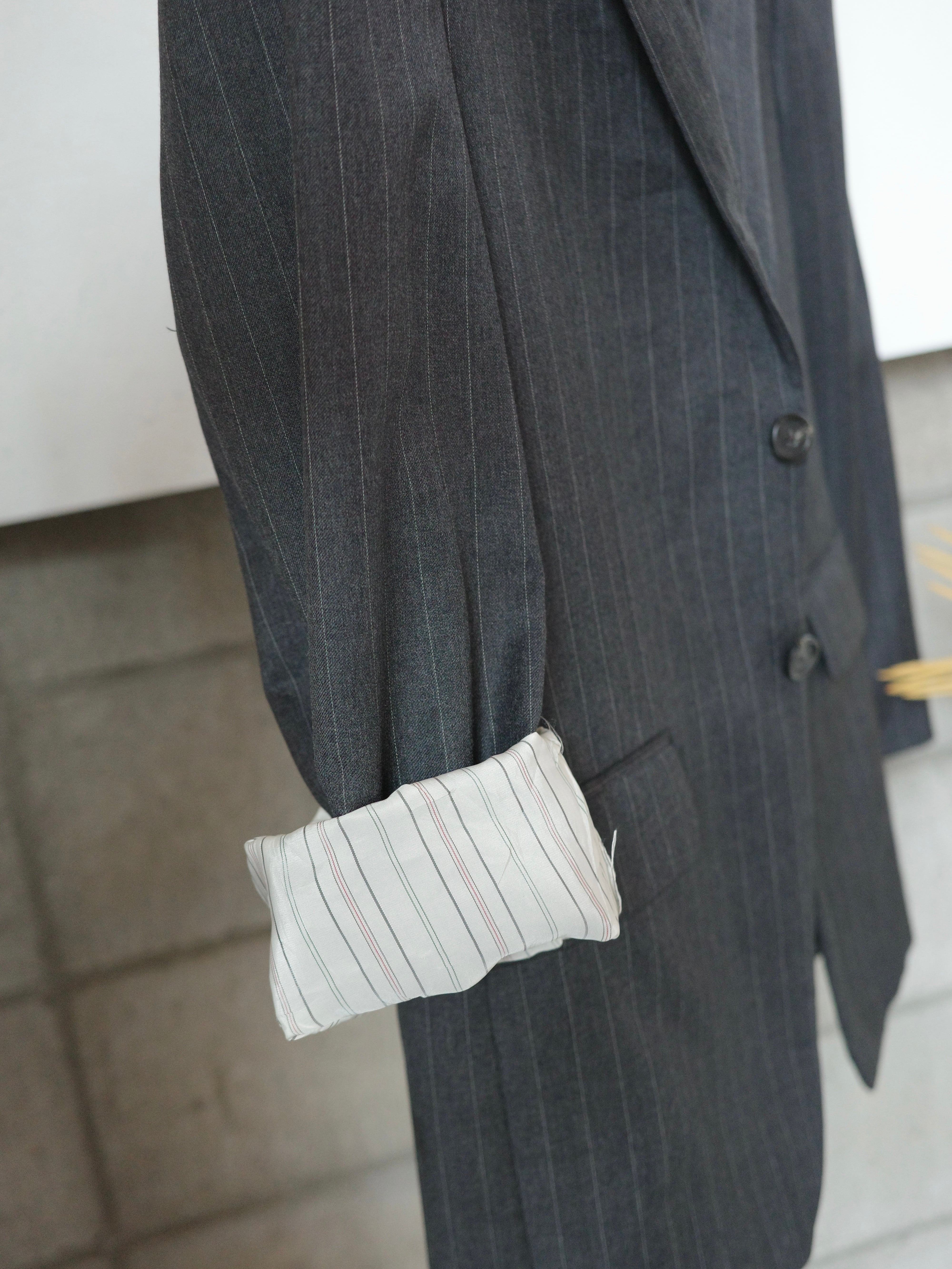 RalphLaurenのピンストライプジャケットです。通年きやすい素材感で、程よいオーバーサイズなシルエットになります。細くてさりげないピンストライプにチャコールグレーのカラーが大人で上品な印象になります。裏地も素敵なので袖をまくるのもおすすめです。