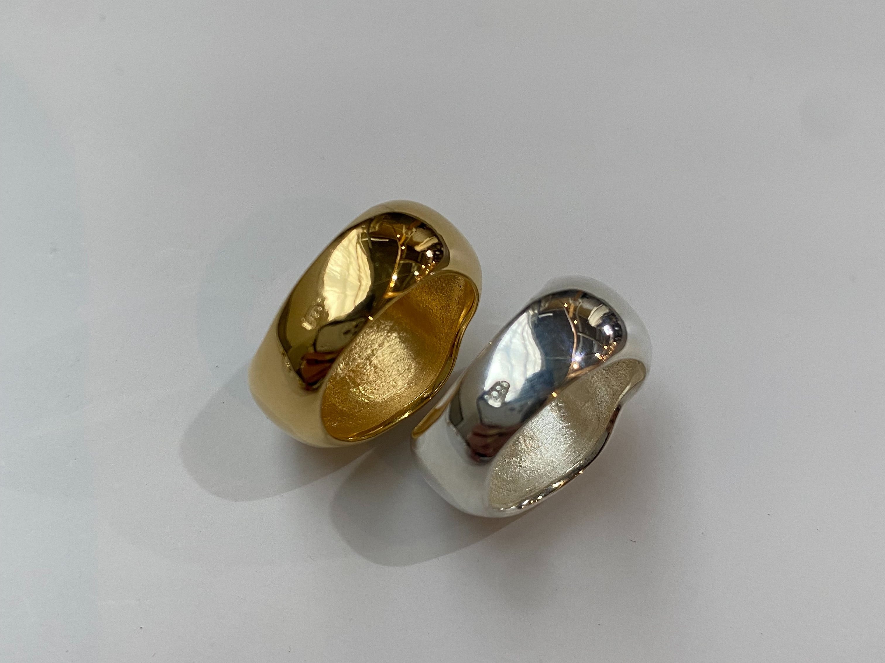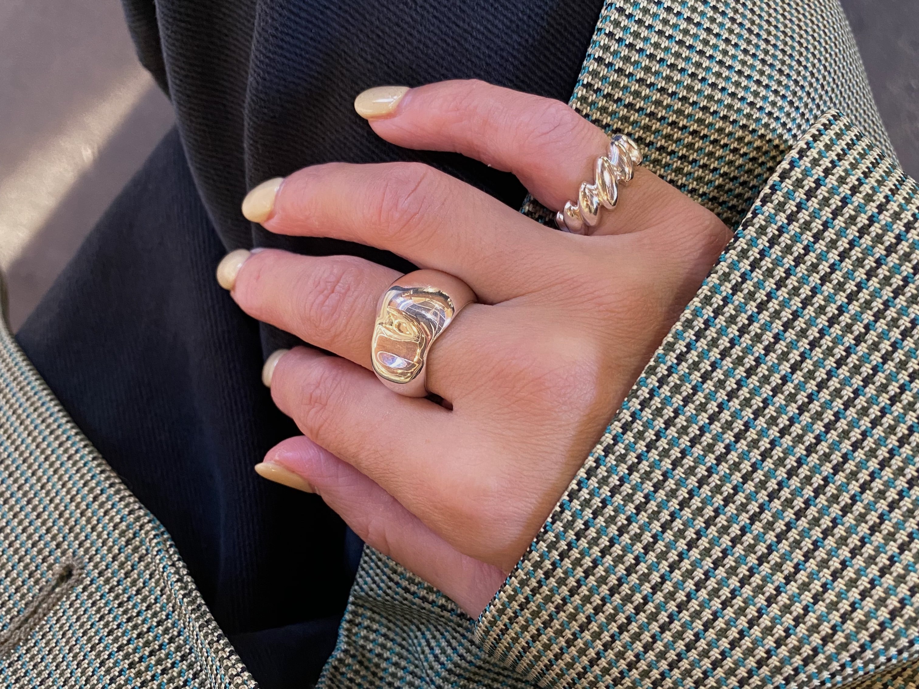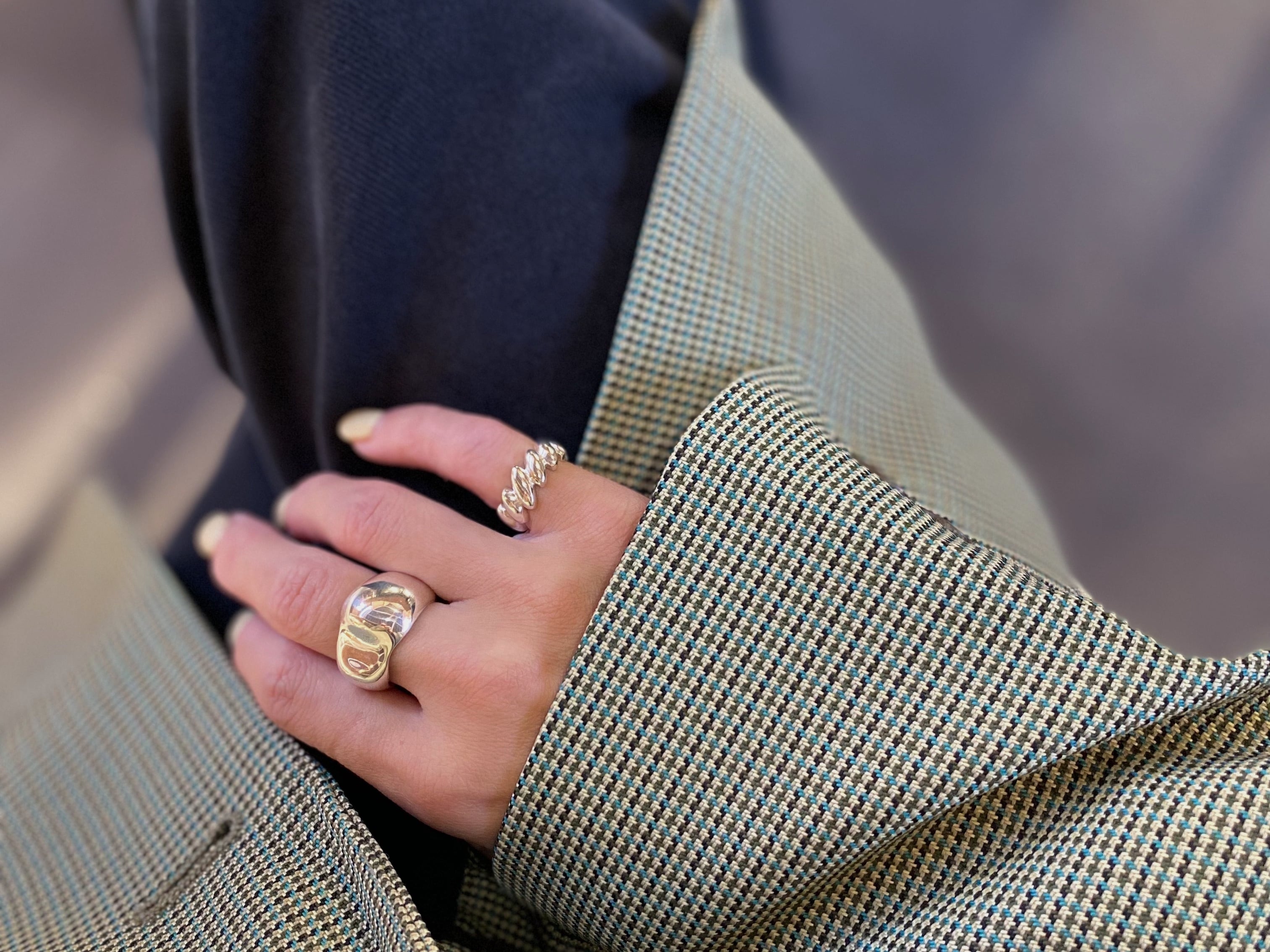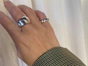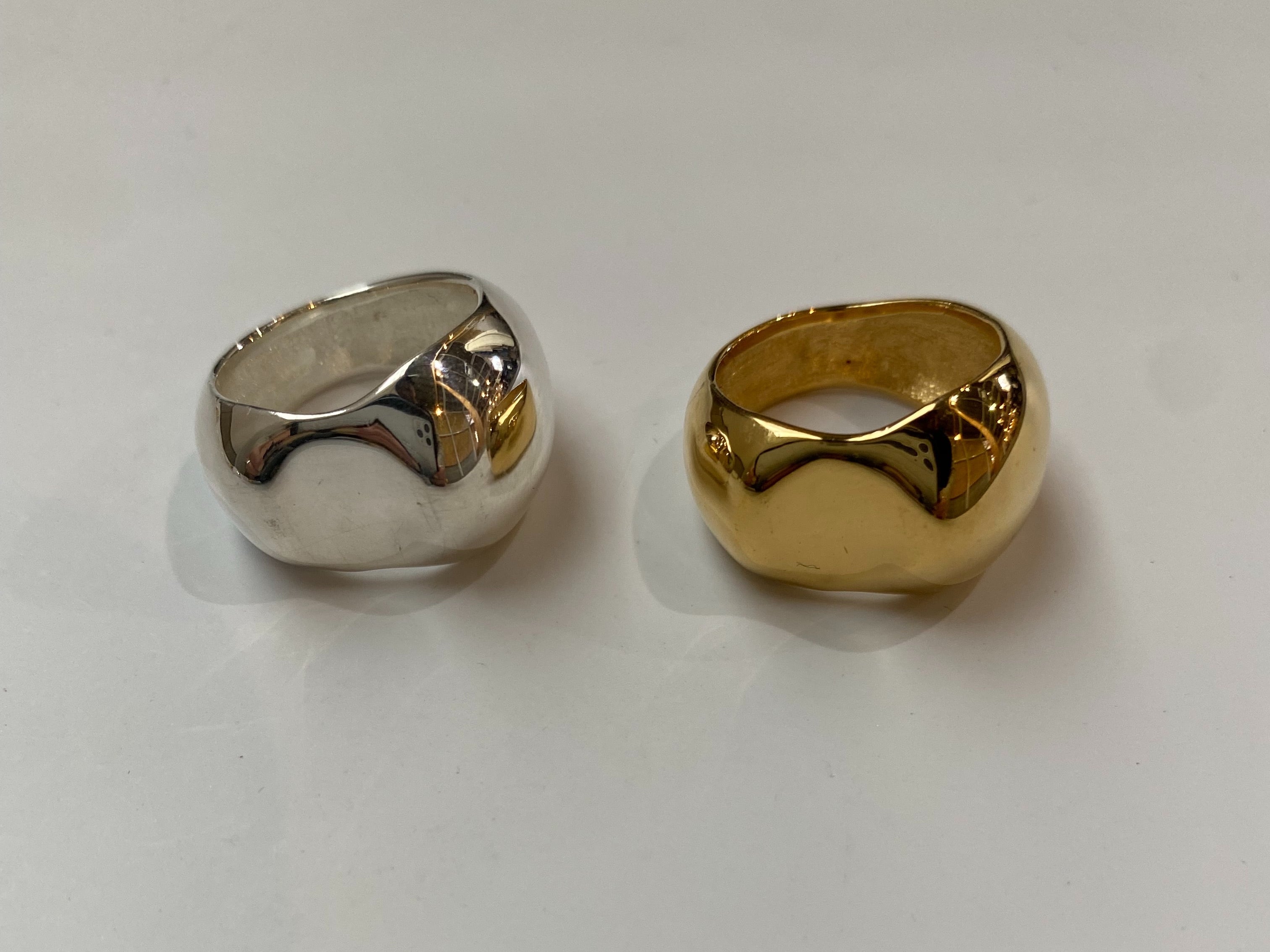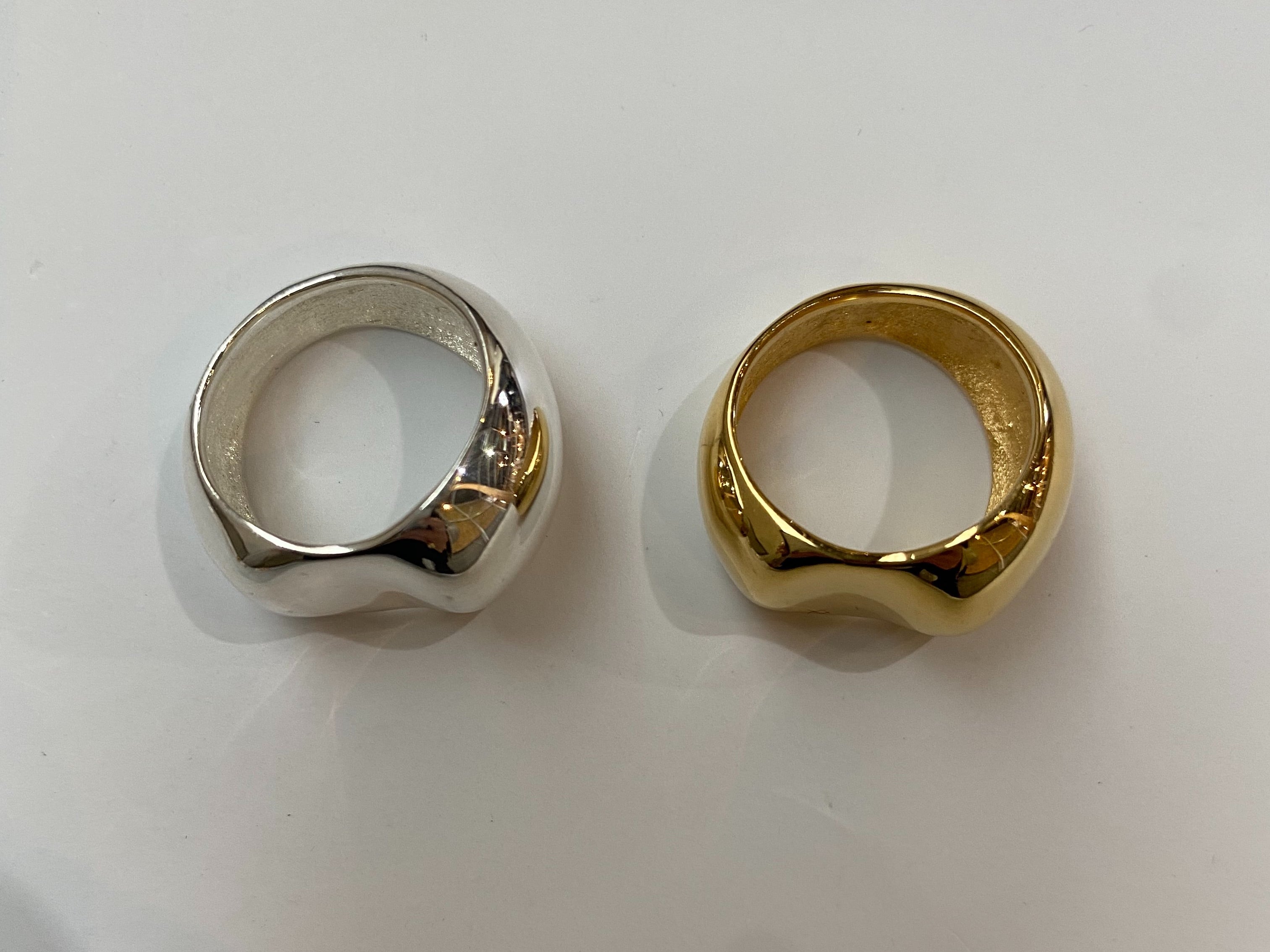 歪でボリューム感のあるデザインが特徴的なリングです。滑らかな曲線が指になじみやすく、存在感がありつつも合わせやすいデザインです。裏抜きしてあるので、見た目以上に軽いつけ心地です。