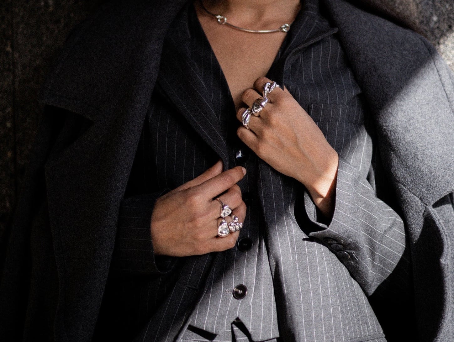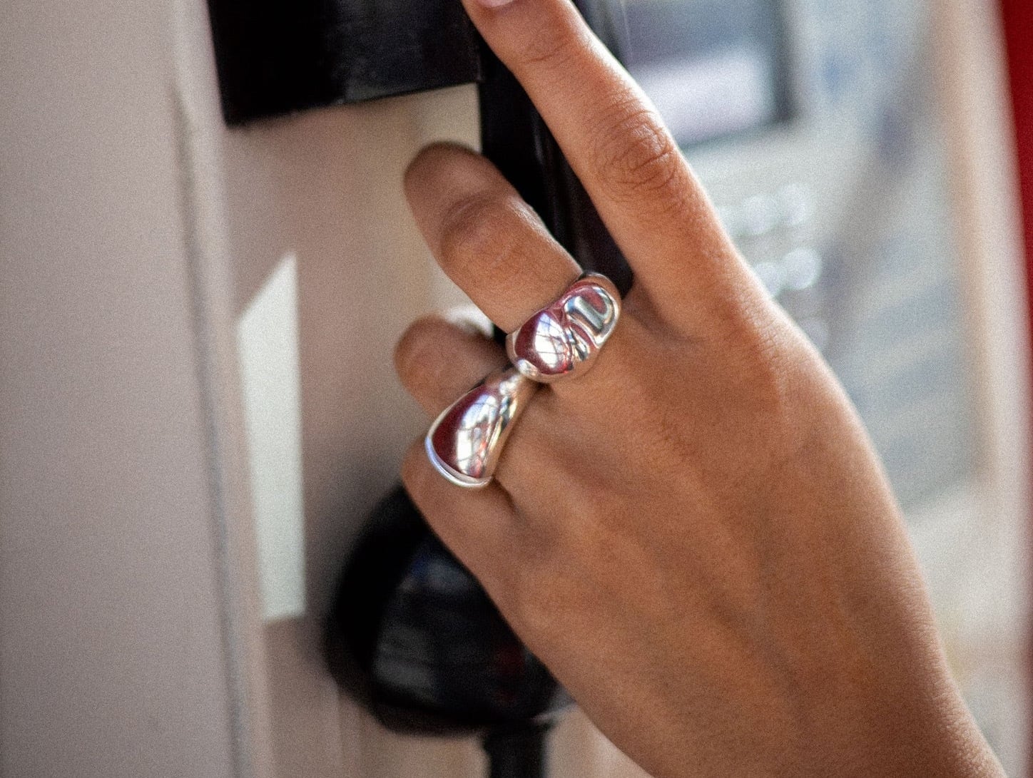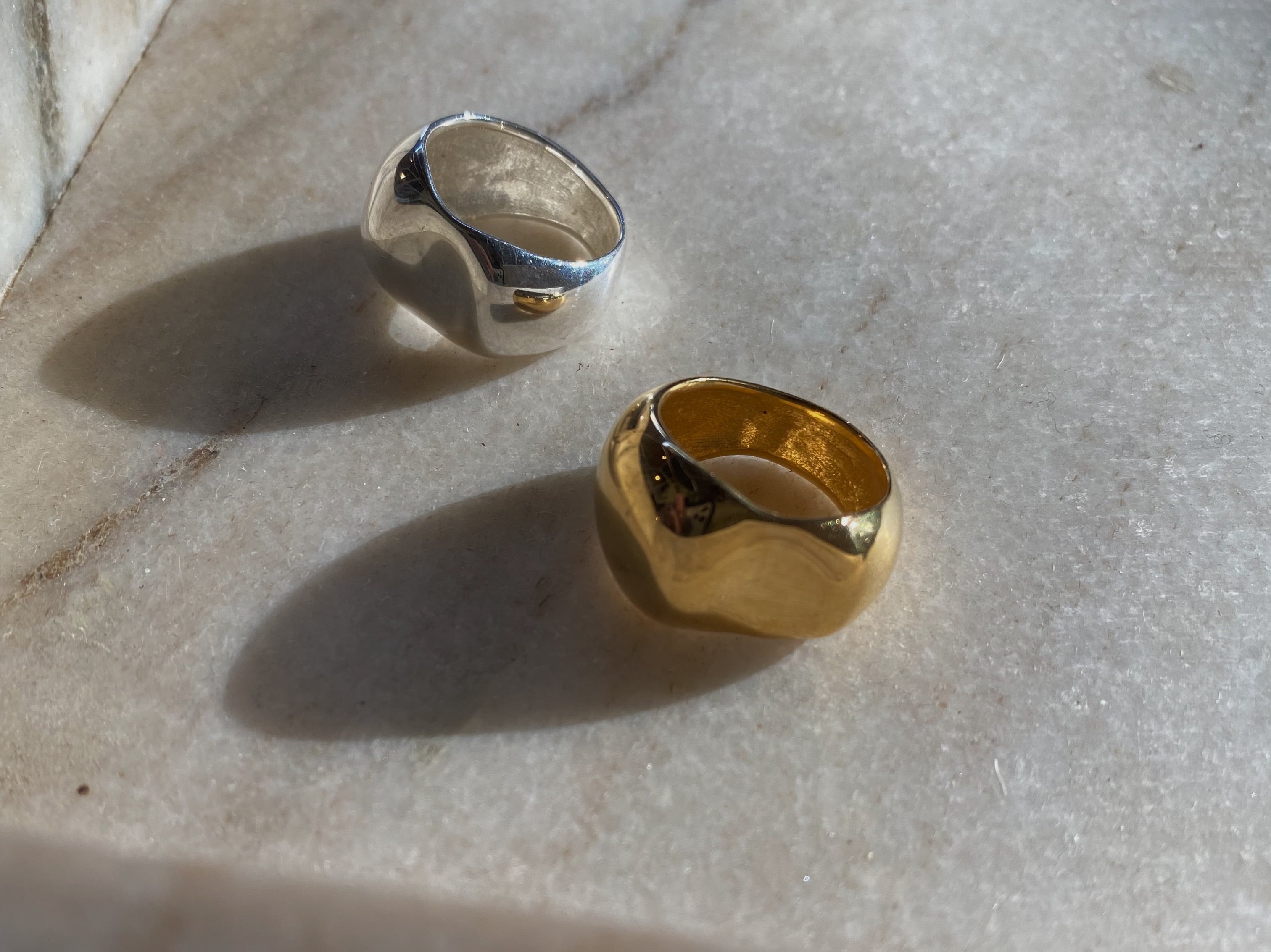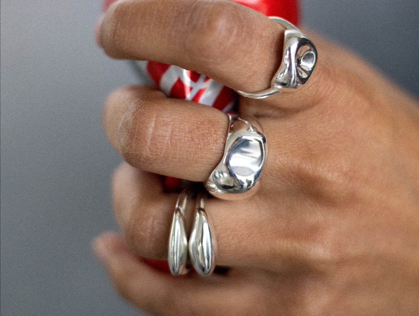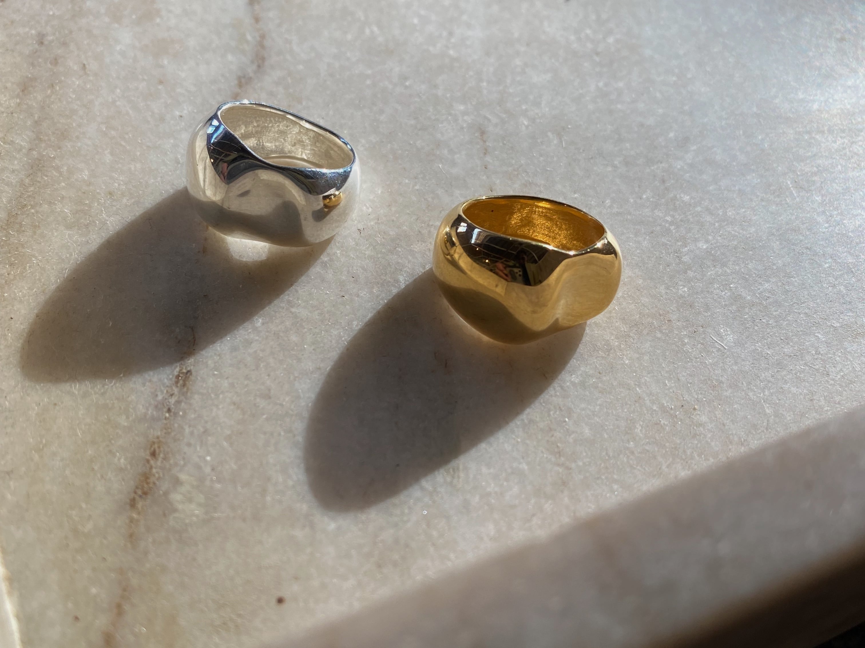 歪でボリューム感のあるデザインが特徴的なリングです。滑らかな曲線が指になじみやすく、存在感がありつつも合わせやすいデザインです。裏抜きしてあるので、見た目以上に軽いつけ心地です。