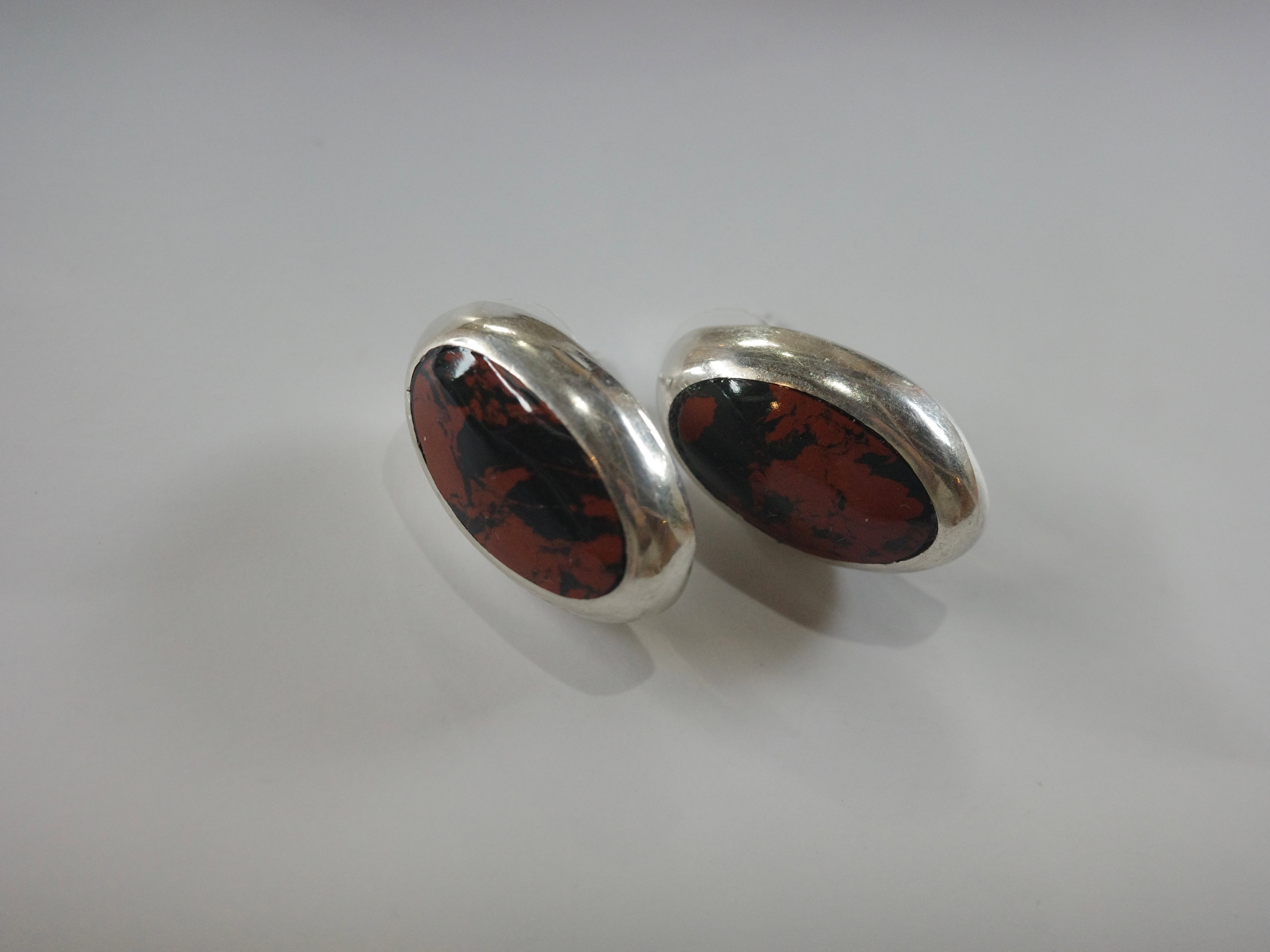 アメリカより仕入れたヴィンテージピアスです。マホガニーと言う天然石で、赤みのあるブラウンにされげなく模様も入ったシックな色合いが素敵です。メキシカンシルバーならではの重厚感があります。