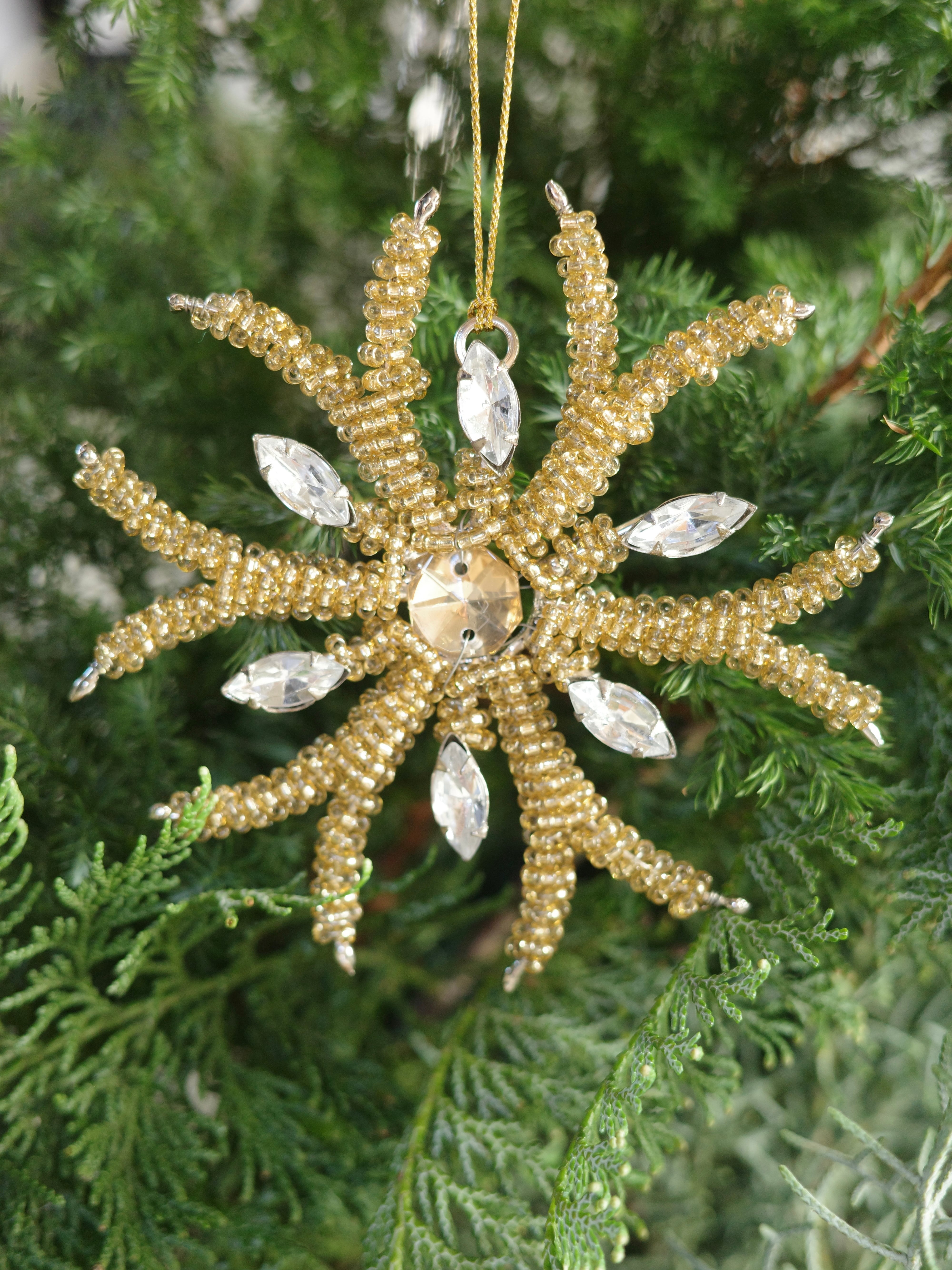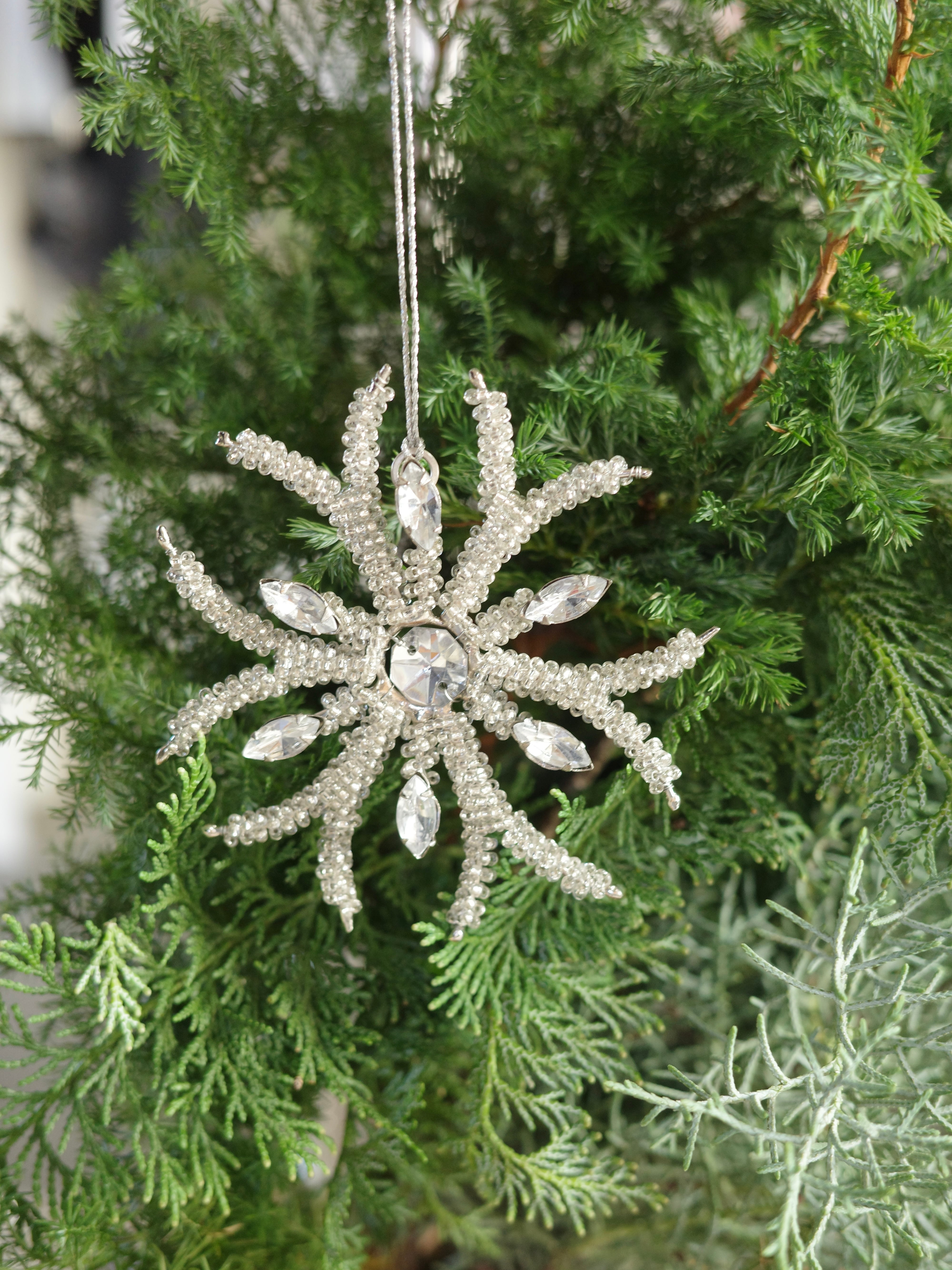 インドより仕入れたビーズオーナメントです。ワイヤーにビジューとビーズを巻きつけた、繊細でキラキラした雪の結晶のモチーフです。