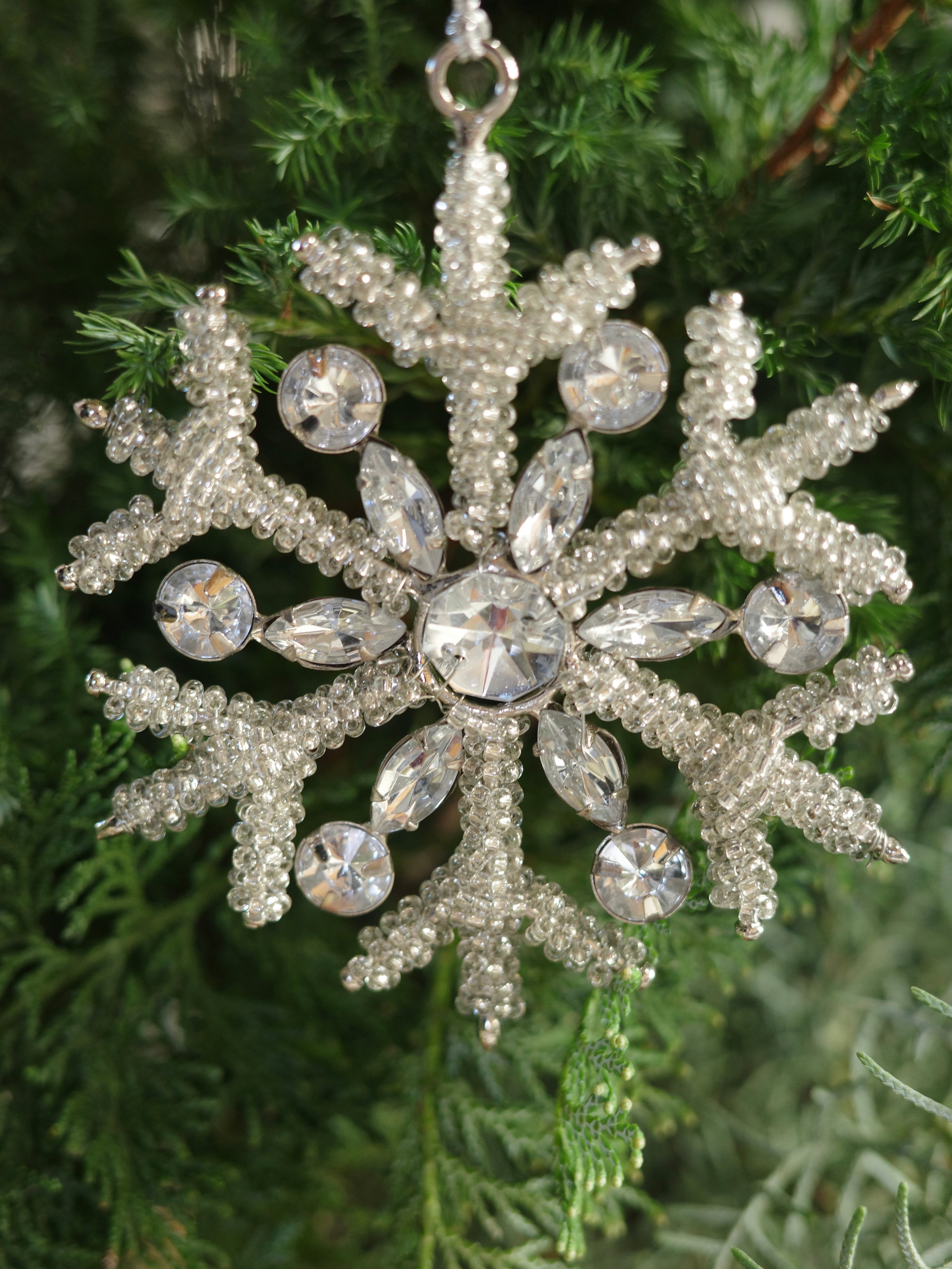 インドより仕入れたビーズオーナメントです。ワイヤーにビジューとビーズを巻きつけた、繊細でキラキラした雪の結晶のモチーフです。